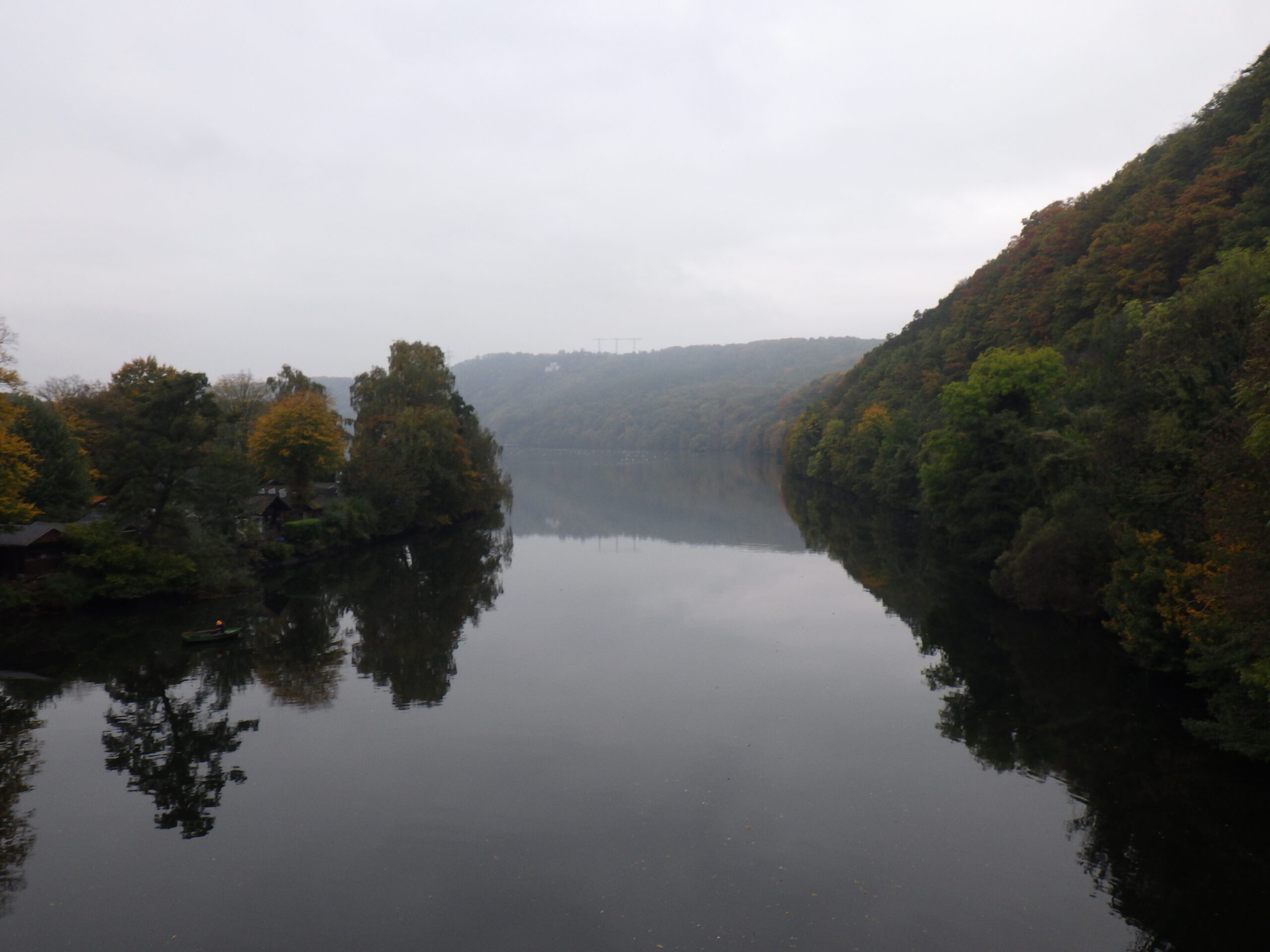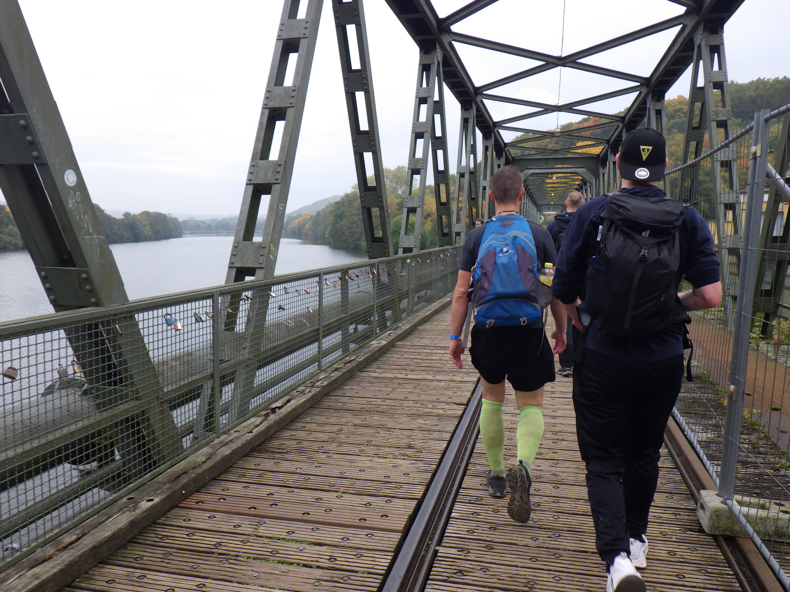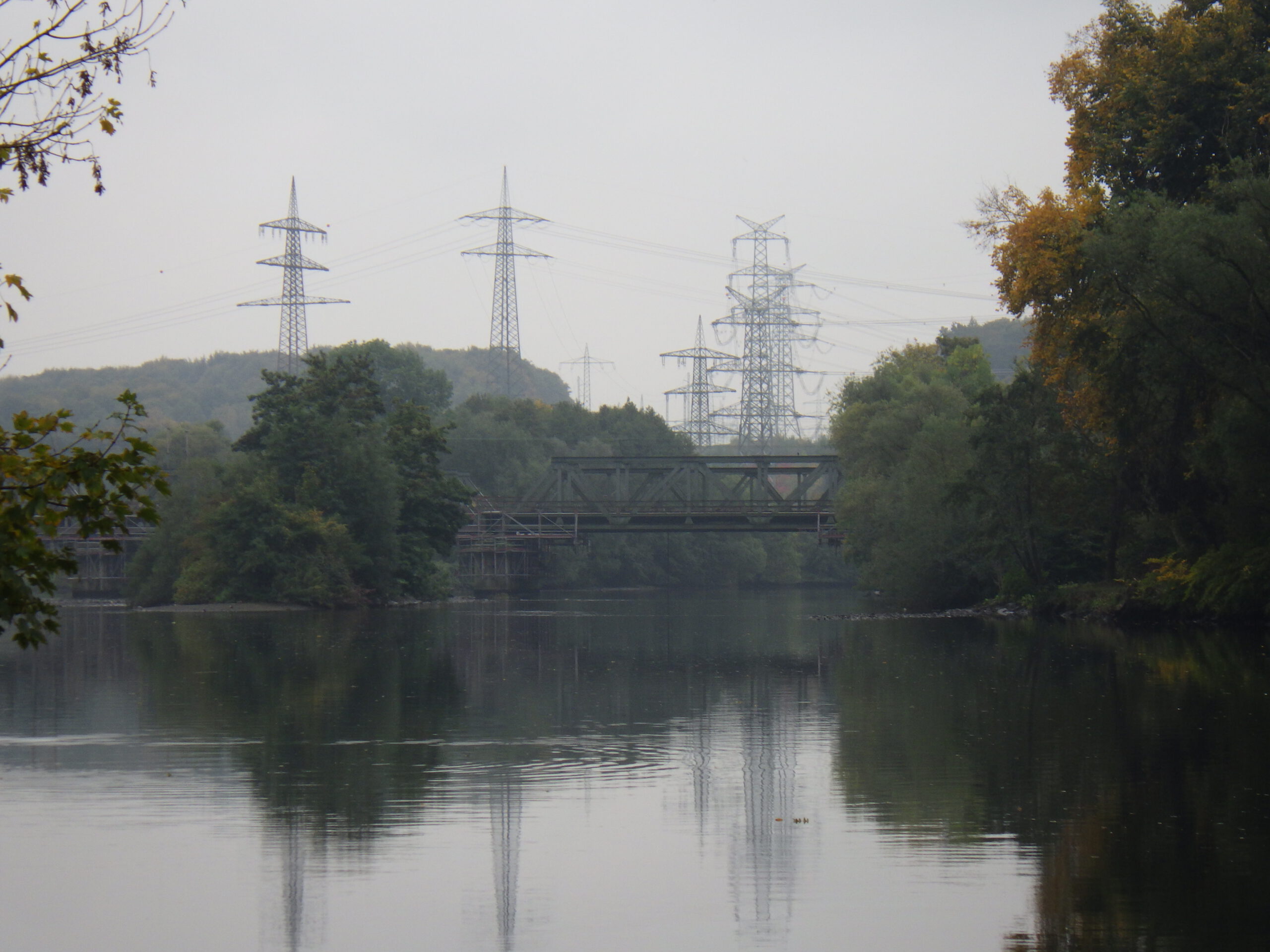 Von der Pausen-Bank aus, hatte ich einen nebelverträumten Ausblick auf den Hengsteysee mit Strommasten und alter Eisenbahnbrücke. Wenn nicht von beiden Seiten Wanderer gekommen wären, wäre das sehr idyllisch gewesen. Der See ist ein Stausee, der die Ruhr seit 1929 anstaut. Wir überquerten auf einer Brücke den See, die bereits während ihres Baus eingestürzt war. Schnell drüber. Dann ging es an der Südseite des Sees entlang. Inzwischen gab es einen ständigen Strom an entgegenkommenden 42ern.