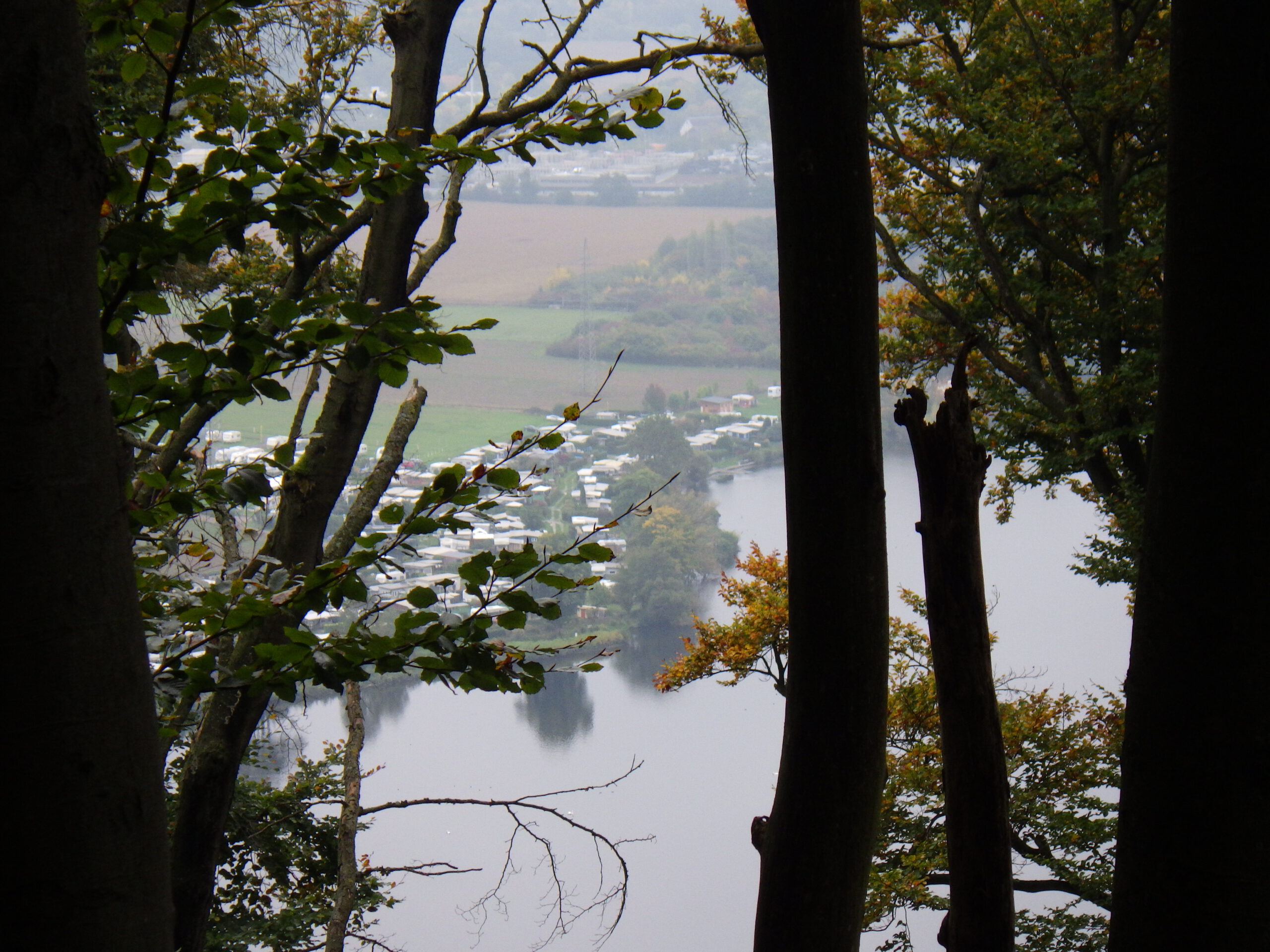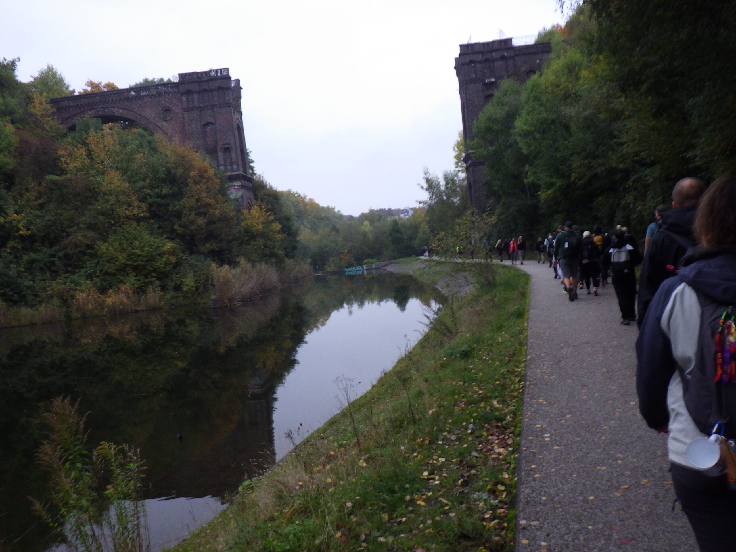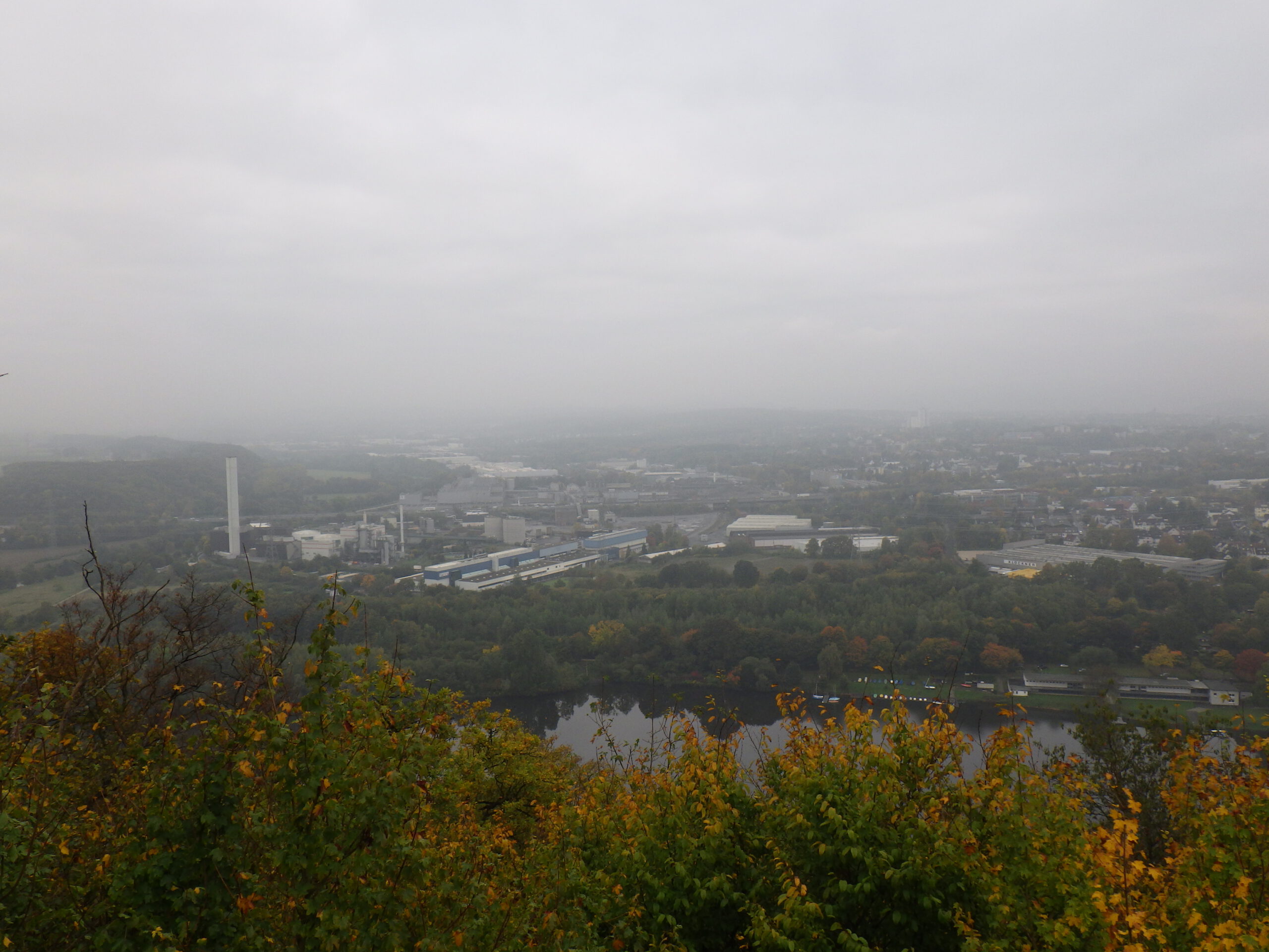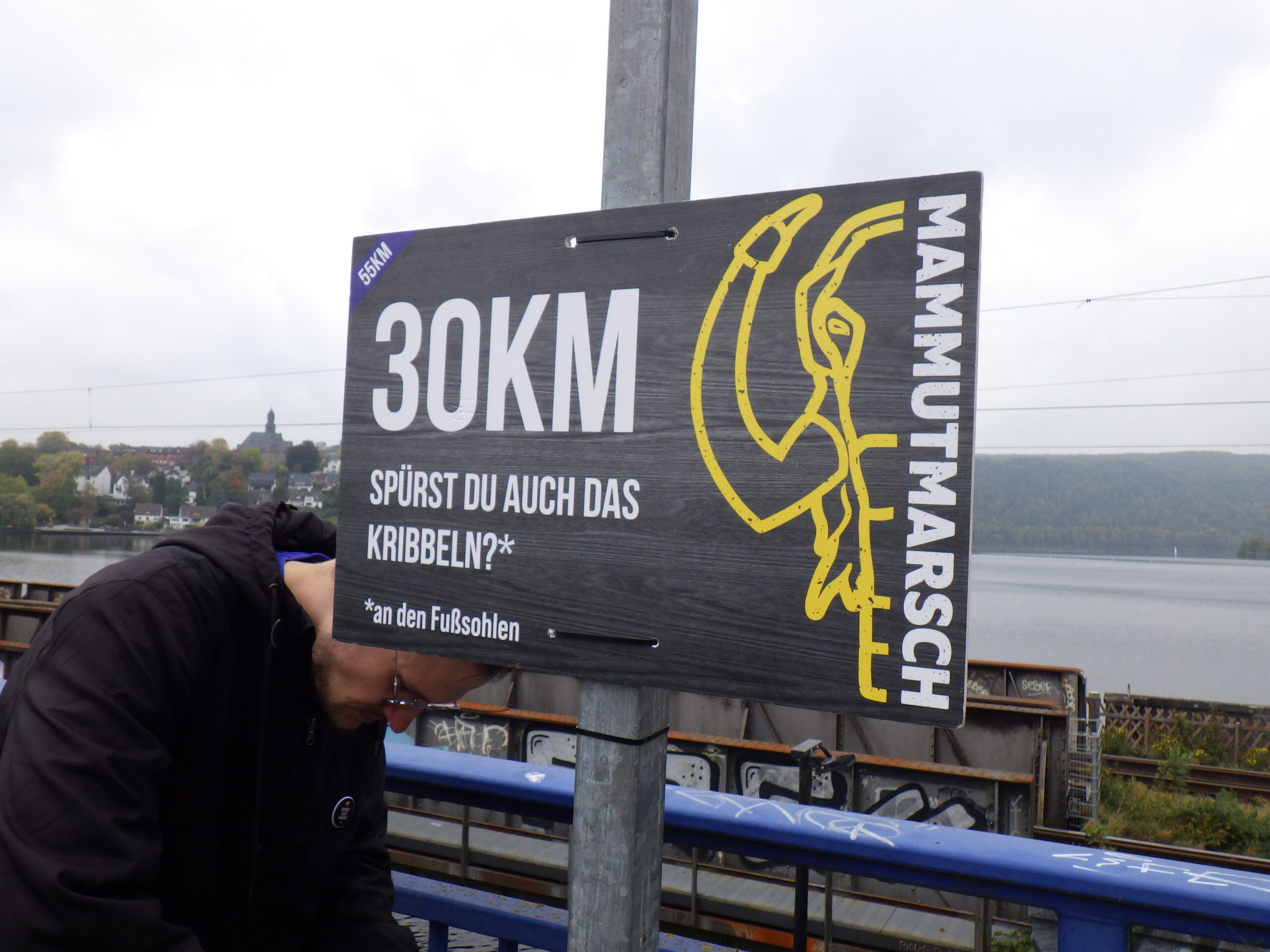 Von der Pausen-Bank aus, hatte ich einen nebelverträumten Ausblick auf den Hengsteysee mit Strommasten und alter Eisenbahnbrücke. Wenn nicht von beiden Seiten Wanderer gekommen wären, wäre das sehr idyllisch gewesen. Der See ist ein Stausee, der die Ruhr seit 1929 anstaut. Wir überquerten auf einer Brücke den See, die bereits während ihres Baus eingestürzt war. Schnell drüber. Dann ging es an der Südseite des Sees entlang. Inzwischen gab es einen ständigen Strom an entgegenkommenden 42ern.