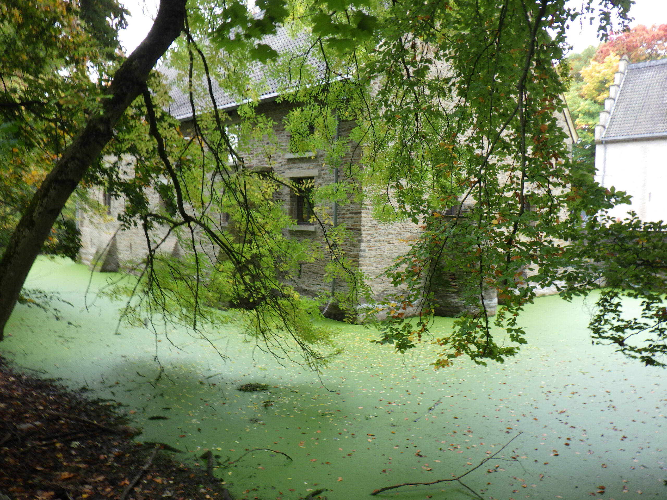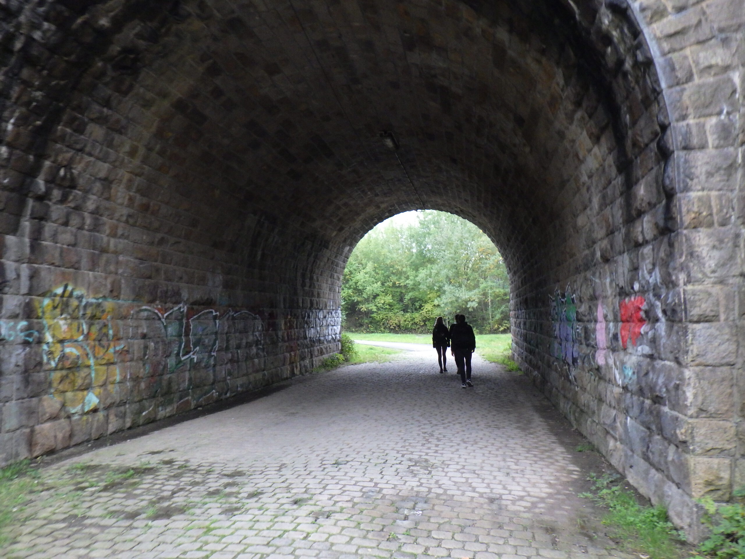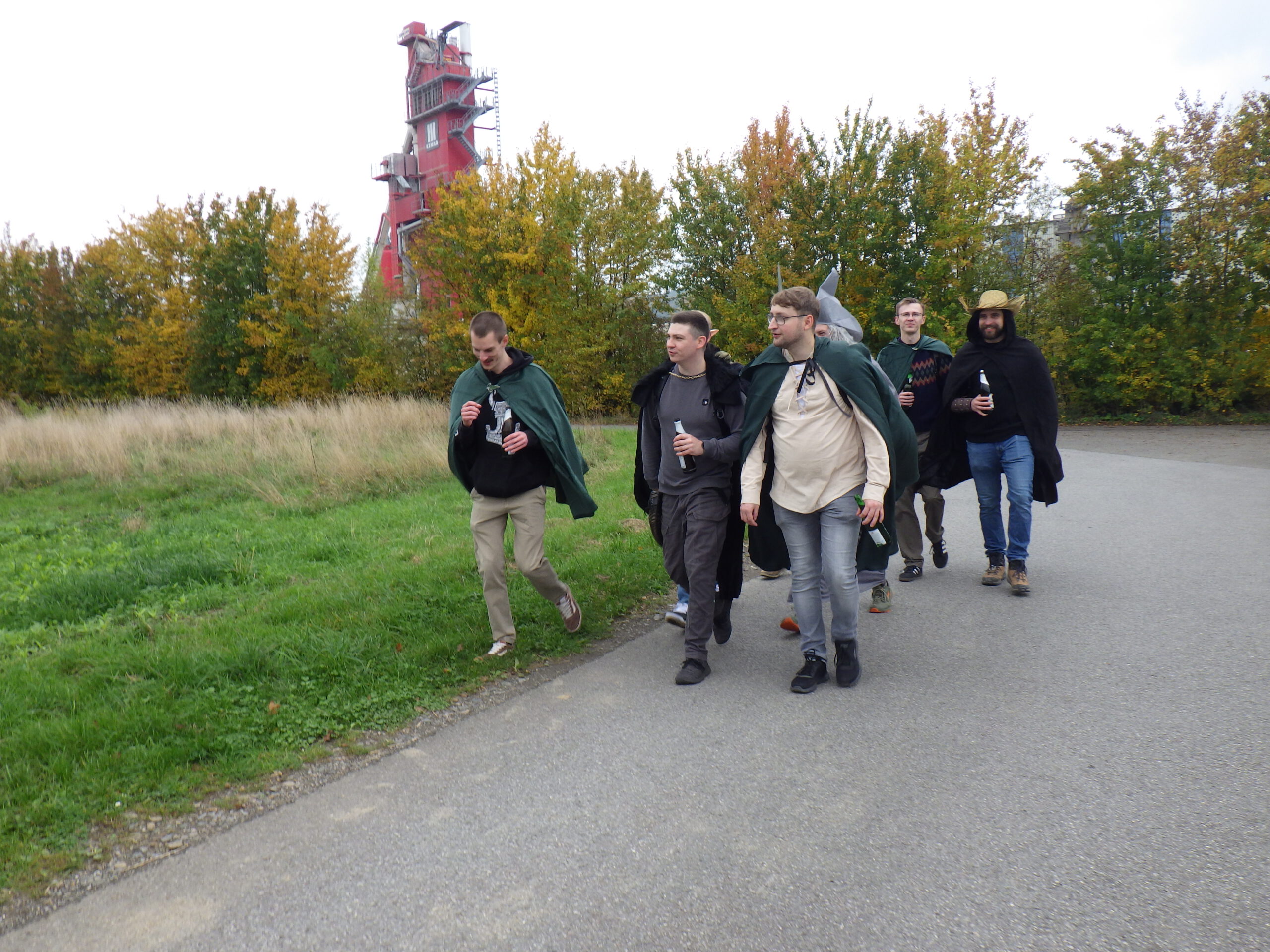 Beim nächsten Berg wäre ich dann auch fast liegen geblieben, als ich die Treppen sah. Es ging einmal um den Kaisberg herum. Am Ende wartete dann ein grünes Wasserschloss auf die Wanderer. Dann ging es mal quer übers Feld, wobei mir eine lustige Truppe mit grünen Mänteln entgegenkam. Vielleicht wollen sie irgendwo „Hoffmanns Erzählungen“ aufführen. Oder sich über grüne Bananen lustig machen. Dann folgte ein Tunnel mit interessantem Hall, zwei kleine Treppen und das 30-Kilometer-Schild.