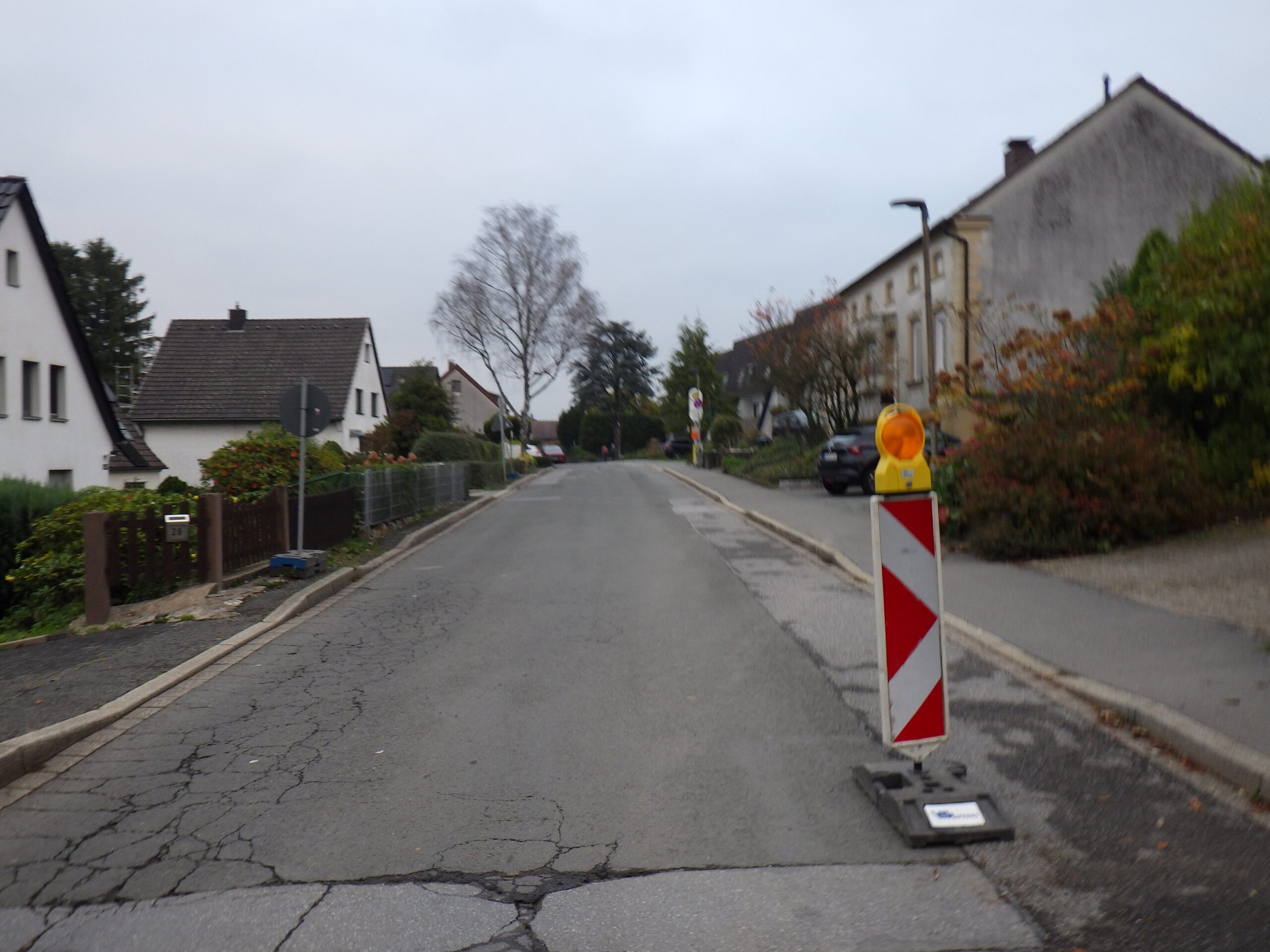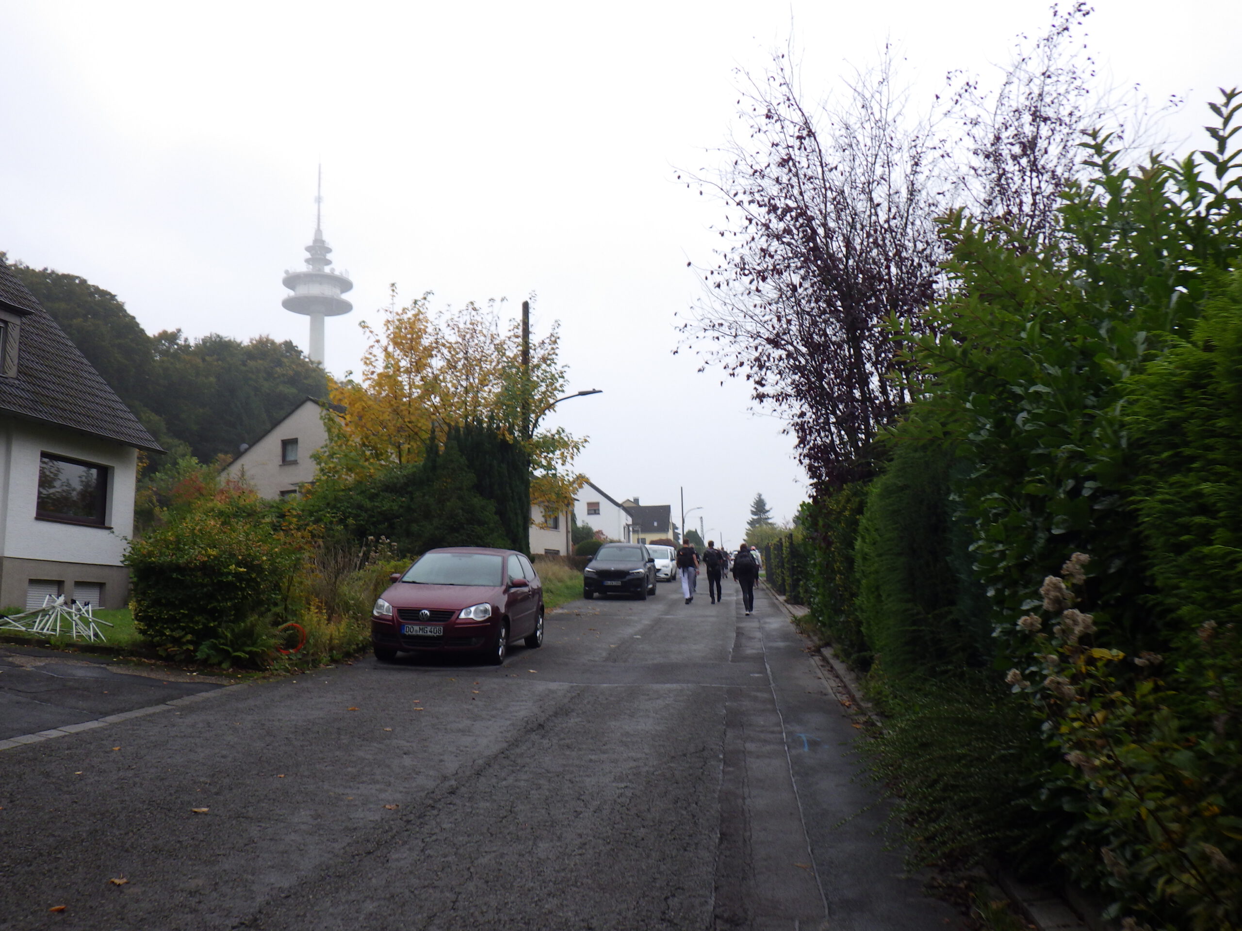 Das nächste Highlight war nicht zu sehen. Wir liefen über den Tunnel Berghofen der B236. Dann, ungefähr bei Kilometer 5, begann der erste Berg. Es ging hinauf nach Höchsten (treffender Name). Auf dem Weg lugte ein Fernmeldeturm aus dem Schwerter Wald und zwei kleine Jungs verkauften an der Straßenecke Kaffee. Ich überlegte die ganze Zeit, ob es richtig war Schirm und Regenjacke einzupacken. Nun, es regnete den ganzen Tag nicht, aber es war ein bisschen diesig. Dann folgte auch schon das 10-Kilometer-Schild und der erste VP. Ich nahm mir zwei Schokoriegelchen und eine Käseschnitte und es ging weiter.