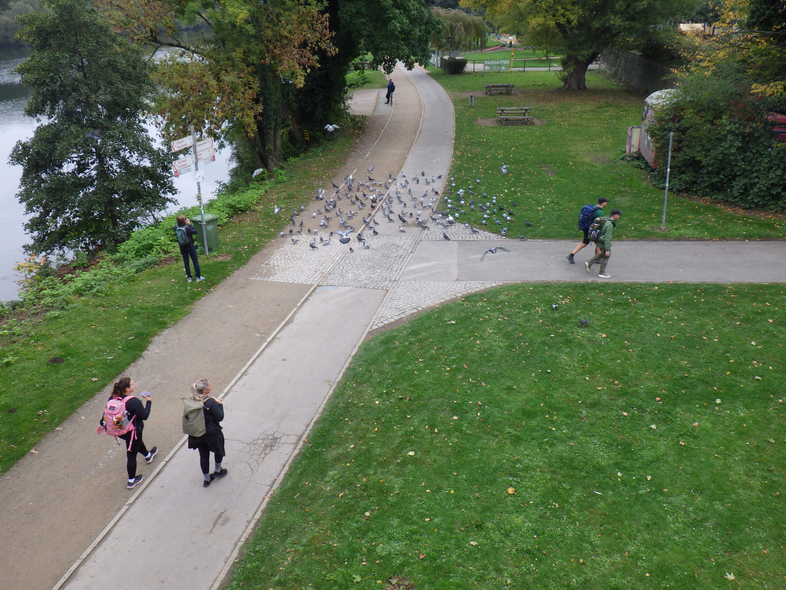 Nun wurde wieder die Ruhr überquert. Am Brückenfundament war ein Schwarm Tauben, die sich durch nichts beeindrucken liessen: Wanderer, Wanderer mit Hunden in zwei Meter Abstand, Pfiffe, Hände klatschen. Keine Reaktion. Als ich dann oben auf der Brücke stand, flog der Taubenschwarm plötzlich aufgeregt zur anderen Seite. Sie überflogen dabei die Fahrbahn und ein junges Täubchen kollidierte leider mit einem Auto. Die Taube blieb tot auf der Fahrbahn liegen.