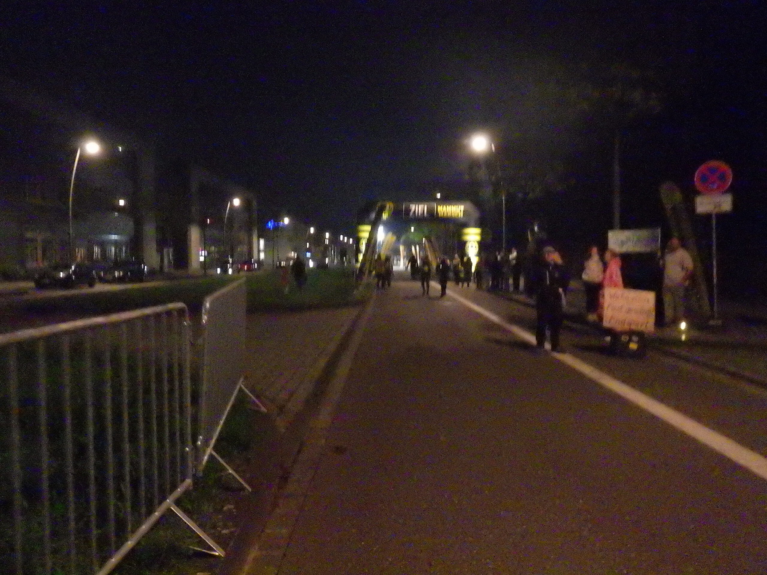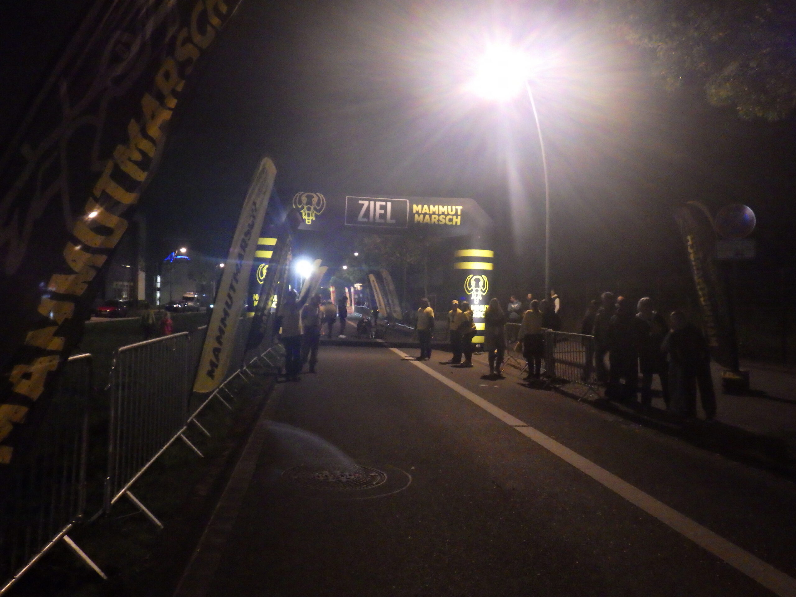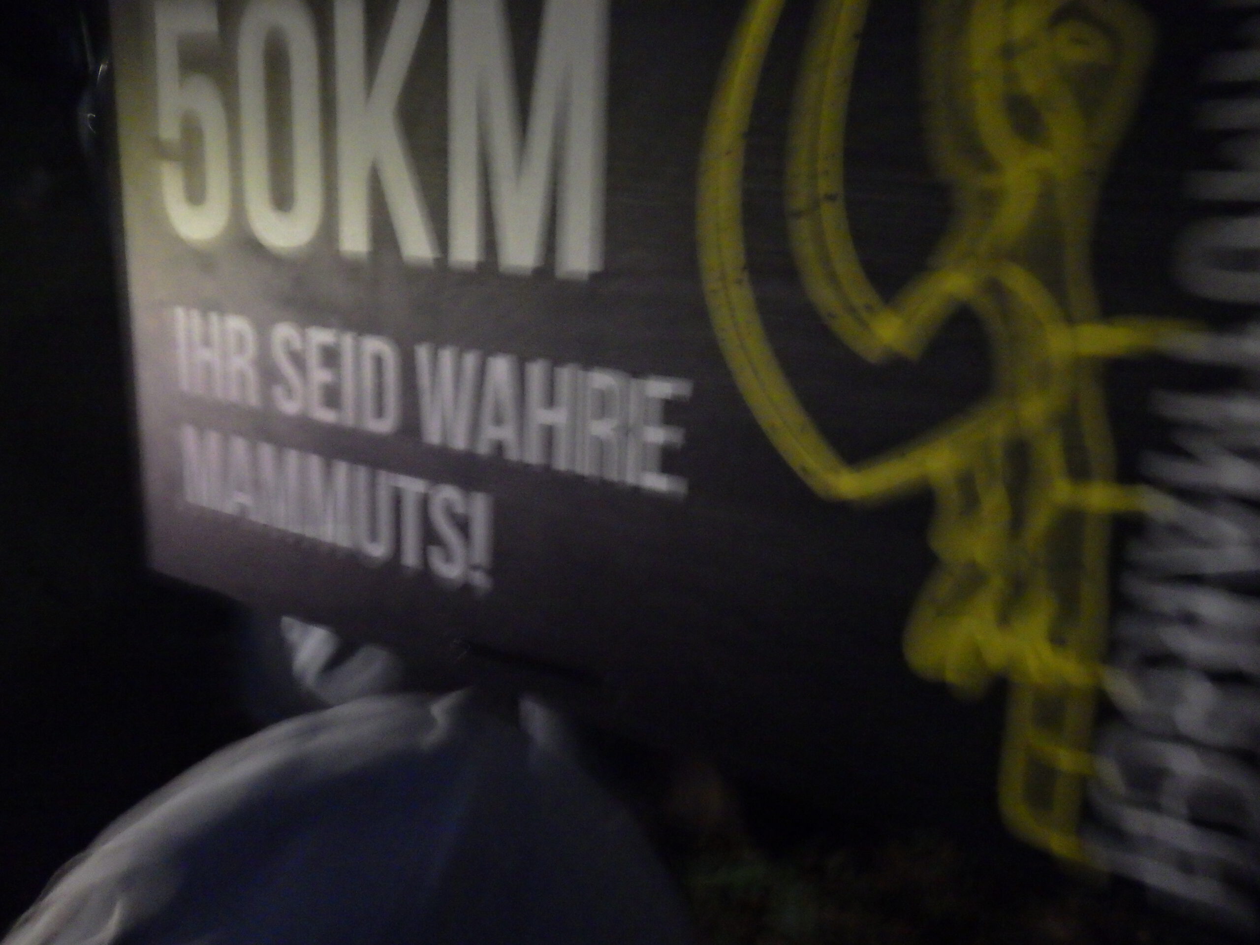 Nach dem allerletzten Berg ging es nur noch abwärts und ich beschleunigte nochmal ordentlich. 50 Kilometer-Schild im Licht der Stirnlampen der Mitwanderer. Die letzten Kilometer versuchte ich nochmal auf 6 km/h zu kommen. Bei einem kleinen Anstieg am Ende der Strecke musste ich aber nochmal eine kleine Pause machen. Dann nochmal Treppe und Brücke und die letzte Gerade zum Ziel. Zieleinlauf mit 11 Stunden und 37 Minuten, also 4,6 km/h. In Bewegung: 10 Stunden und 25 Minuten mit 5,2 km/h. Komoot meint, die Strecke habe 53,7 Kilometer gehabt. Komoot meinte auch, meine schnellste Geschwindigkeit sei 8,9 km/h gewesen. Die App wird auch immer wunderlicher.