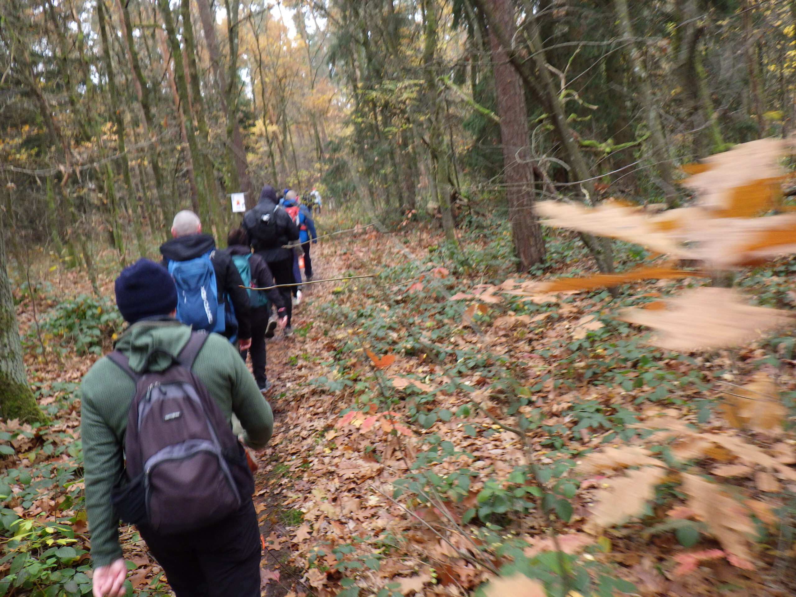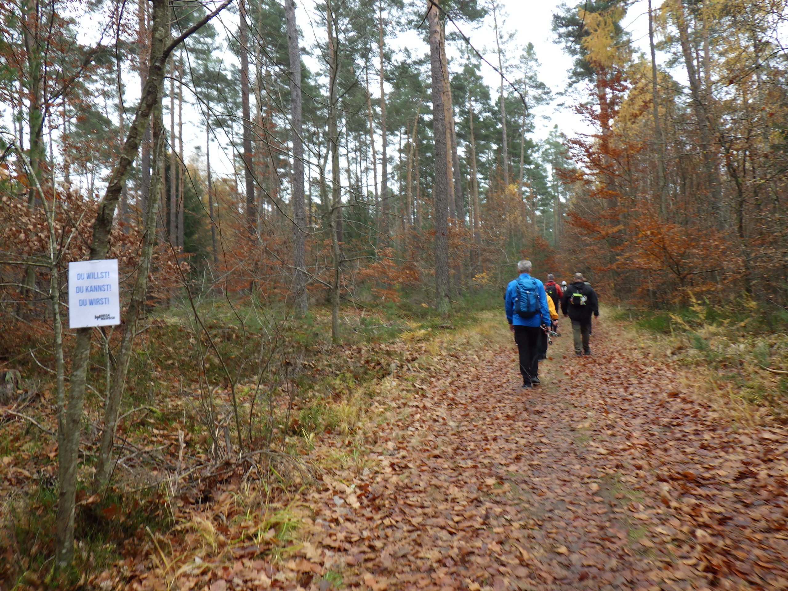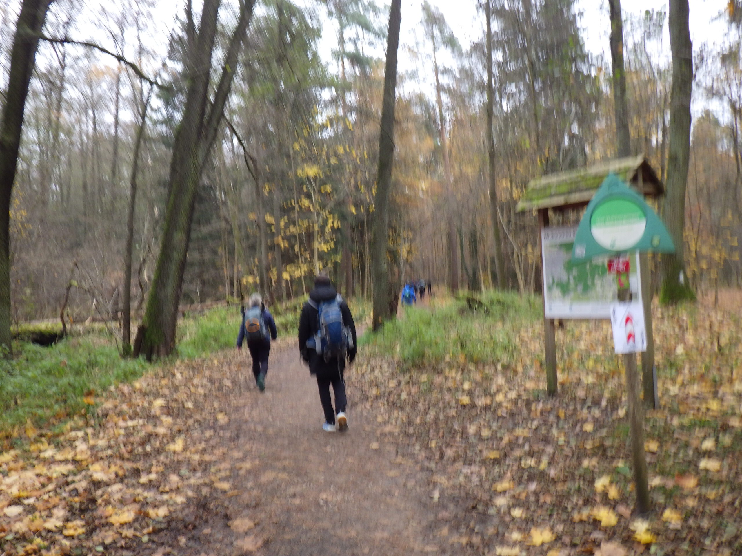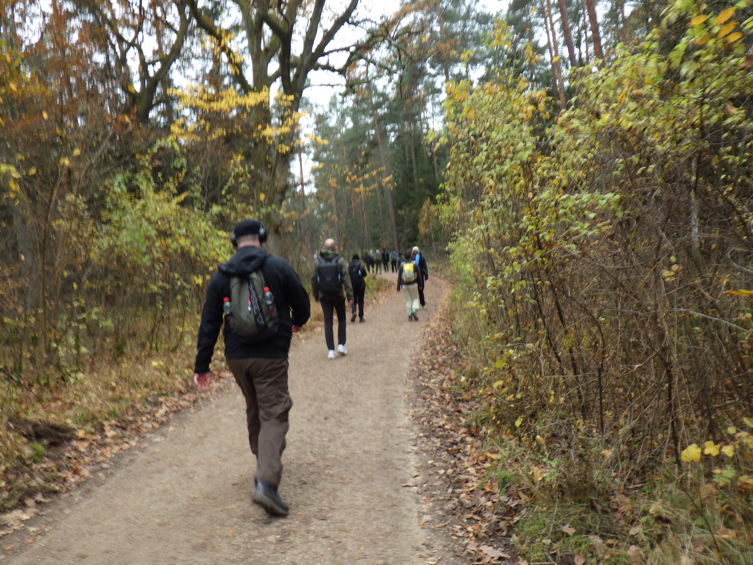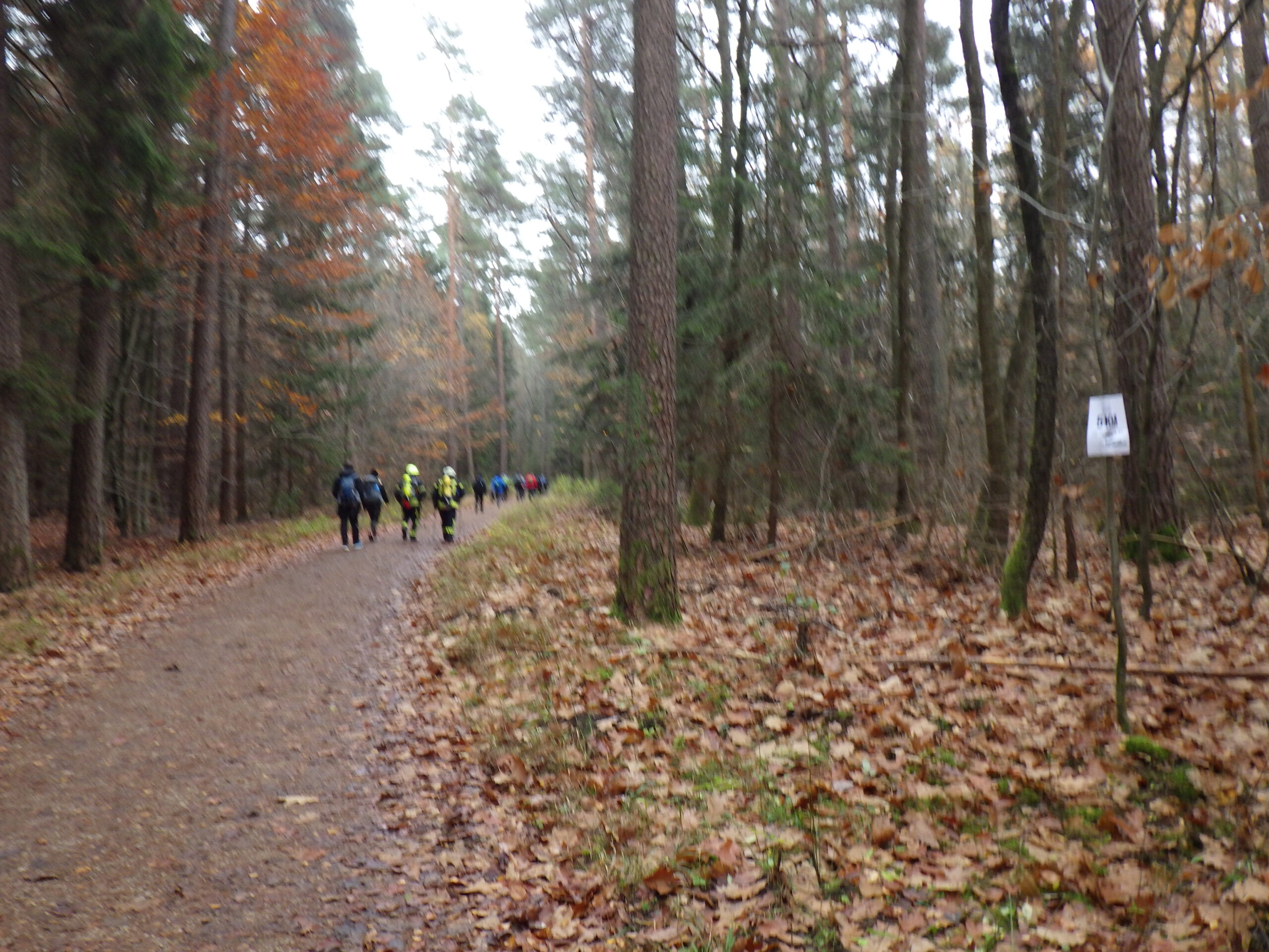 Ich zog noch den mitgebrachten Extra-Pullover an, da es nur 4°C waren und startete 5 Minuten eher, also 9:25 Uhr, da die vorherige Startgruppe nicht voll wurde. Die ersten zehn Kilometer waren ziemlich schnell. Es wurde zwischen 5 und 7 km/h gelaufen. Nach eineinhalb Kilometern ging es direkt in den Wald. Der Reichswald um Nürnberg ist ein im Nord- und Südosten Nürnbergs gelegenes Kulturwaldgebiet und gehörte früher direkt und unmittelbar dem Kaiser. Er gilt als ältester und erster Kunstforst der Welt. Er sieht heute nicht wirklich nach Baum-Plantage aus.