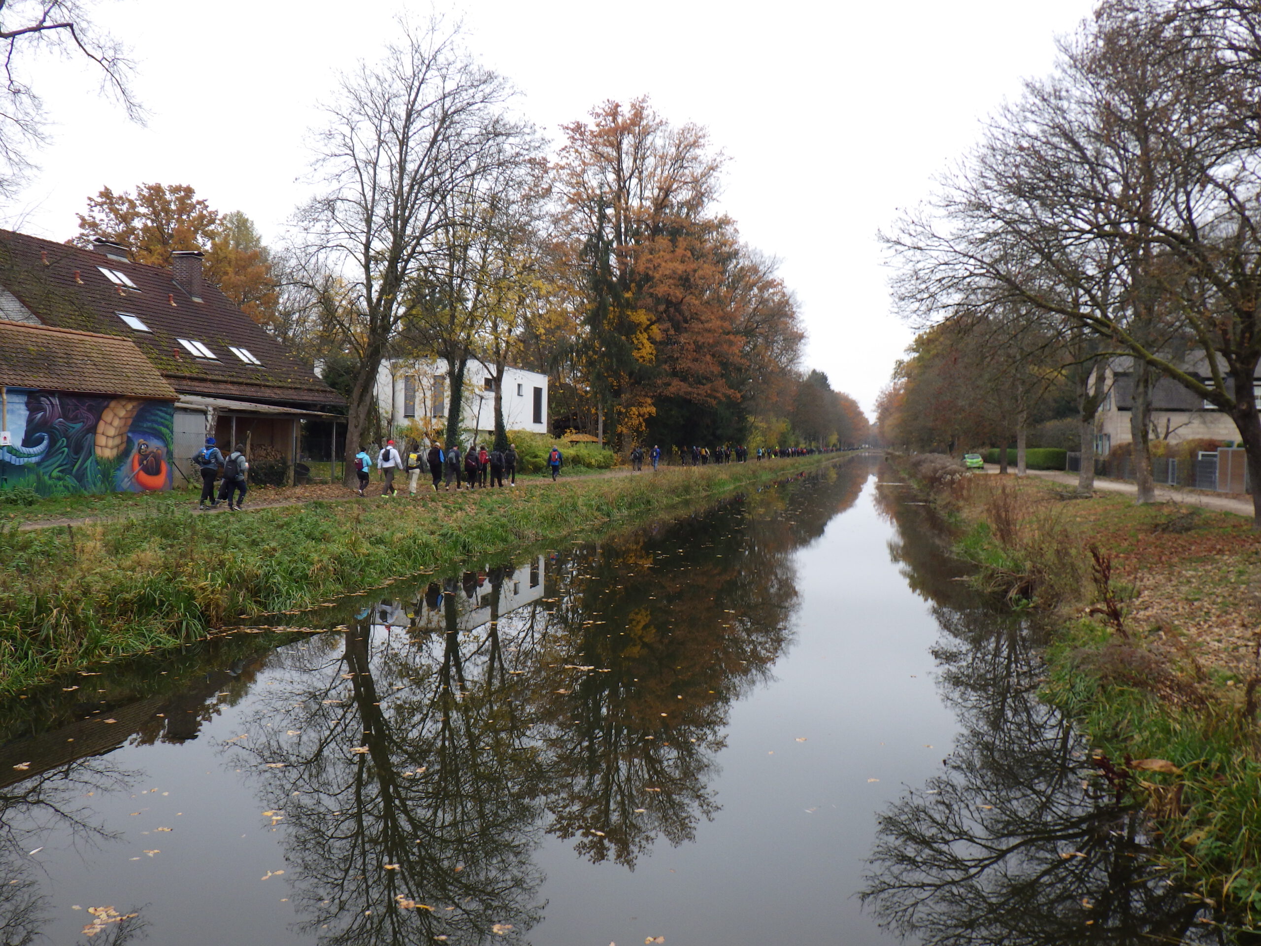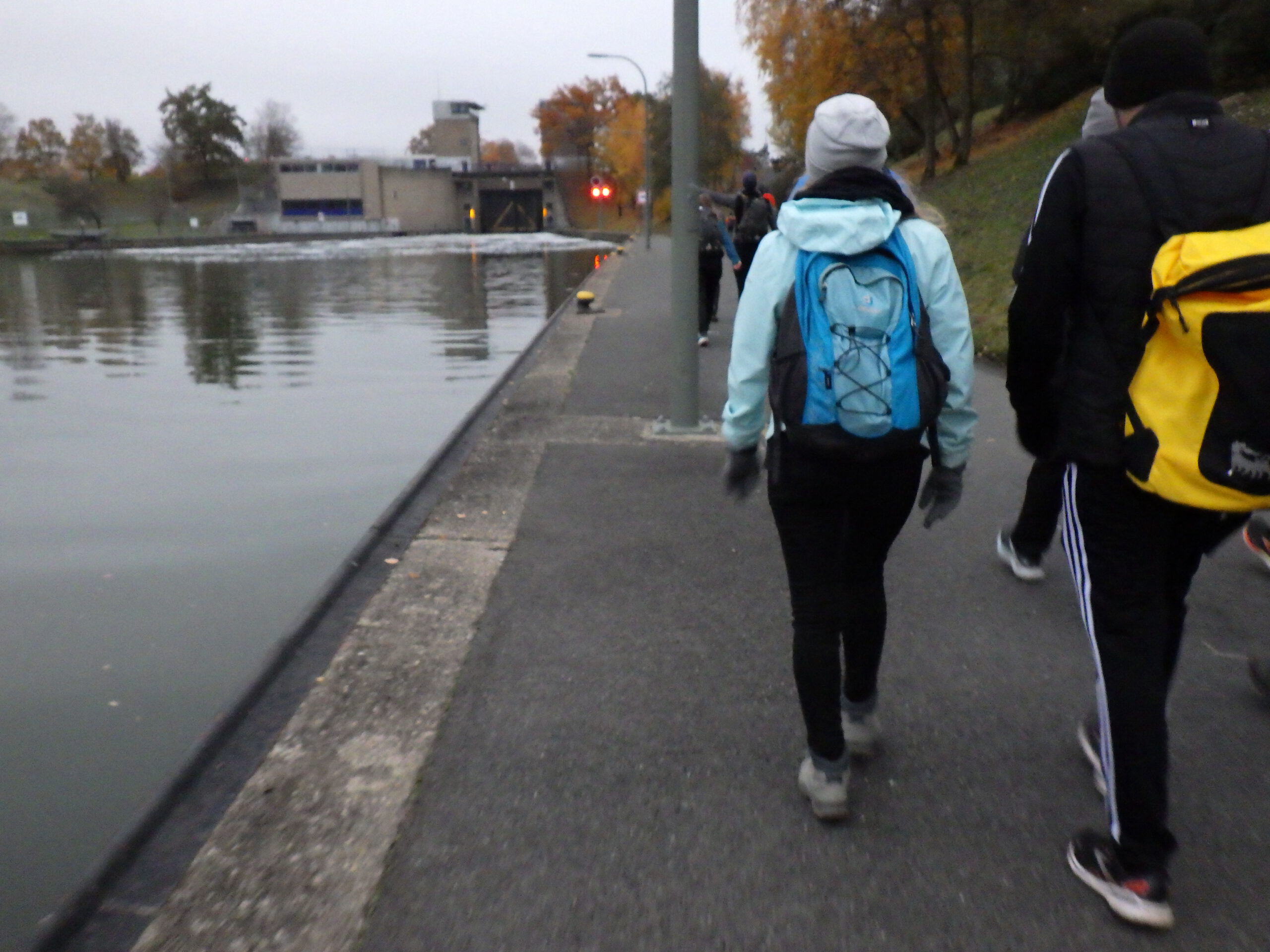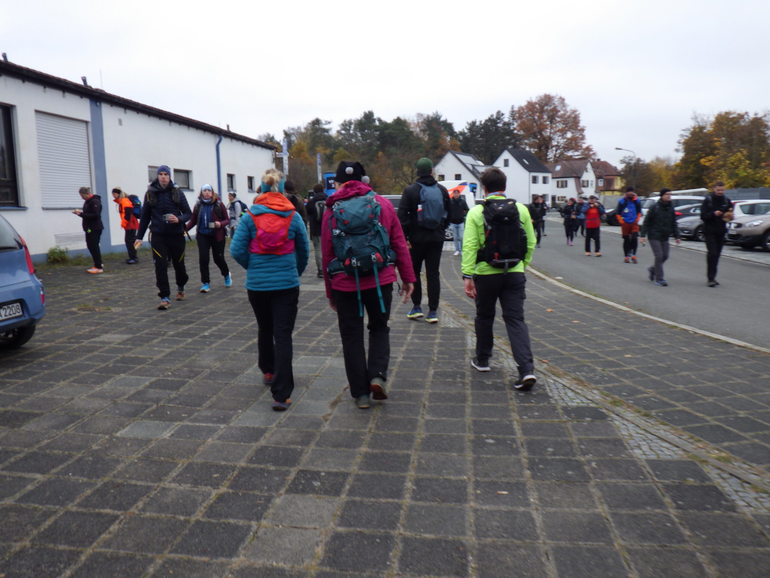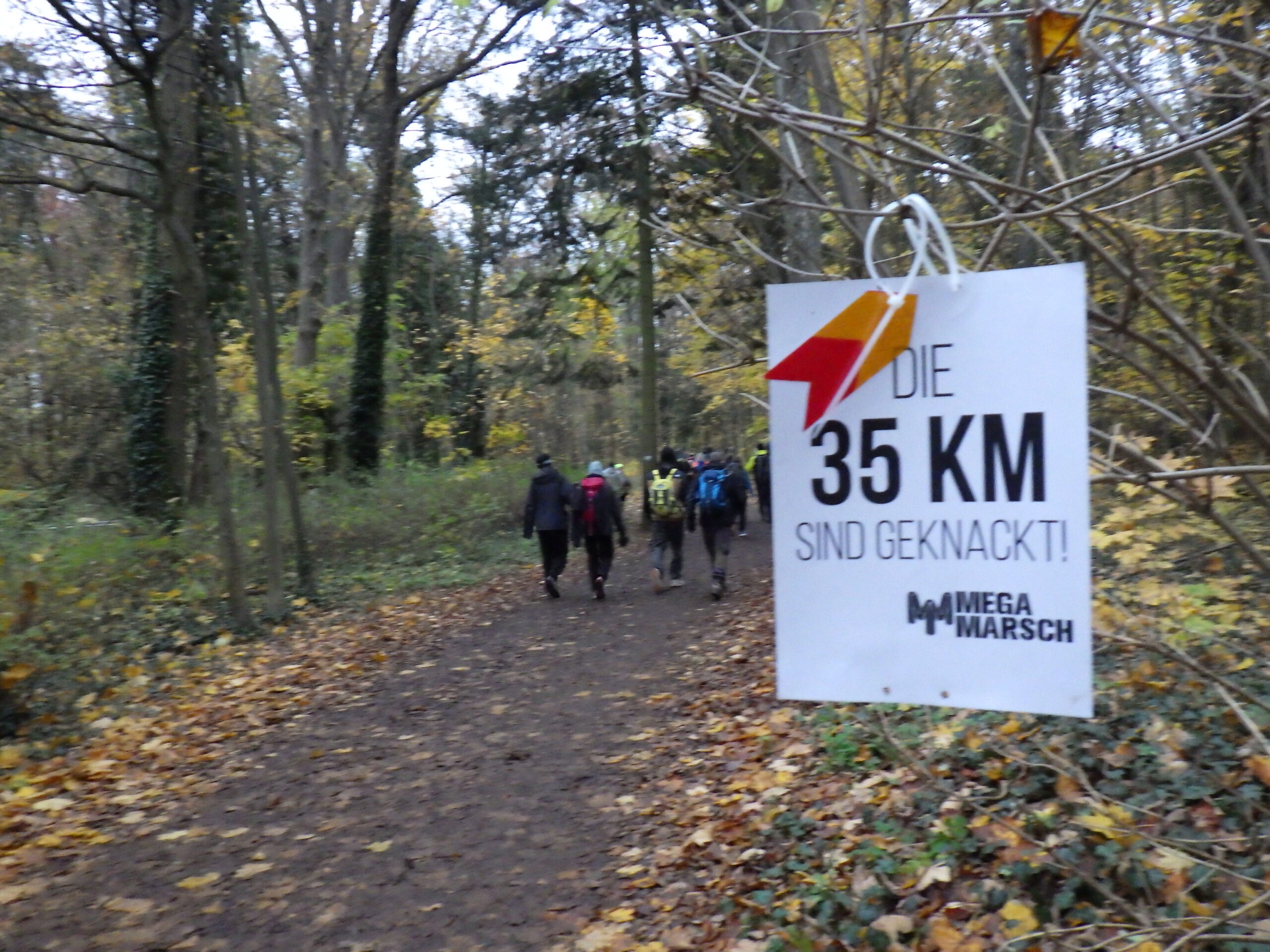 Ich zog noch den mitgebrachten Extra-Pullover an, da es nur 4°C waren und startete 5 Minuten eher, also 9:25 Uhr, da die vorherige Startgruppe nicht voll wurde. Die ersten zehn Kilometer waren ziemlich schnell. Es wurde zwischen 5 und 7 km/h gelaufen. Nach eineinhalb Kilometern ging es direkt in den Wald. Der Reichswald um Nürnberg ist ein im Nord- und Südosten Nürnbergs gelegenes Kulturwaldgebiet und gehörte früher direkt und unmittelbar dem Kaiser. Er gilt als ältester und erster Kunstforst der Welt. Er sieht heute nicht wirklich nach Baum-Plantage aus.