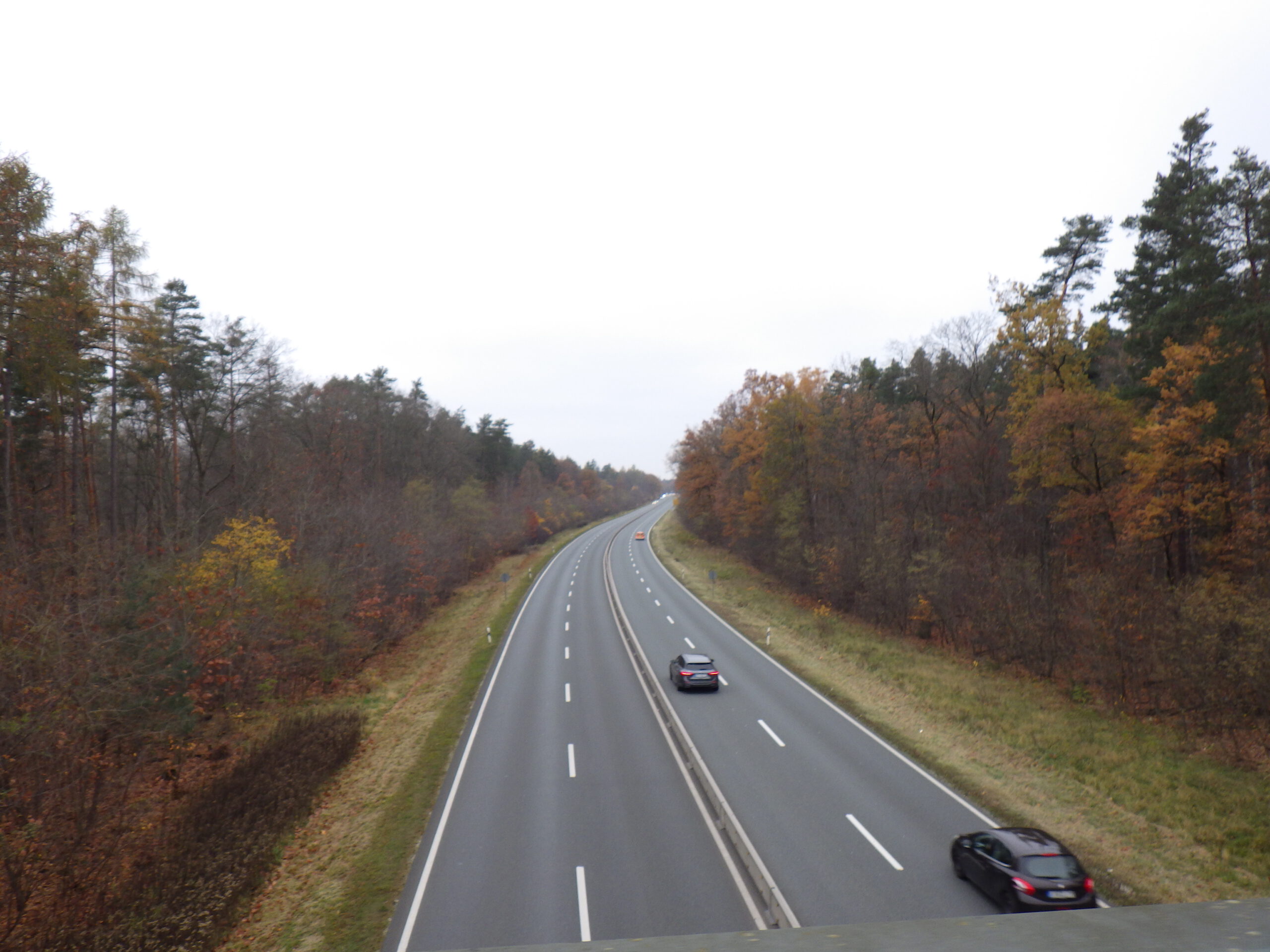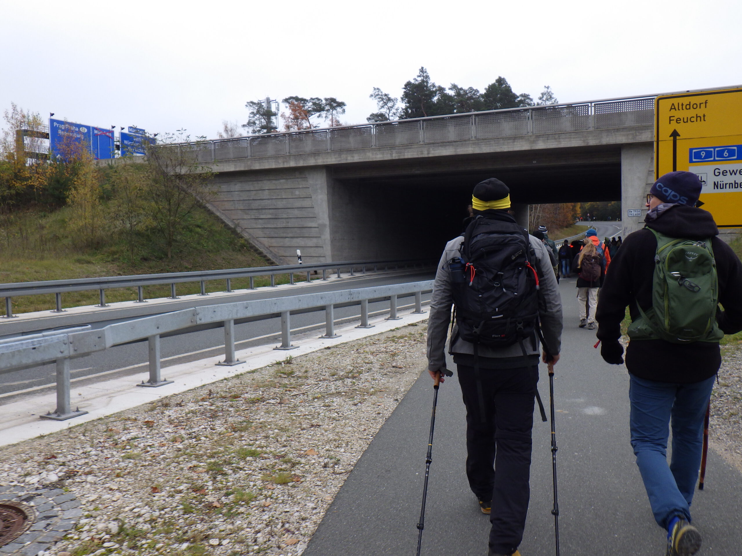 Nach dem 35-Kilometer-Schild ging es wieder zum Main-Donau-Kanal. Diesmal war der Kanal auch zu sehen. Übrigens wird dieser Europakanal auch Rhein-Main-Donau-Kanal genannt. Über den Kanal werden die Nordsee und das Schwarze Meer miteinander verbunden. Die Nürnberger sagen „Neuer Kanal“. Tja, entweder Größenwahn oder kleine Würstchen. Es folgte die Schleuse Nürnberg, mit einer Fallhöhe von 9,4 Metern und einem Mississippi-Dampfer. Es folgte eine Kanalüberquerung und eine A73-Superkreuzung mit Ampeln.