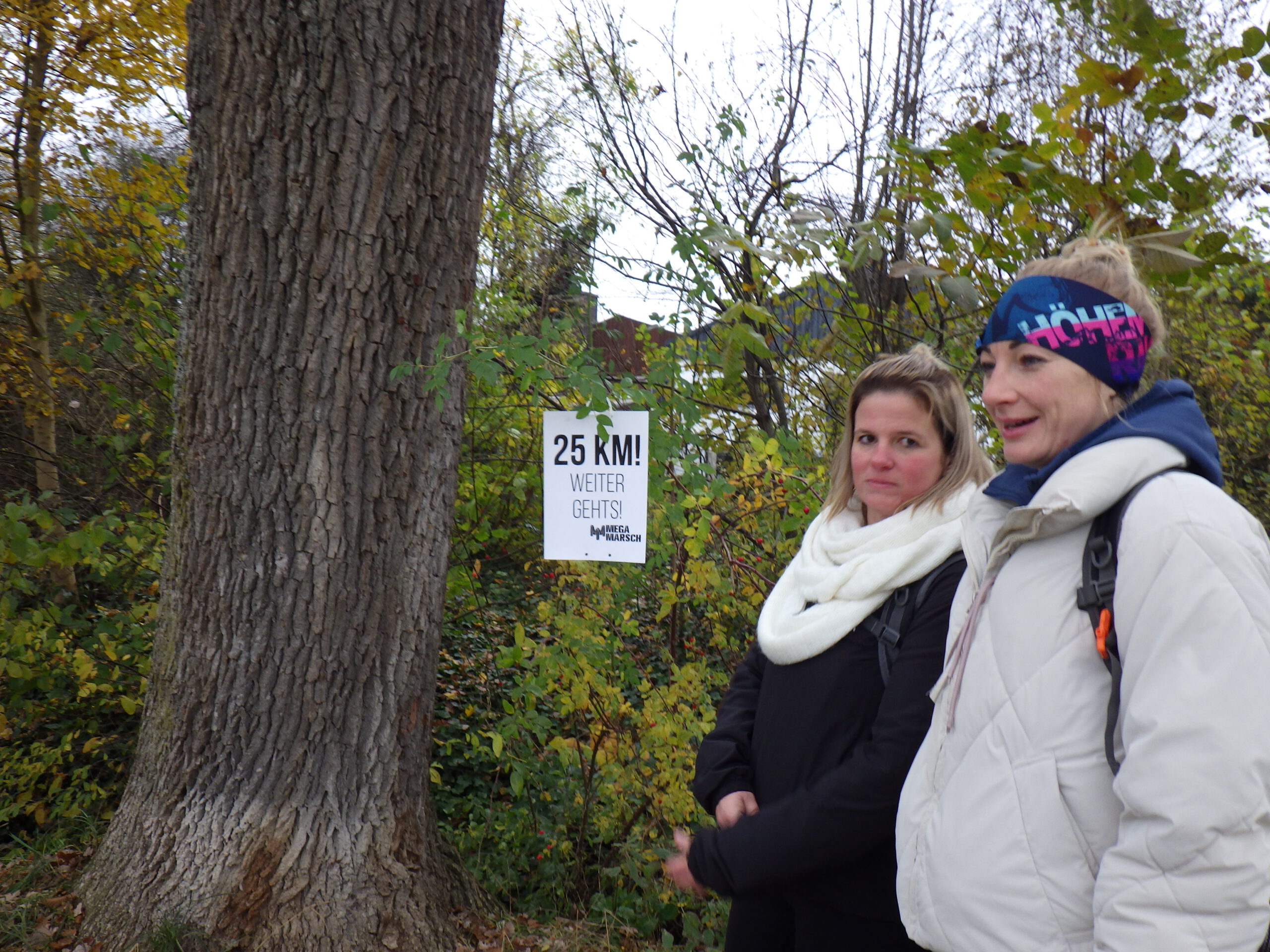 Dann ging es zurück zum Ludwig-Donau-Main-Kanal. Der Wanderweg führte nun entlang des Kanals bis Worzeldorf. Dann gab es wieder einen Single-Trail und das 25-Kilometer-Schild. Übrigens, wollten die zwei Wanderinnen fotografiert werde. Bitte, hier ist das Foto. Als man 1950 den Ludwig-Donau-Main-Kanal dicht machte, plante man schon an einem neuen Wasserweg zwischen den beiden Flüssen: den Main-Donau-Kanal.