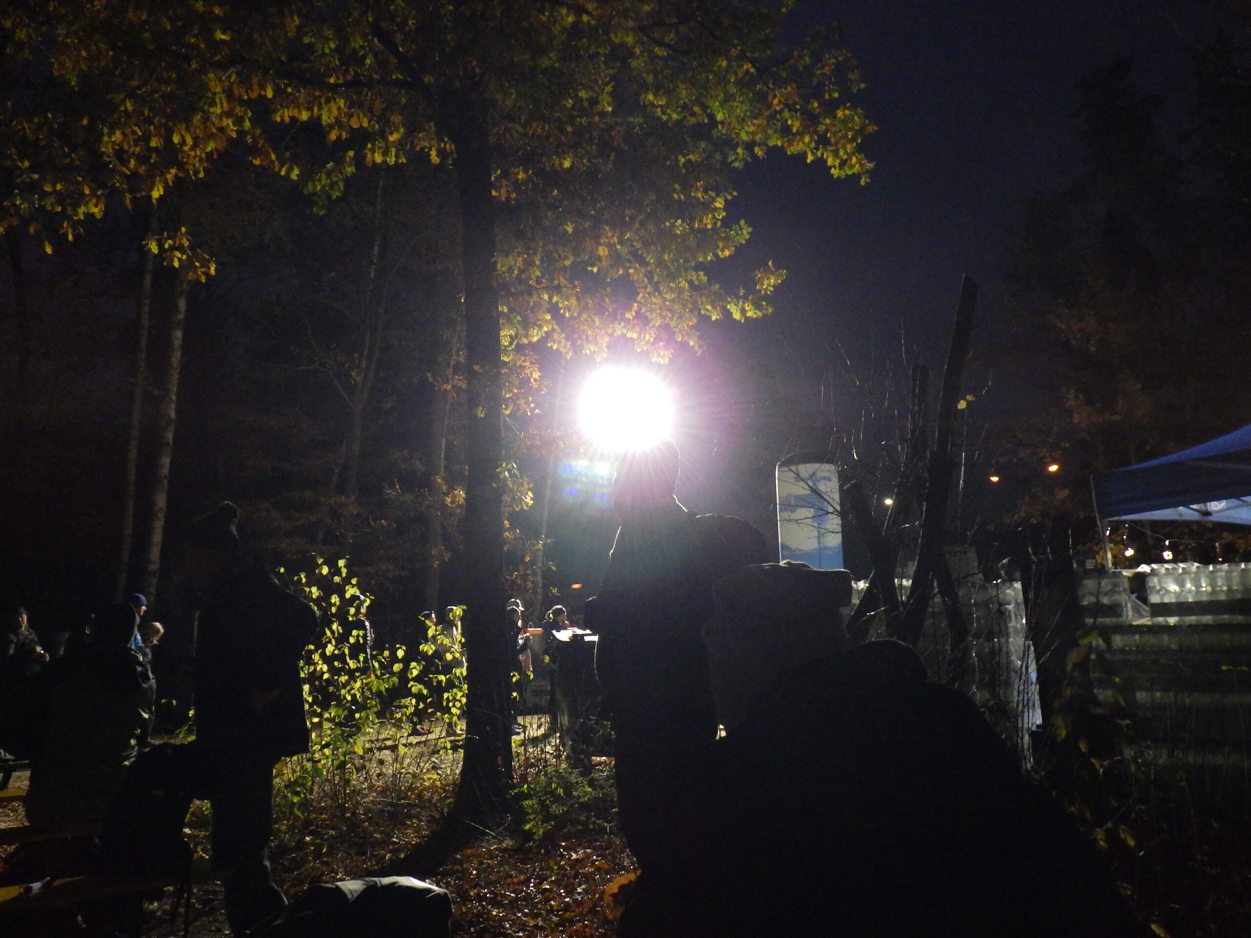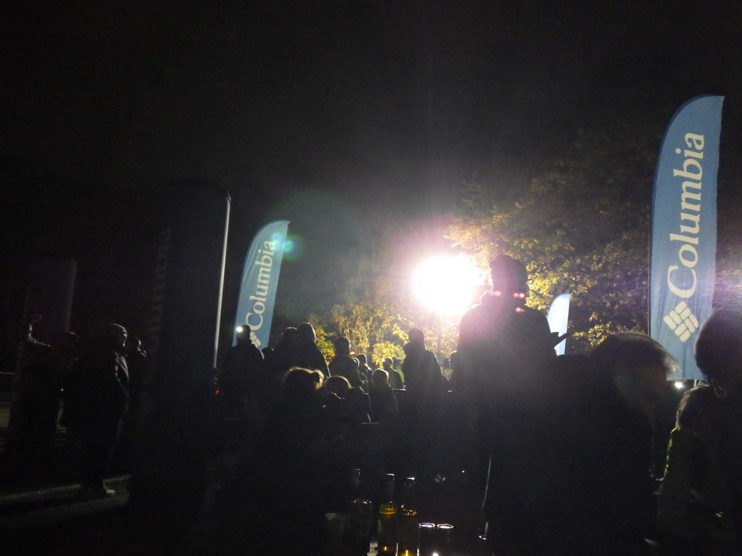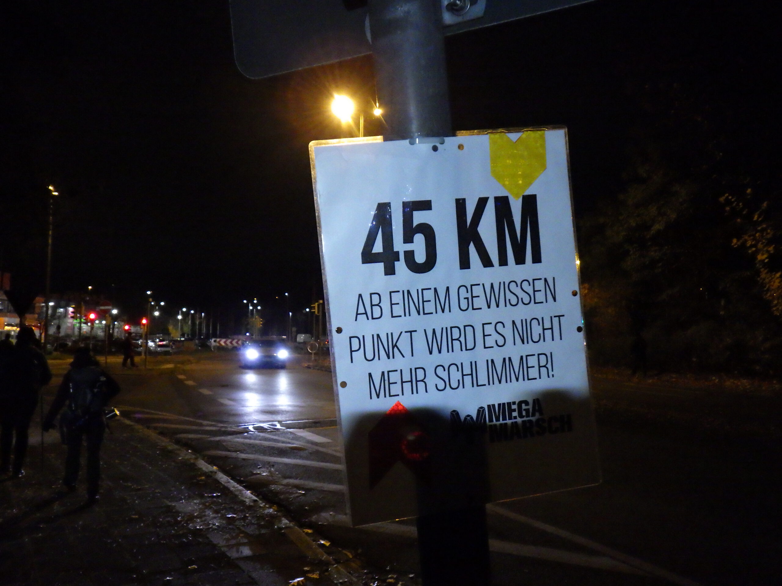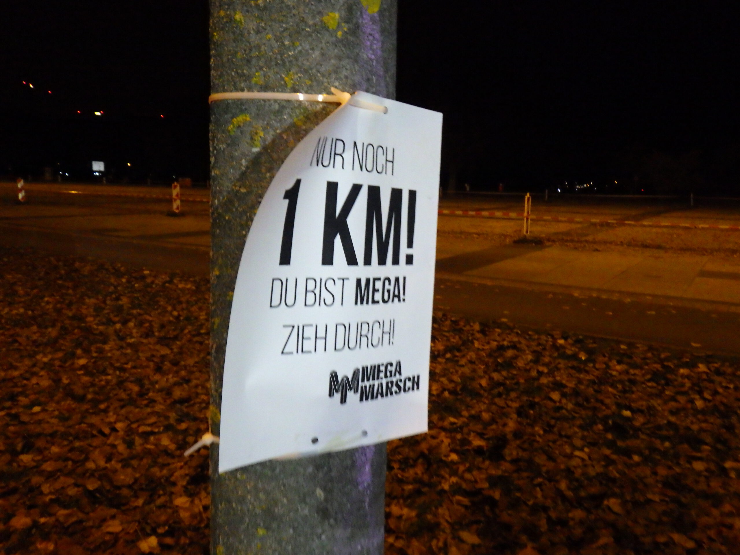 Am VP 4 kurze Pause und natürlich vergessen die Stirnlampe auszupacken. Das machte ich zweihundert Meter danach. Die letzten zehn Kilometer mit der Stirnlampe. In der Bauernfeindstraße erkannte ich dann die U-Bahn-Station. Dann zum Silbersee und den Dutzendteichen. Als letztes auf der Großen Straße eine Schikane-Schleife. Die 40 Meter breite Straße gehörte auch zum Reichsparteitagsgelände. Dann durchs Ziel. 09:49 auf 51,2km, also 5,2km/h. Zeit in Bewegung: 09:05 mit 5,6km/h. Mit Medaille und Urkunde erstmal 10 Minuten hingesetzt und einen Lebkuchen gegessen. Dann das Heftchen abgestempelt und zurück zum Hotel.