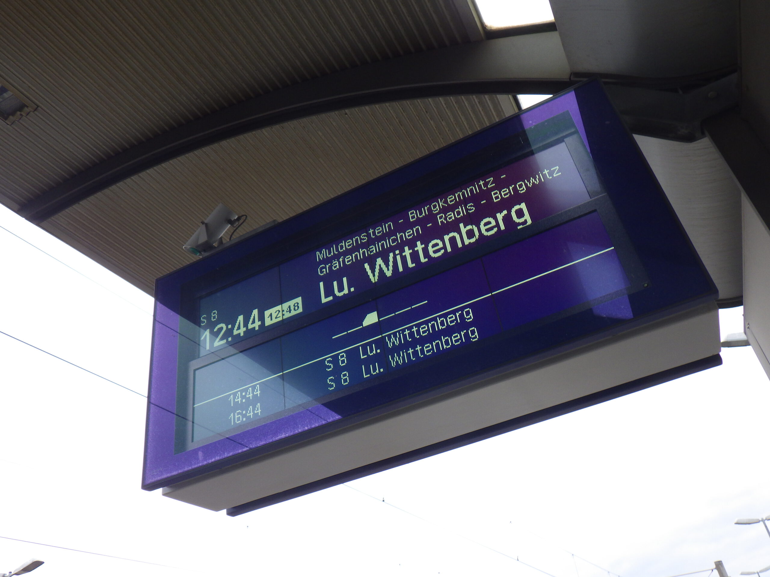 Es ging kurz an der B100 entlang, dann auf einer Straße ohne Fußweg zum Vorstadtteich, dann durch den Hain zum Wasserturm und weiter direkt zum Bahnhof. Leider hatte sich der 10-Minuten-Umweg doch als sehr ungünstig erwiesen, den der stündliche Zug war fünf Minuten eher gefahren. Also musste ich 55 Minuten am Bahnhof warten. Dann ging es mit der S8 nach Bitterfeld und mit dem RE13 nach Leipzig. Das Warten am Bahnhof erinnerte mich an alte Splash-Tage.