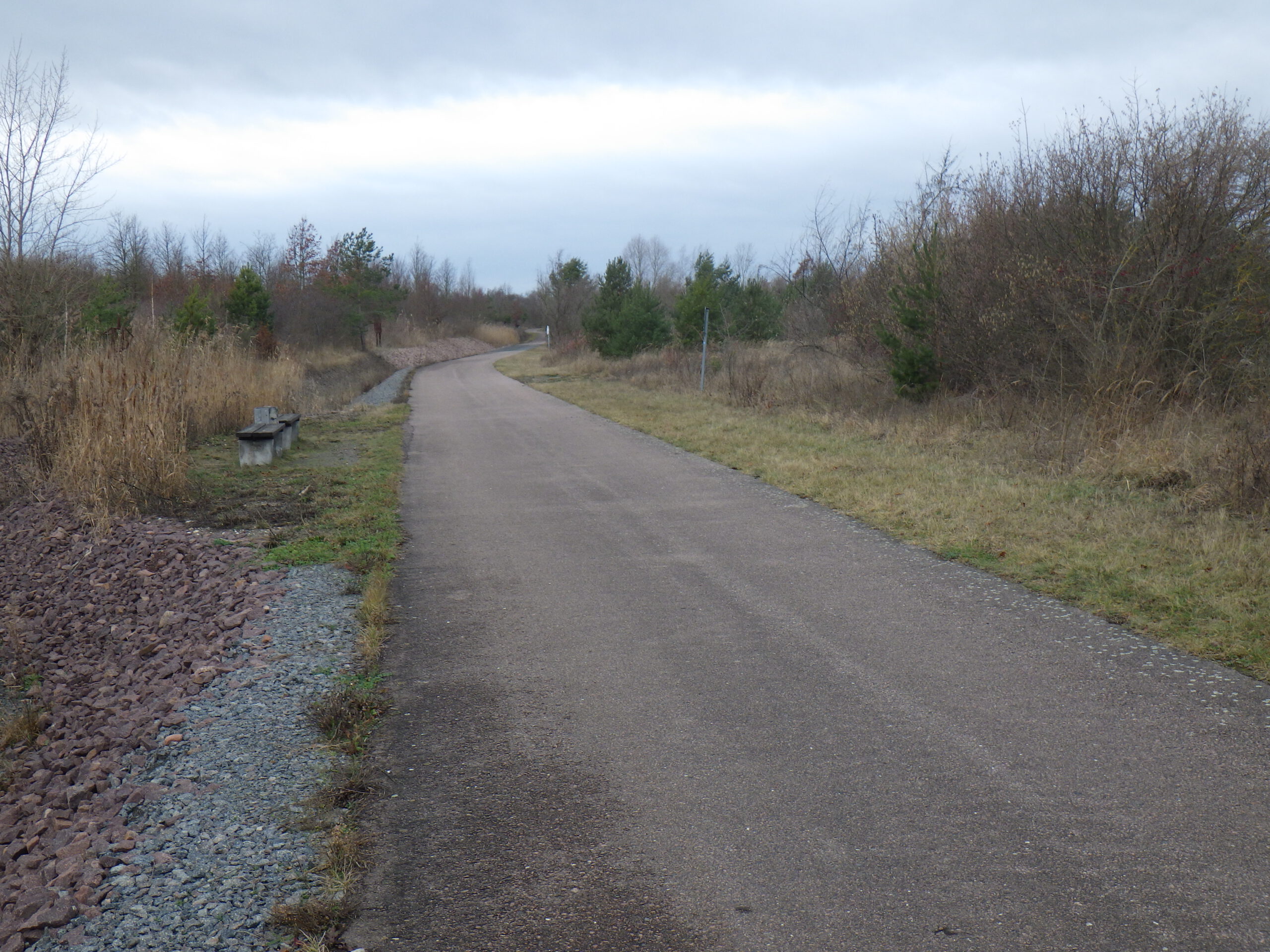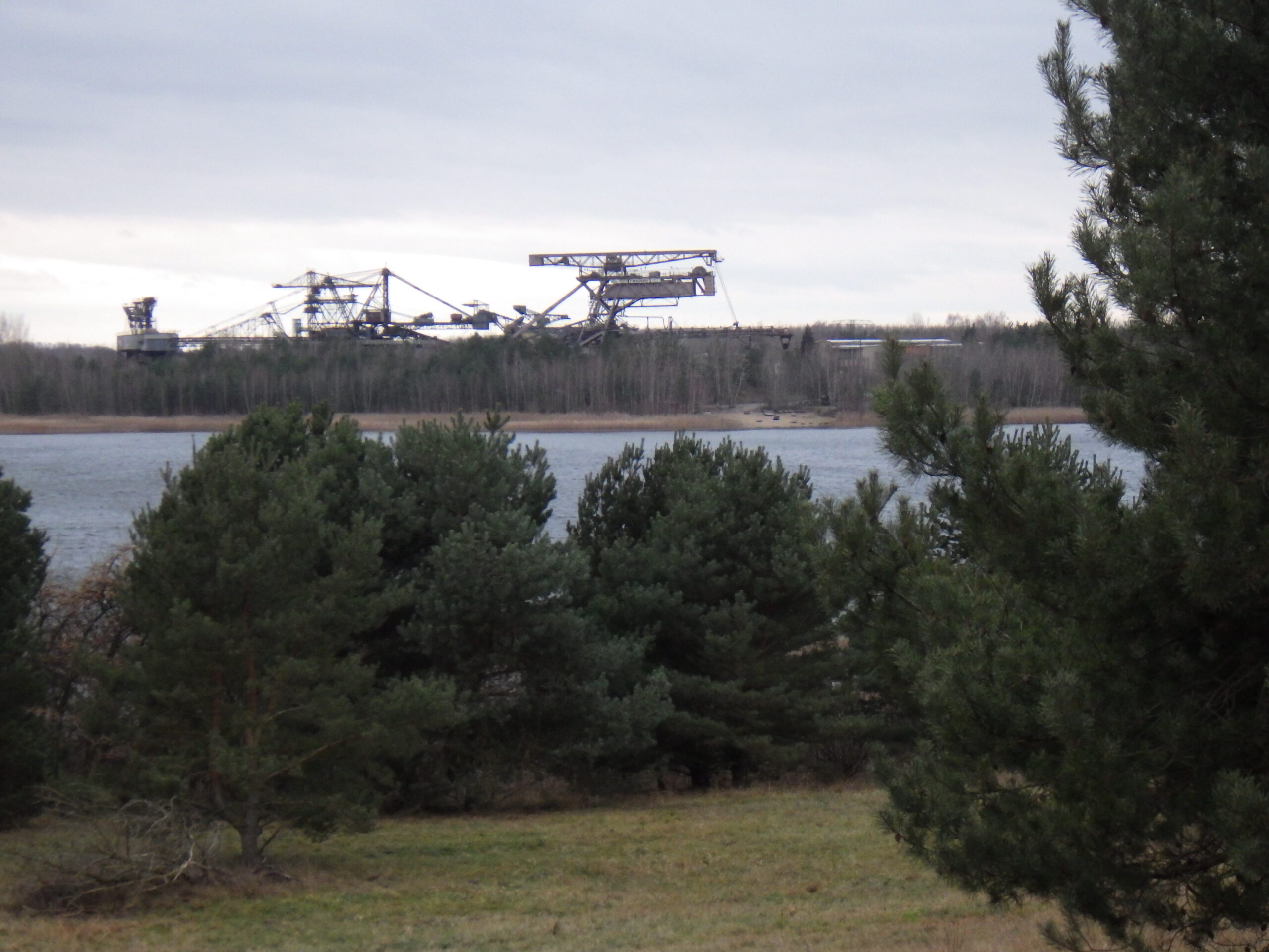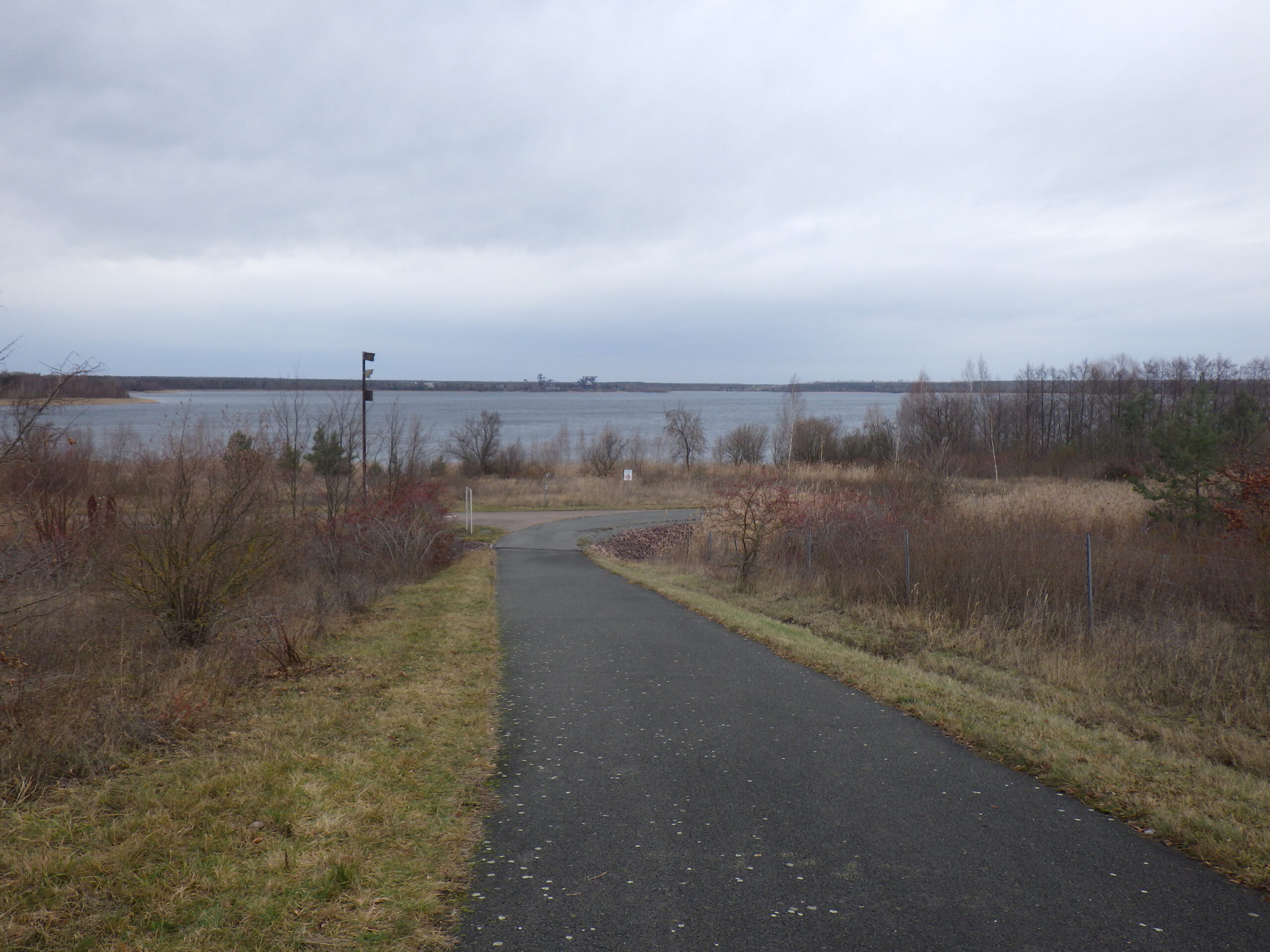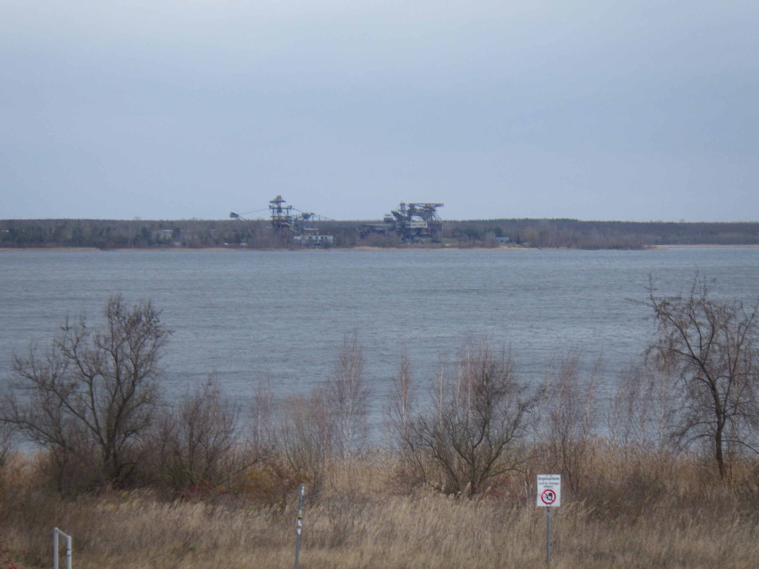 Dafür wehte ein eiskalter Wind. Ich war mit der Winter-Ausrüstung unterwegs, also Gemyse-Wanderjacke und ein Nebulus-Pullover. Da habe ich eher geschwitzt und musste ab und an die Jacke lüften. Dann hätte ich auf die Halbinsel mit der Stadt aus Eisen abbiegen können. Die Tagebaugroßgeräte sind äußert sehenswert und haben interessante Namen: Big Wheel, Mad Max, Mosquito, Gemini und Medusa.