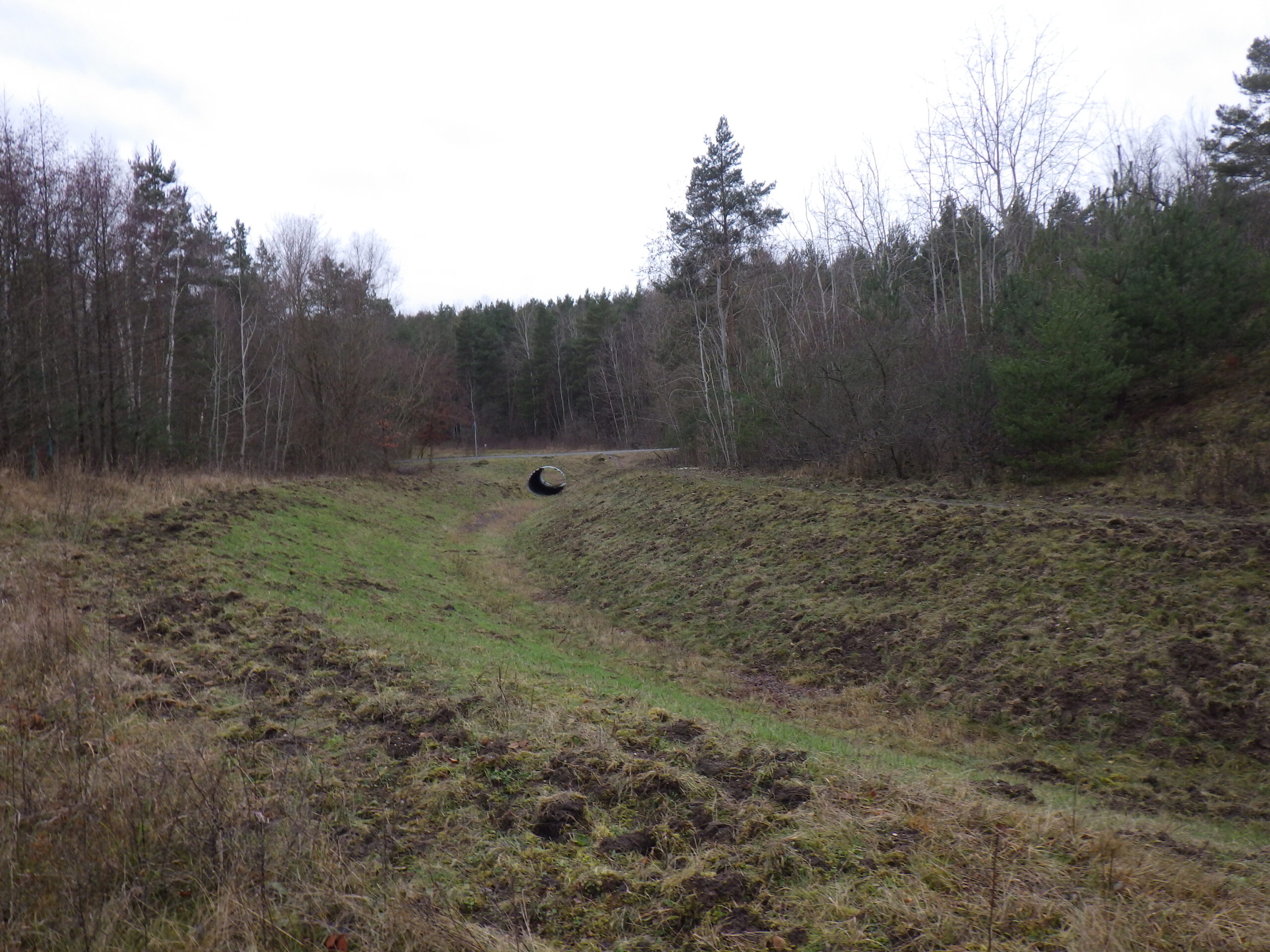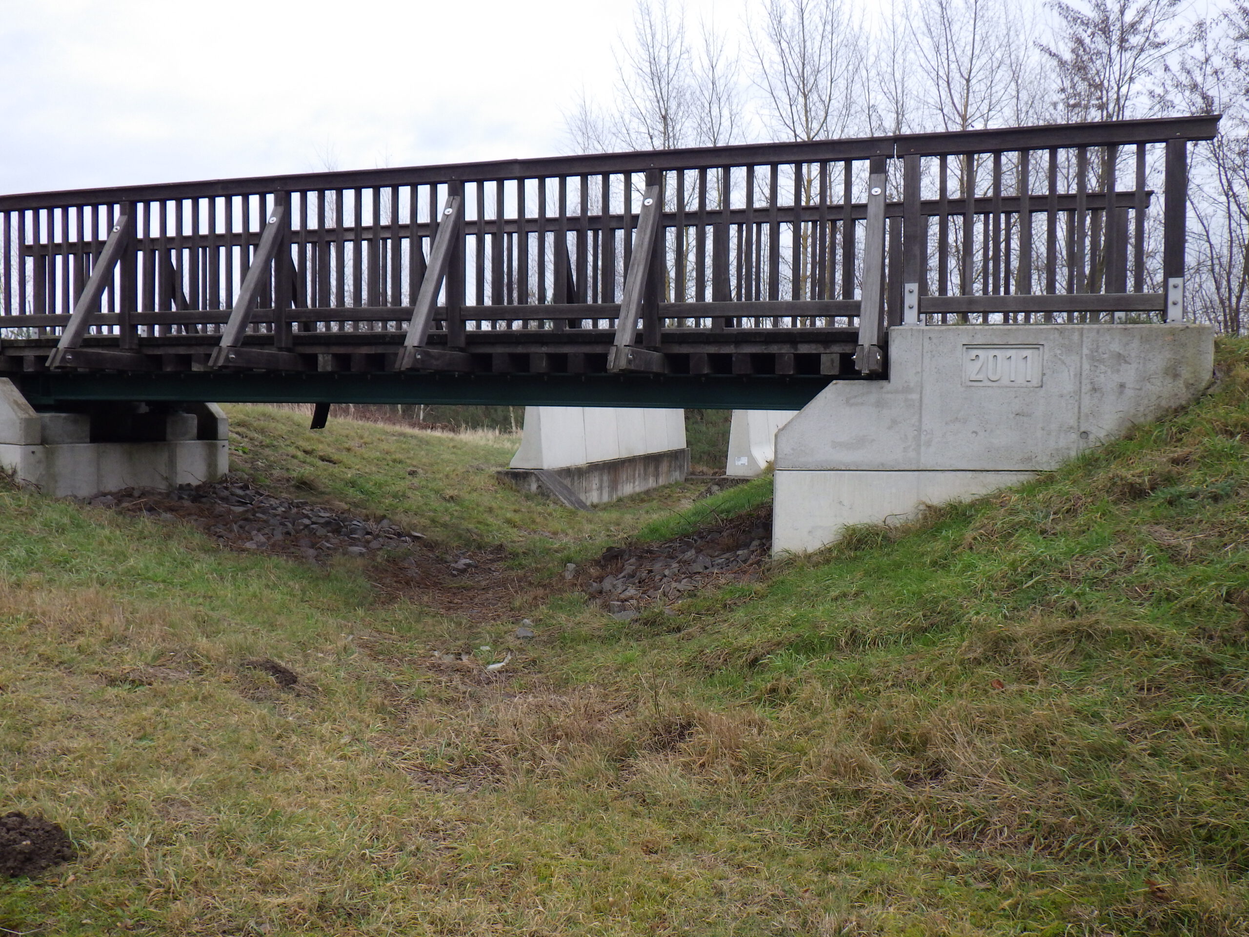 Nun ging es also weiter auf dem Rundweg. Dort wartete ein Wasserlauf mit einer Brücke ohne Wasser. Vielleicht ist dies ein See-Abfluss. Auf der Sat-Karte führt der wasserlose Bach zum Mühlgraben. Zufluss hat der Gremminer See keinen. Geflutete wurde hier seit 2000 der Tagebau Golpa-Nord mit Wasser aus der zwölf Kilometer entfernte Mulde (per Rohrleitung). Die LMBV ist inzwischen nicht mehr Eigentümer des Sees, sondern die Blausee GmbH. Diese gehört wie Blauforst und Blauwasser zu Merckle.