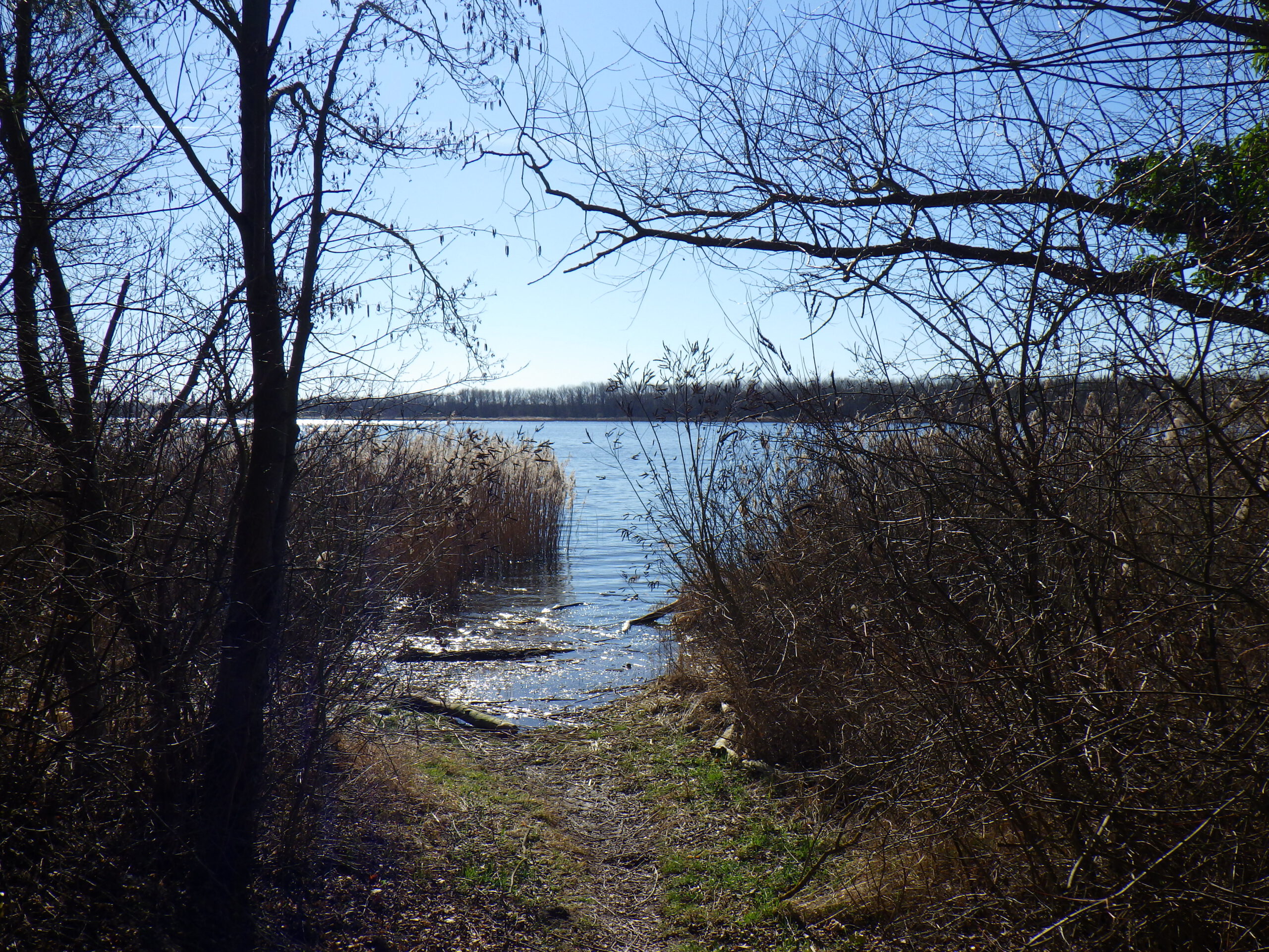 Ich stelle ja die Wandertracks nun immer bei Komoot ein. Daher mal ein Hinweis zum Weg: Diese Passage (von Kilometer 12 bis 15,5) sollte man nur zwischen September bis März laufen, da man sonst die brütenden Wasservogel stört. Einige der posierlichen Tierchen waren schon beim Nestbau. Eine Ausweichstrecke geht von Pouch über Mühlbeck nach Friedersdorf. Ich bin aber dreieinhalb Kilometer durchs Gestrüp. Zwischendurch schöne Aussichten auf den See (die Sonne stand nun besser).