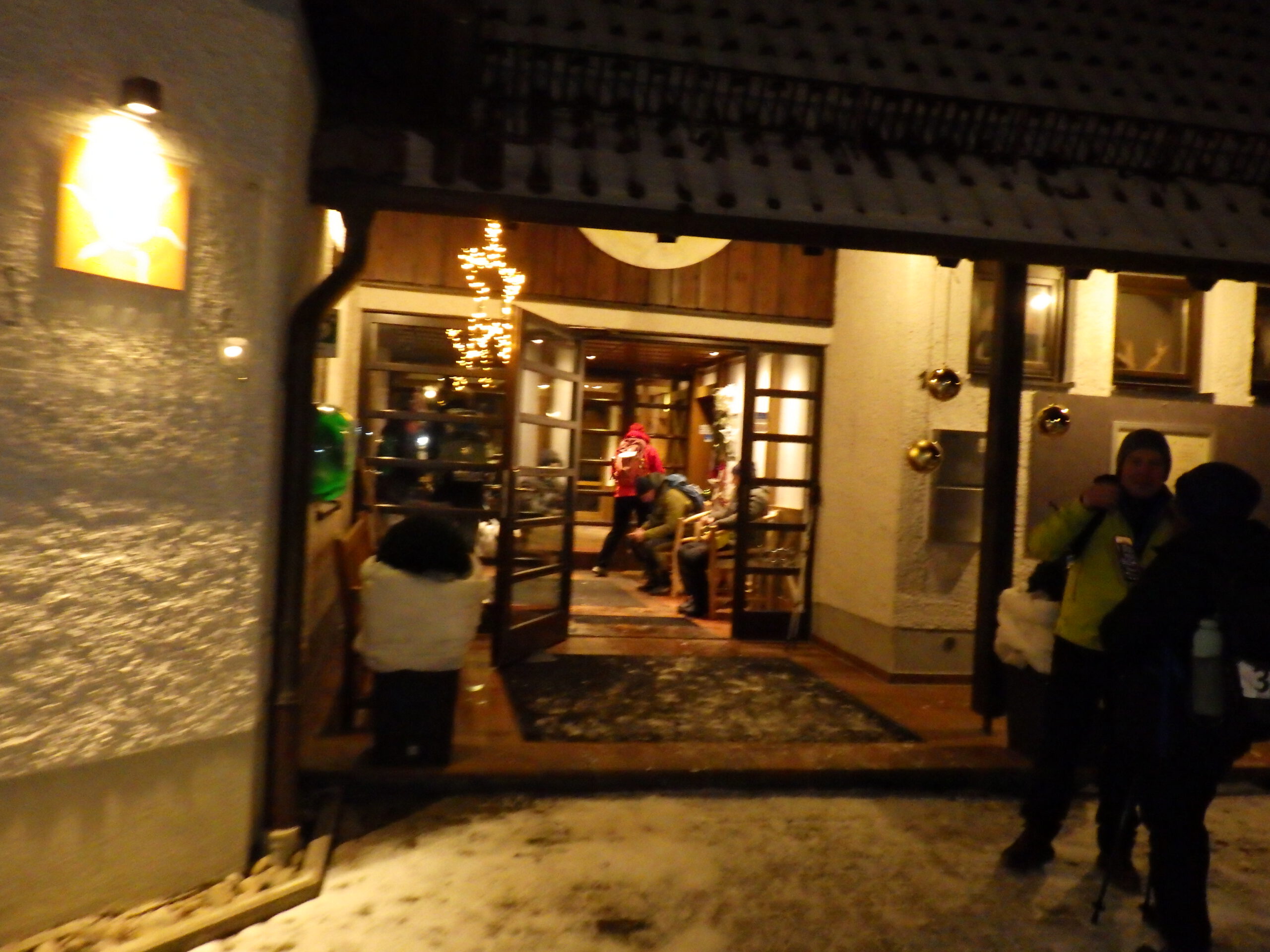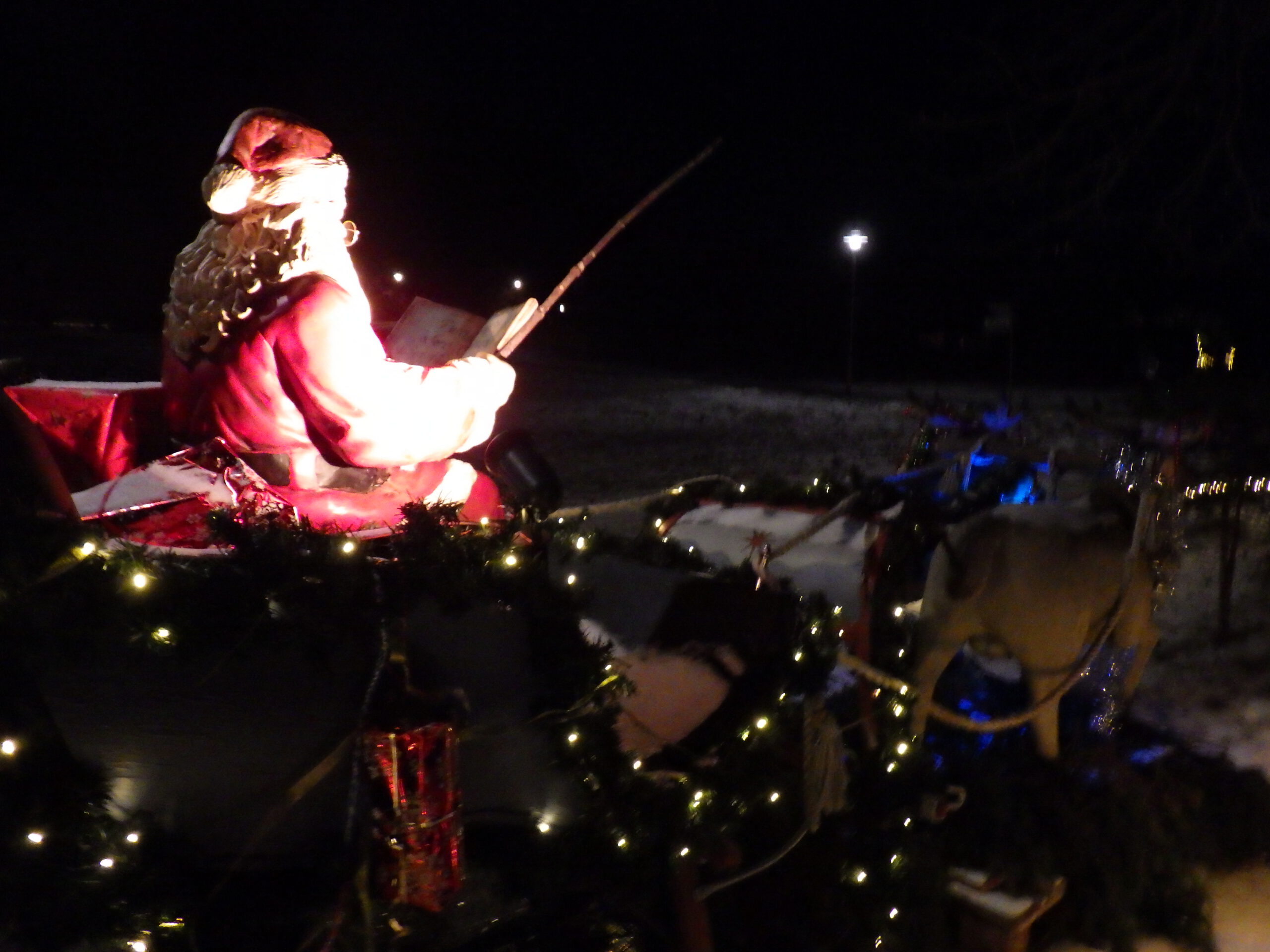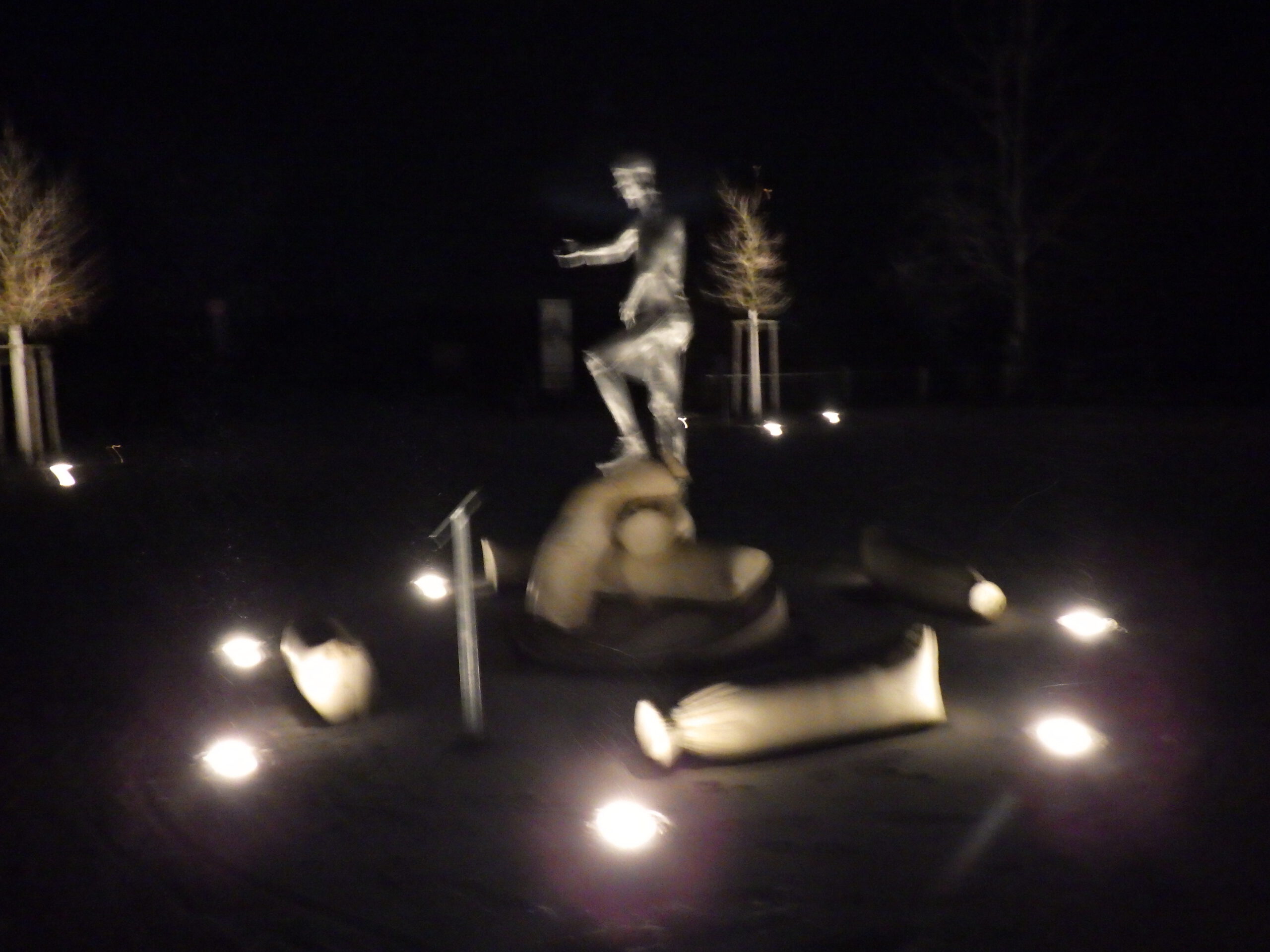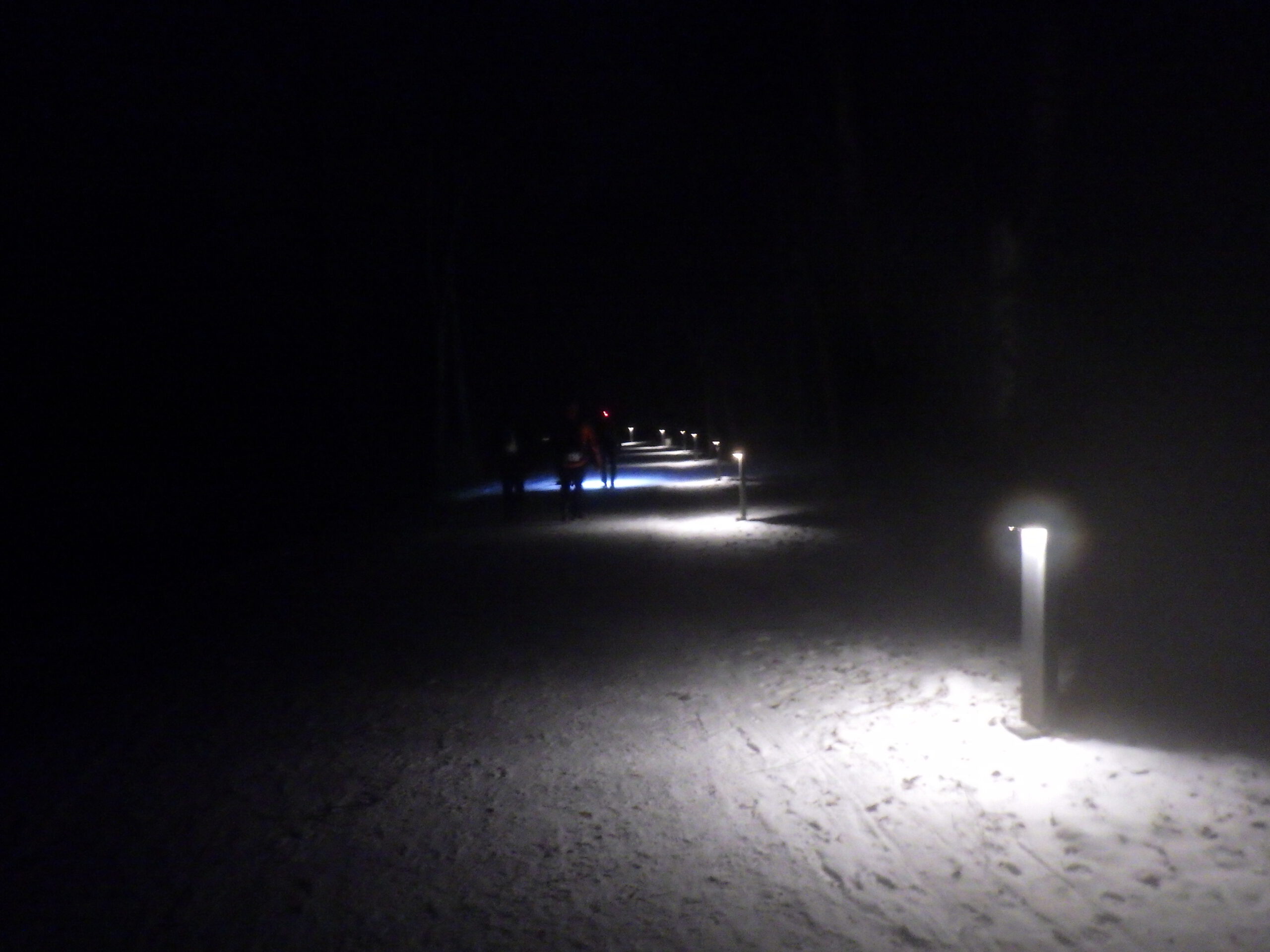 Bergab auf einem Serpentinenweg. Dann wurde es Zeit für die Kopflampe. Es folgten Ottmannsdorf und Enderndorf am See. Am dortigen Denkmal der Mühlen, das mir eine unscharfe Nachtaufnahme bescherte, begann dann der Igelsbachsee. Auf dem Weg zum VP 1, kurz nach dem Gänsbach, schwatzte ich mit einer Mitwanderin. Es schneite leicht. Am VP 1 futterte ich zwei Kekse und trank den mitgebrachten Tee aus den beiden kleinen Thermosflaschen, die ich mir für diese Wintersaison gekauft habe.