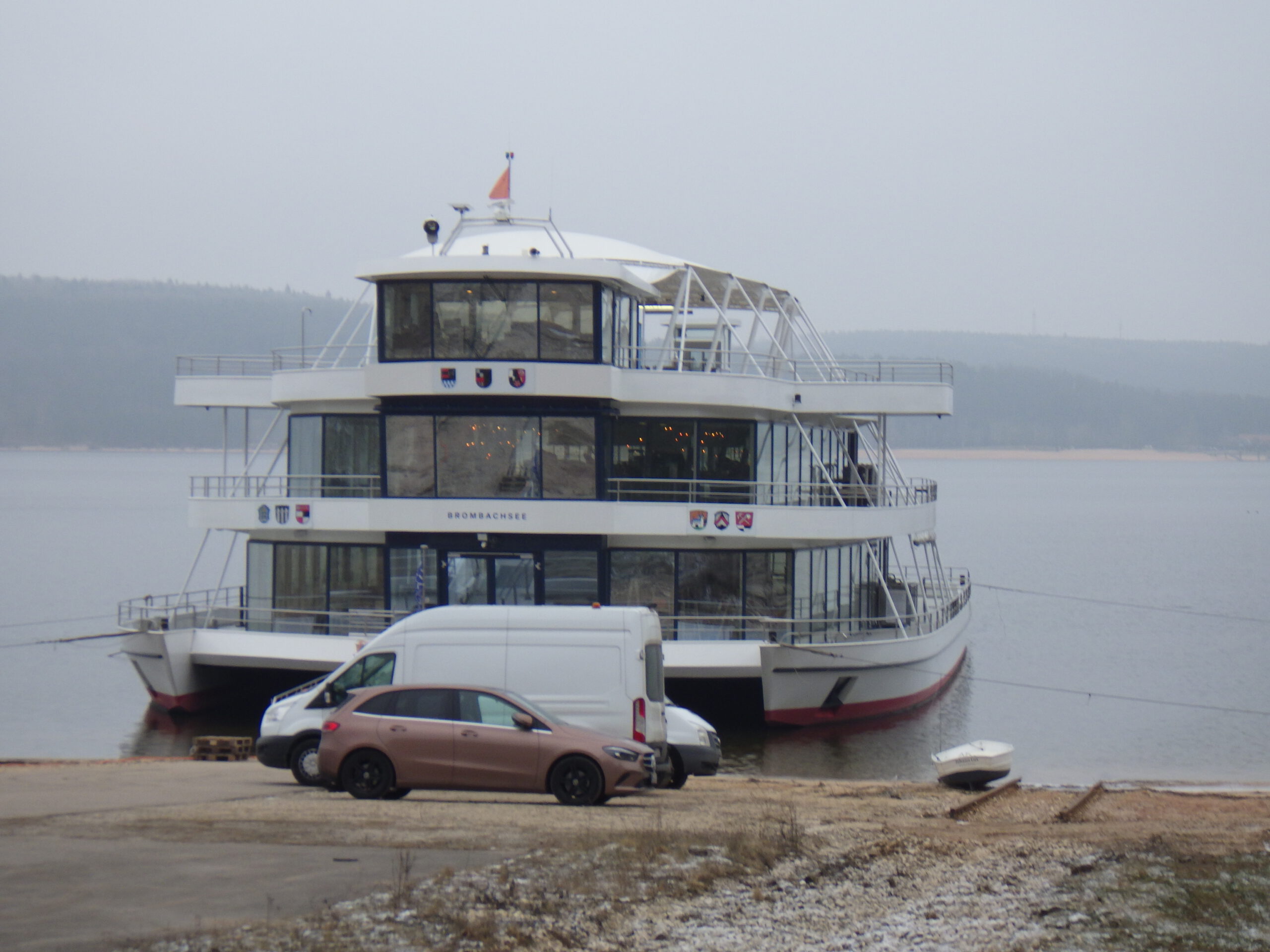 Dort wartete die Fähre – der Trimaran trägt den Namen des Sees. Es ging am See entlang. An der Anlegestelle Ramsberg versuchte ein Mann sein Wasserfahrzeug, ein elektrisches Hydrofoil-Board, zu besteigen. Ungefähr so erfolgreich, wie ich beim Bergsteigen. Am Wohnmobilstellplatz wartete dann Michael Snehotta von Seenland.events und feuerte die Wanderer an. High Five. Er ist neben Jens Zimmermann von den Rats-Runners einer der Veranstalter des Yeti Trails.