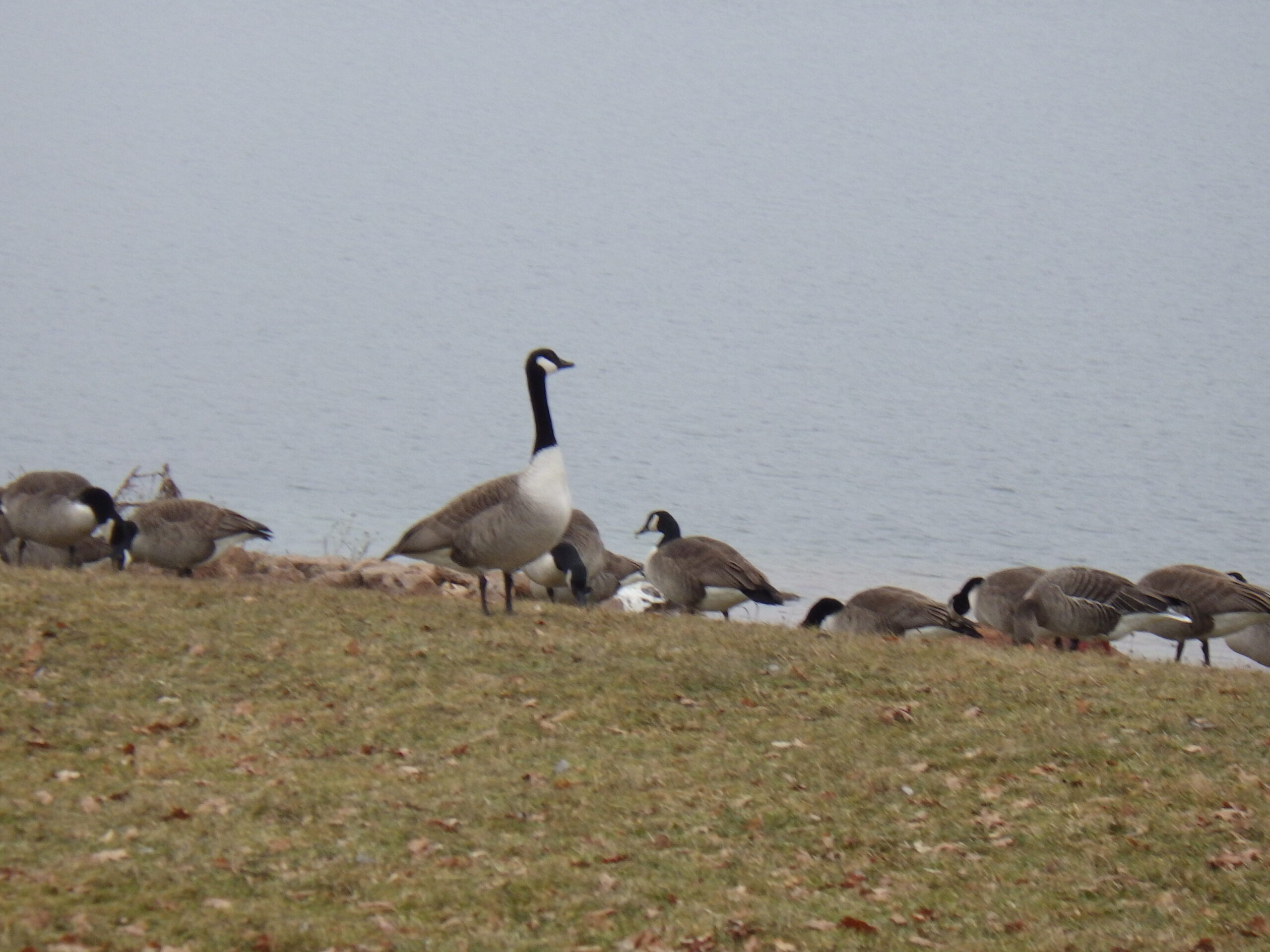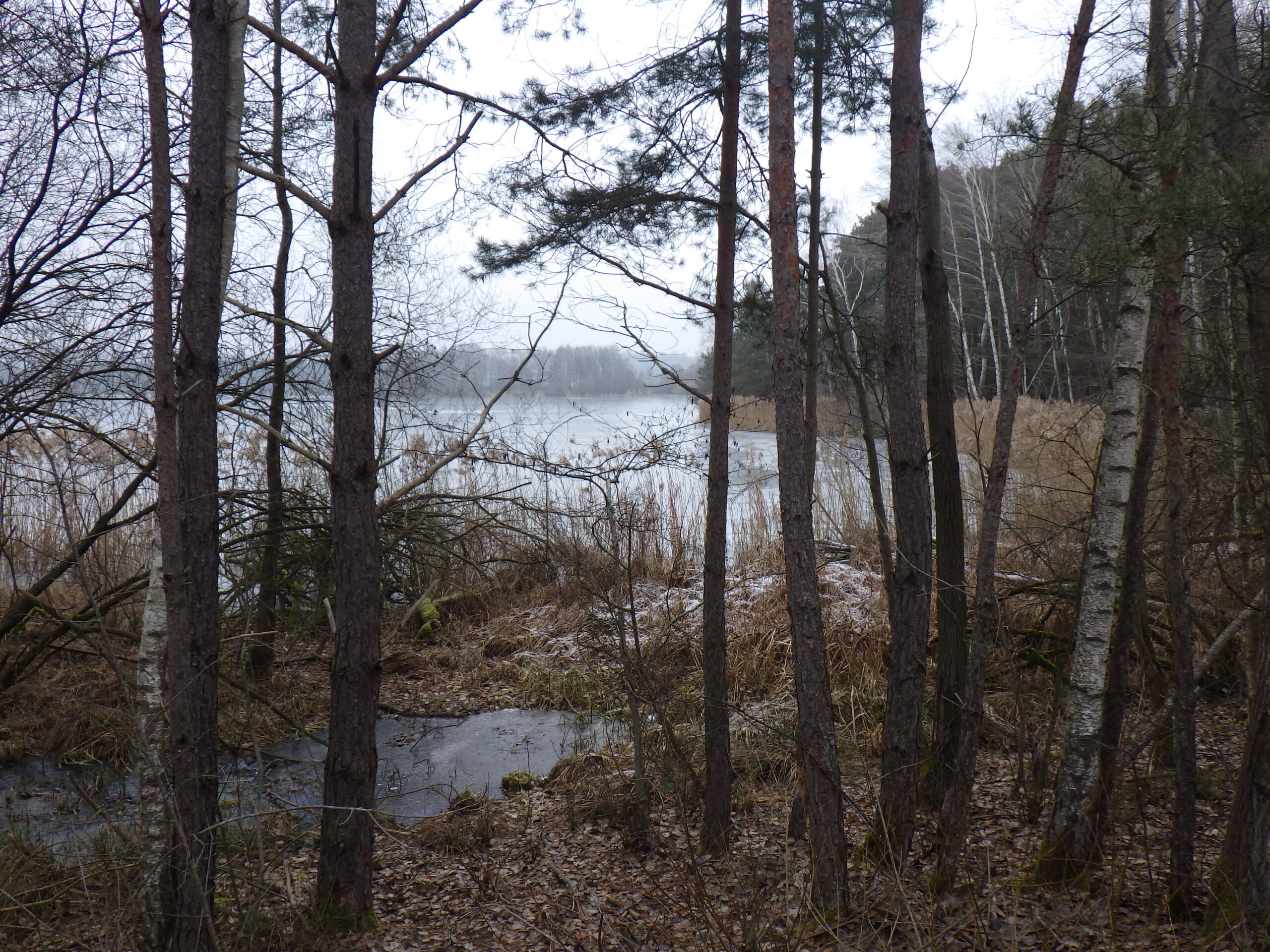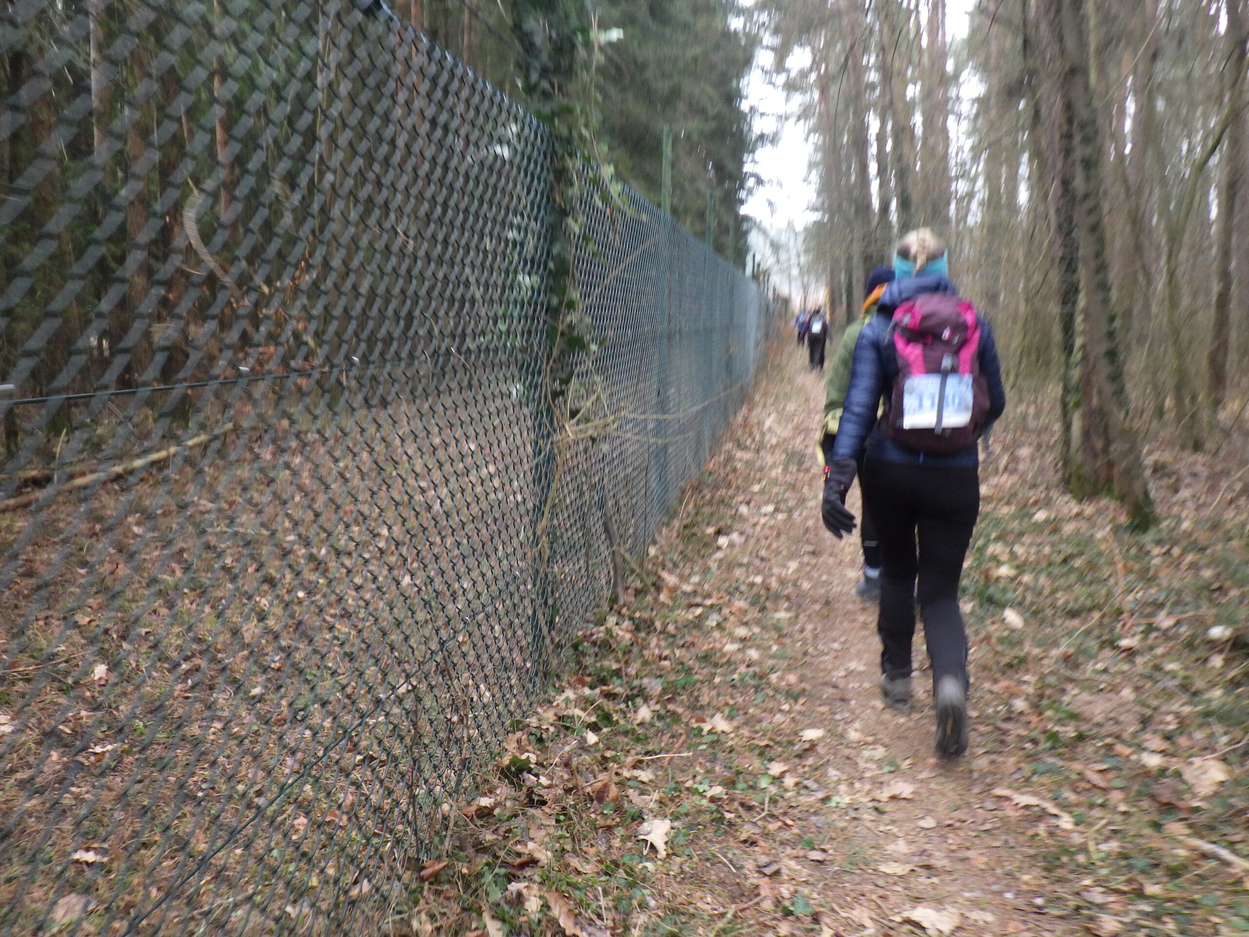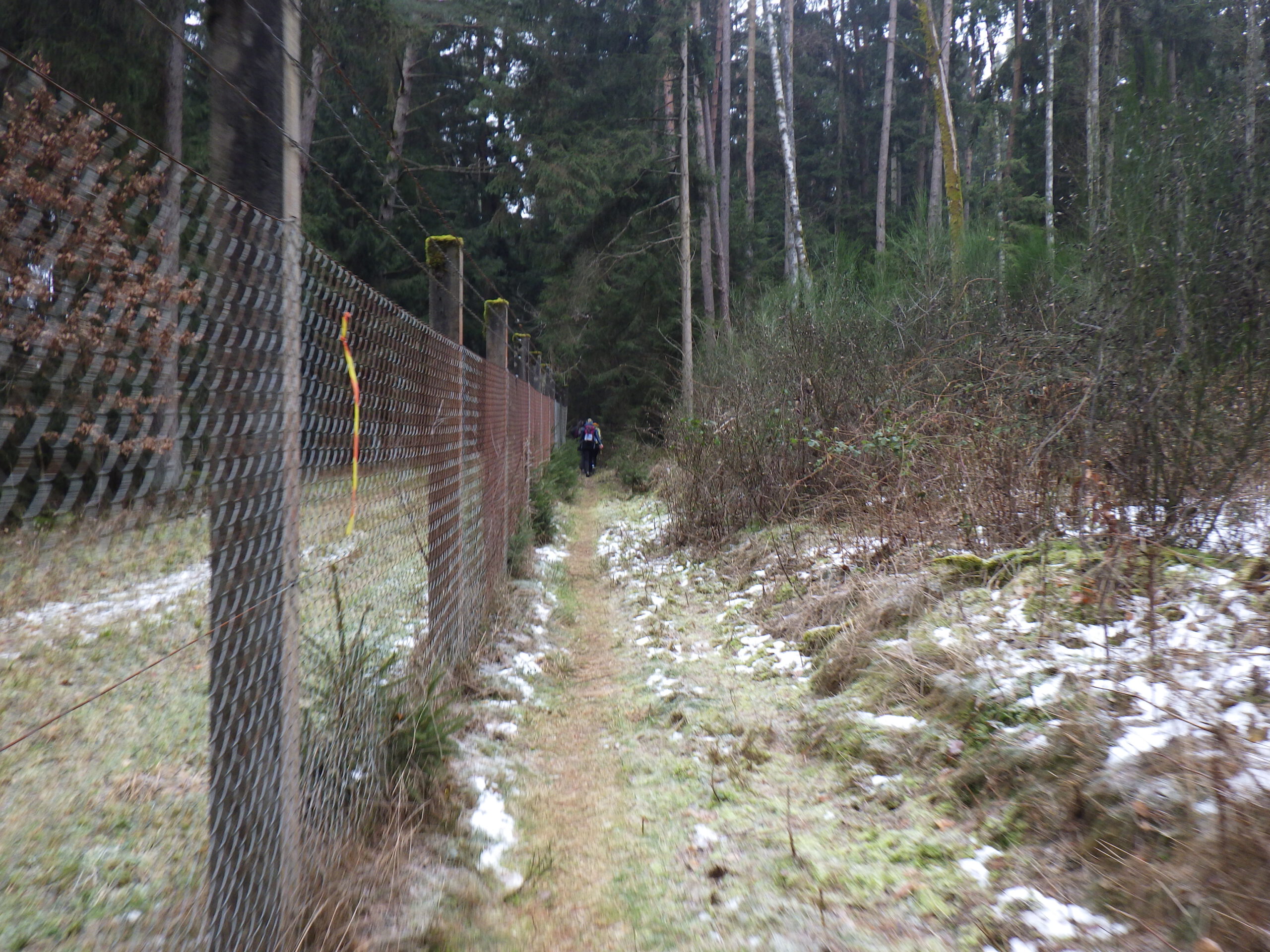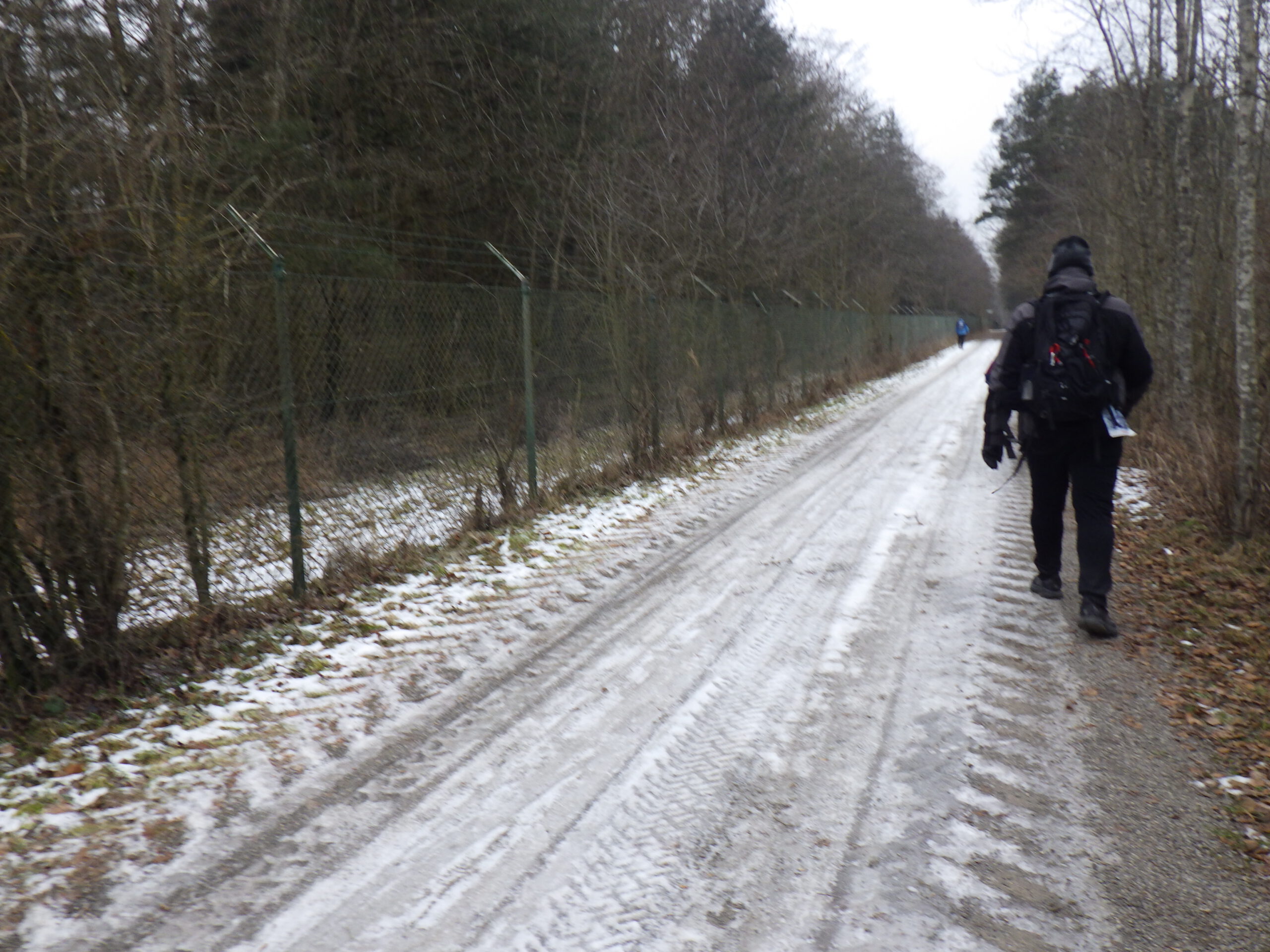 Einstweilen ging es immer am Zaun entlang. Immermal konnte man schöne Ausblicke auf den See geniessen. Andererseits folgten – wie auch auf der restlichen Strecke – Eisfelder, die etwas Konzentration verlangten. Mein Respekt vor den Leuten, die hier vorher entlang rannten, wuchs nochmal beträchtlich. Meine bei Amazon bestellten Fußschneeketten waren leider nicht rechtszeitig angekommen. Die bestanden aus sehr leichten Spiralfedern, die man sich um die Schuhe schnallt. Übrigens war auch wieder der Mann mit dem Baumstamm auf der Schulter unterwegs.