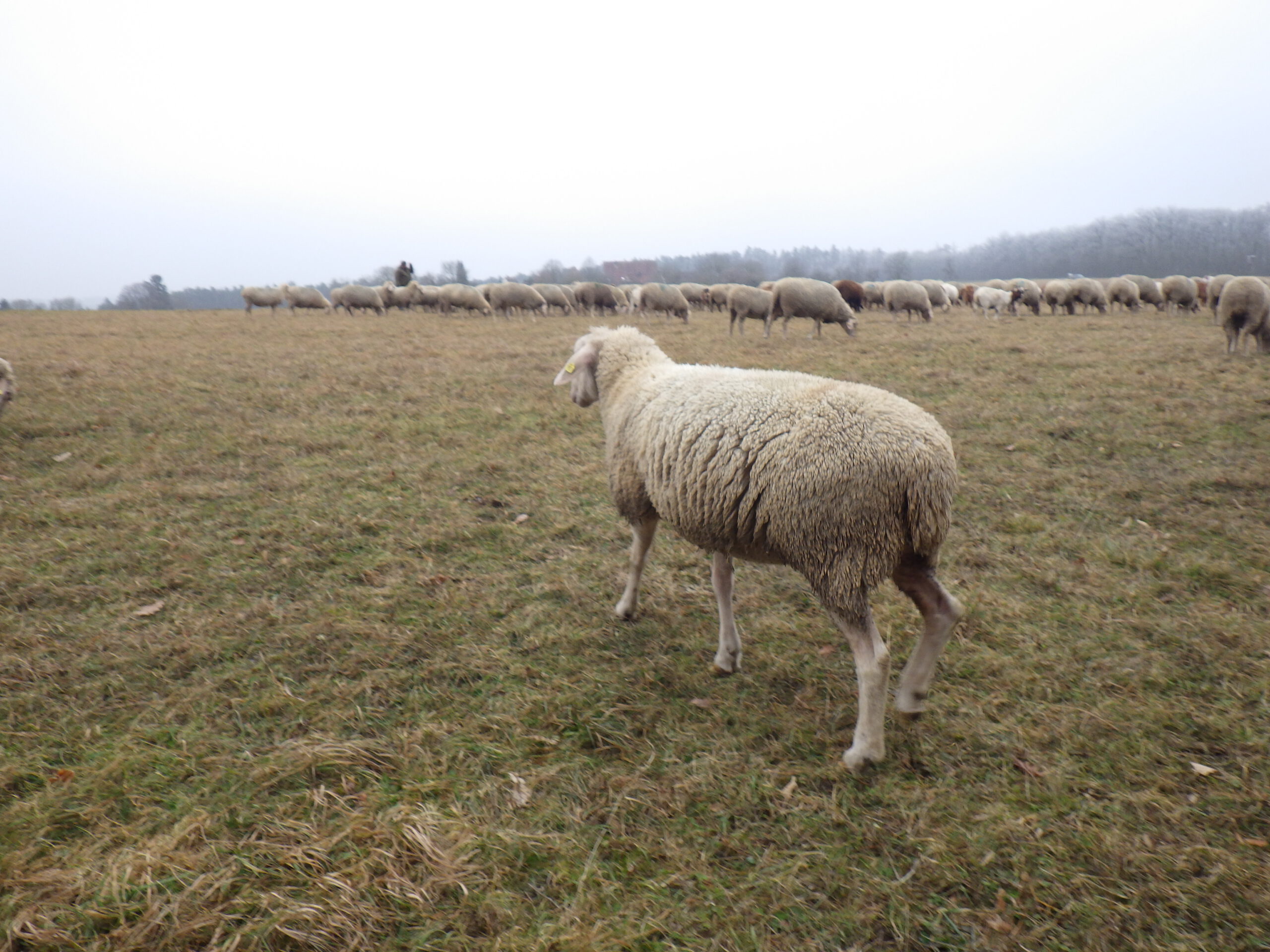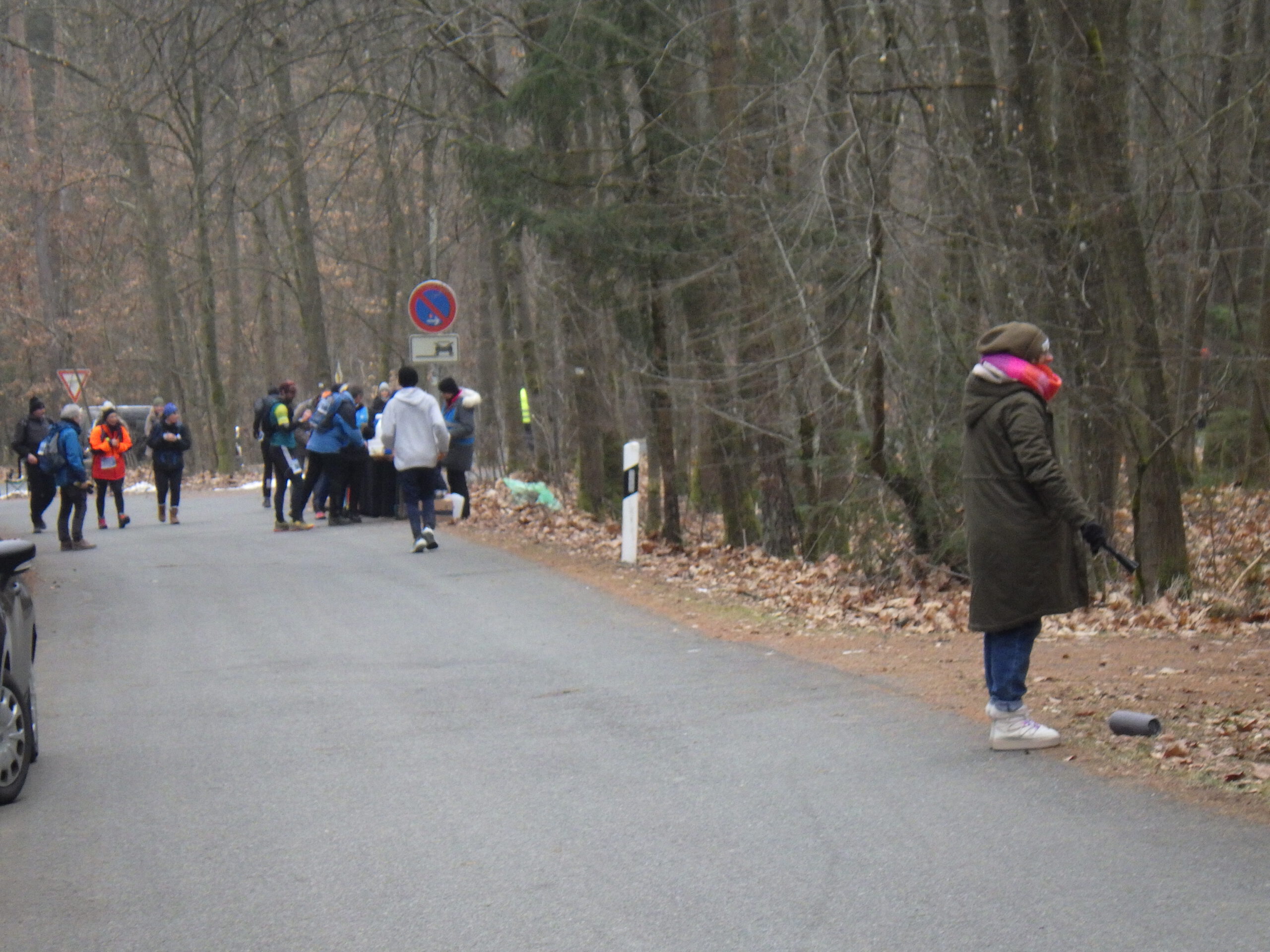 Dann ging es durch den Wald am Regelsberg bis zum Ufer des Brombachsees, wo es nach kurzer Strecke auf einer völlig vereisten Straße, wieder den Berg hoch ging. Dann folgte der VP (es gab nur einen) und die Streckenteilung. Ich lief mit einem Apfelstück und einem Schokoriegel mit Yeti-Trail-Aufkleber weiter die Straße entlang den Berg hoch. Oben gab es dann heißes Magnesium-Wasser aus meiner Thermoskanne und ich guckte mir die neugierigen Tiere an.