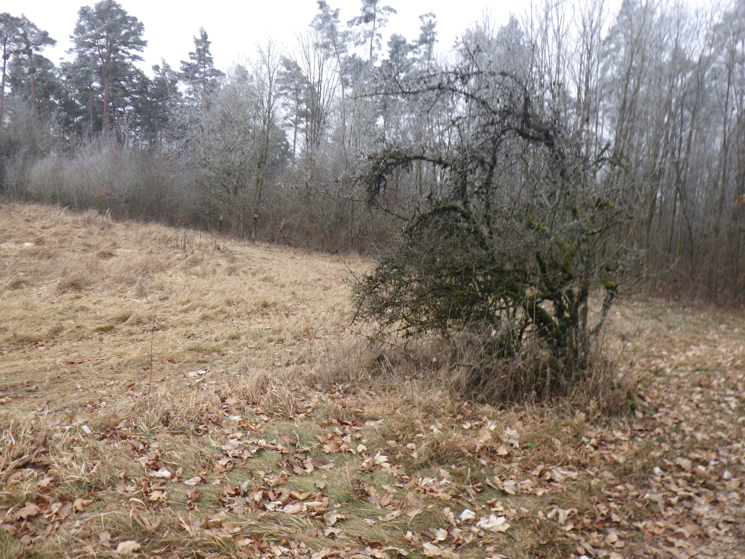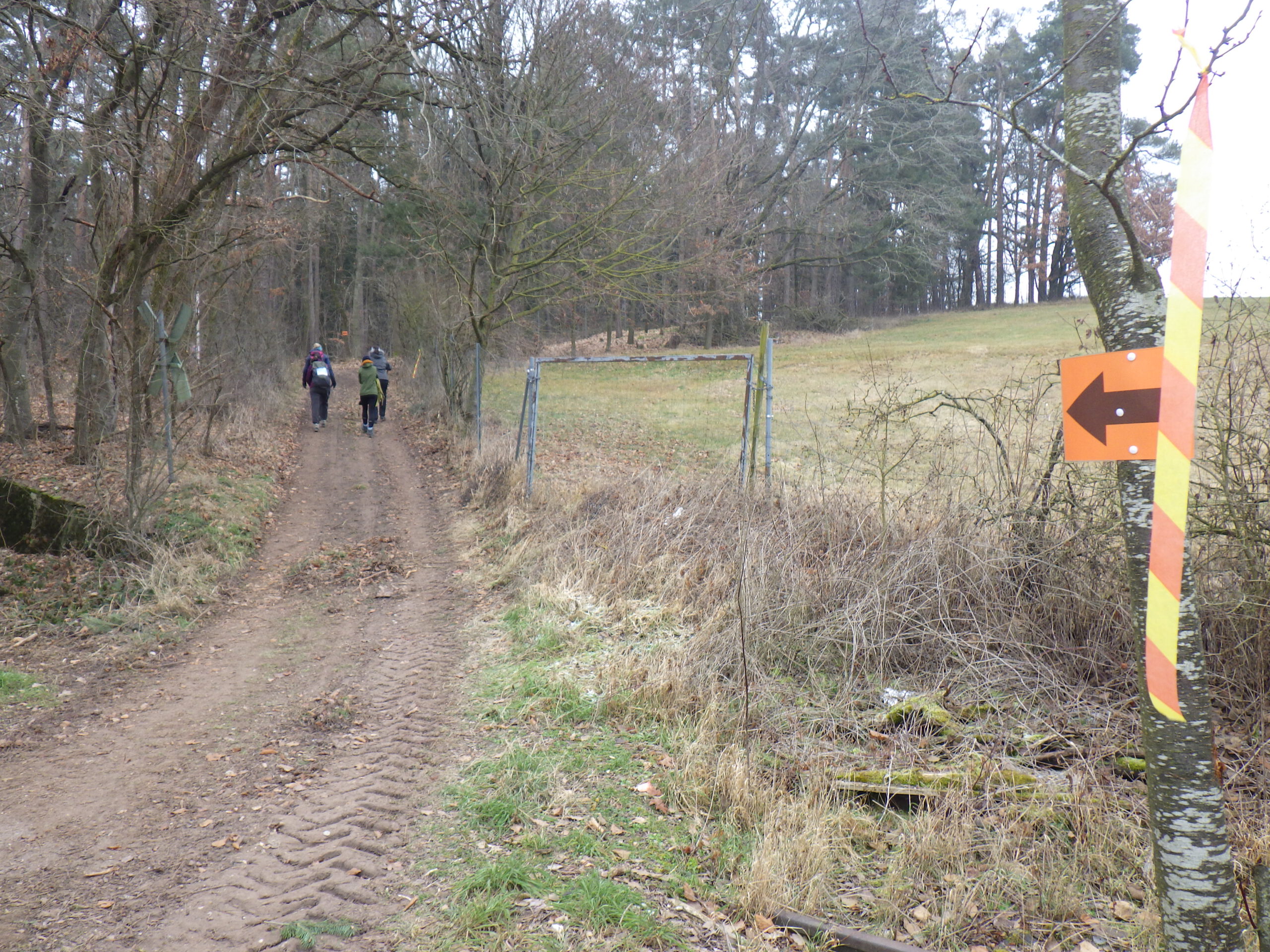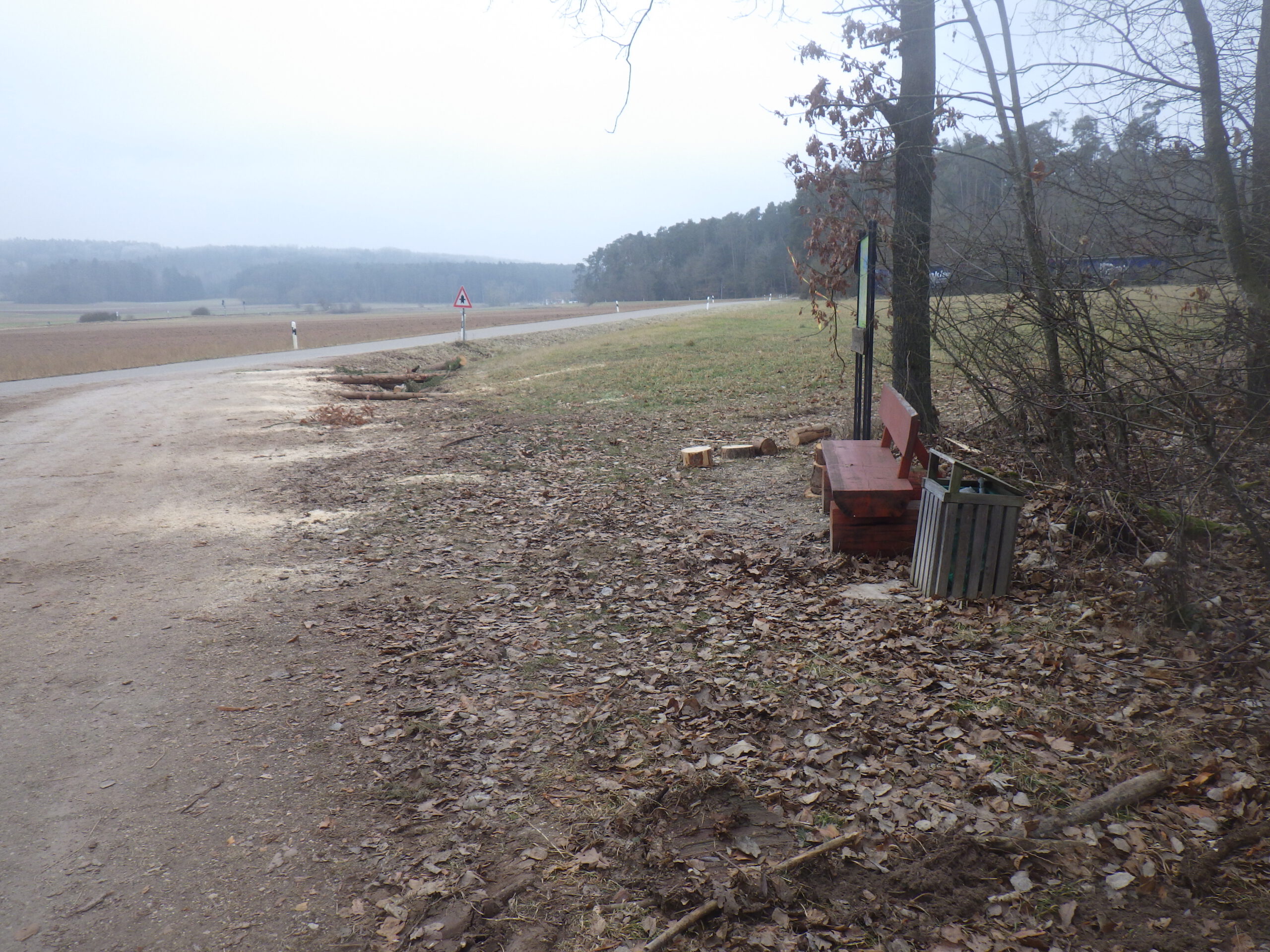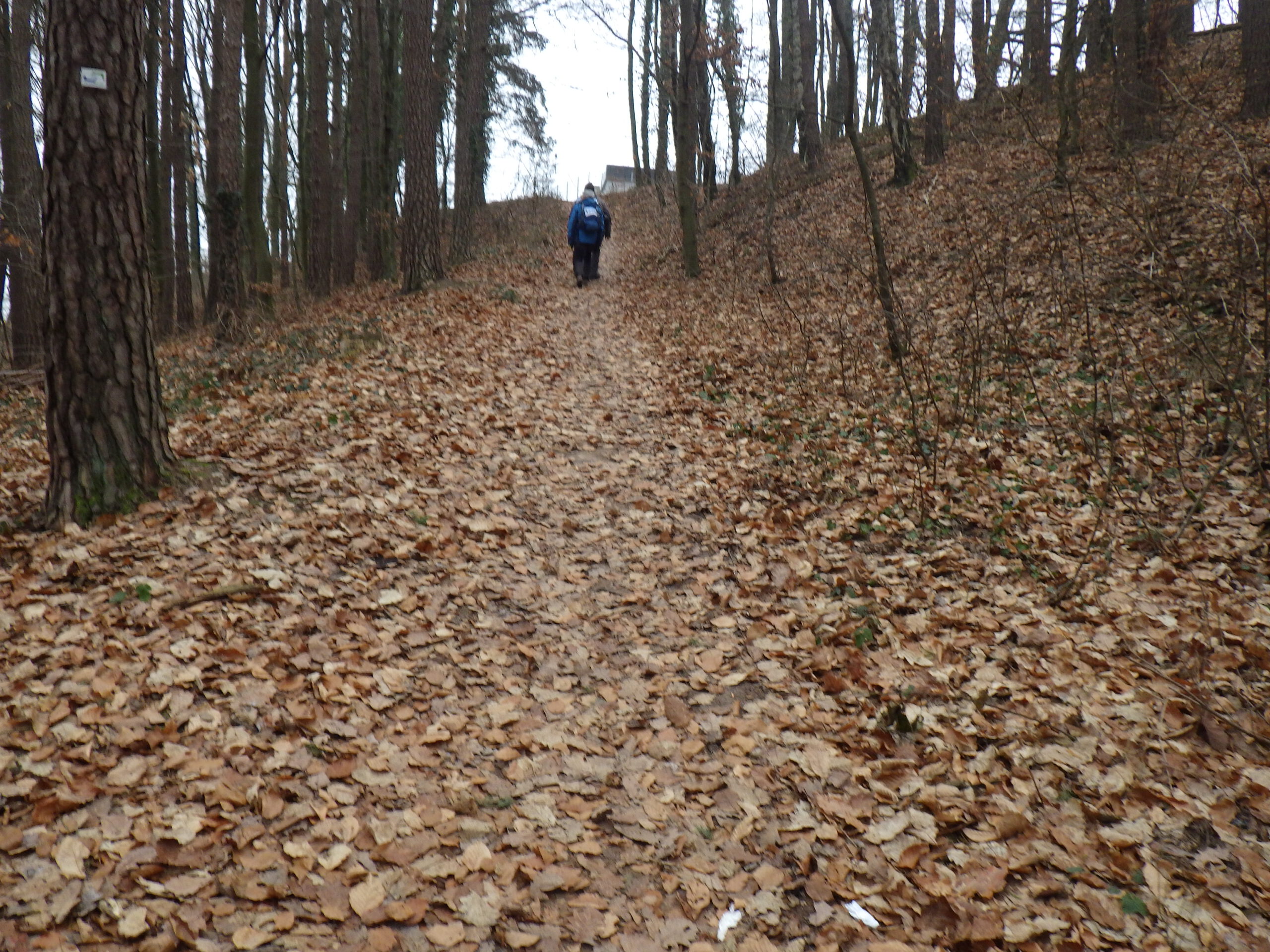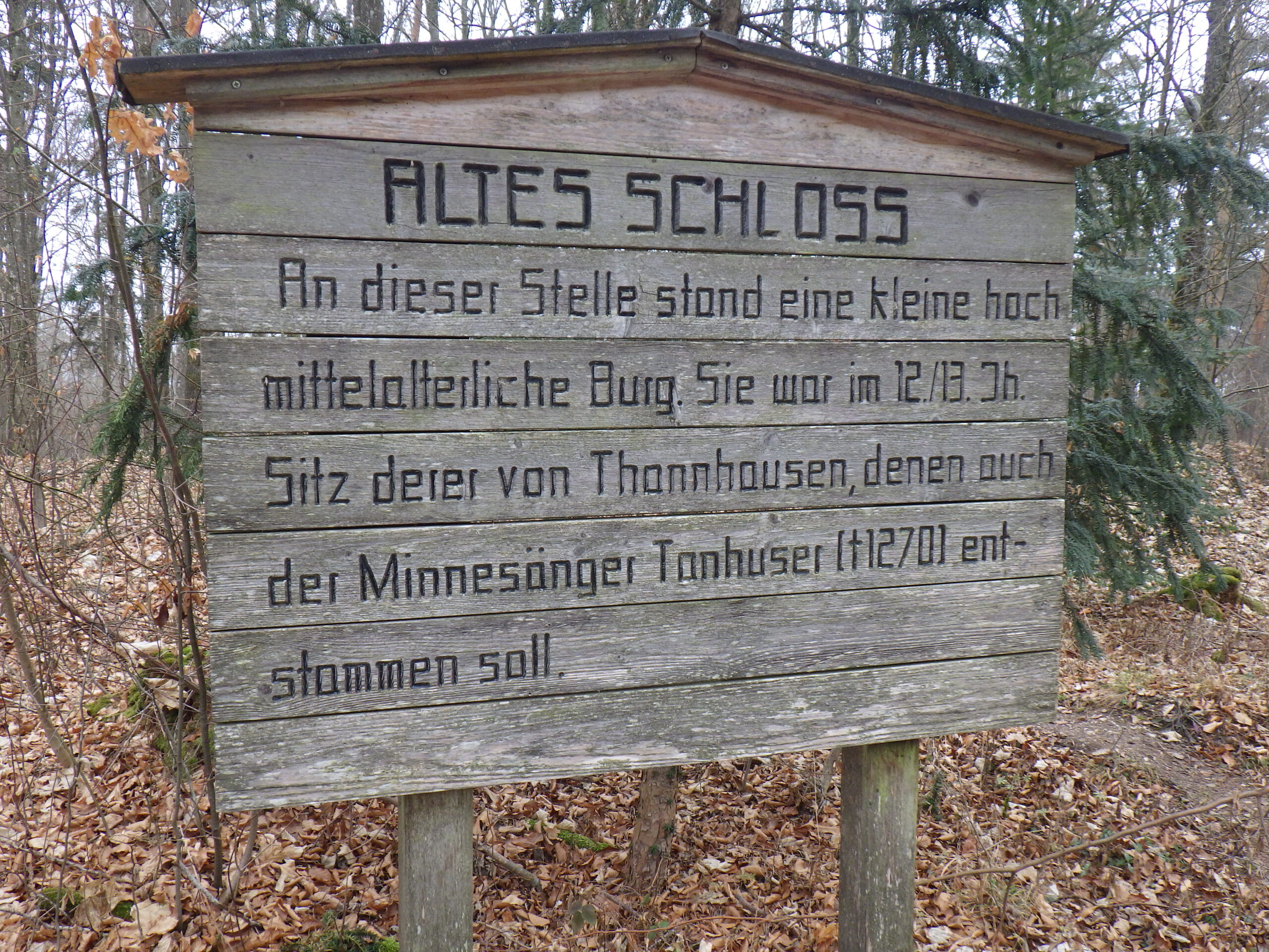 An einer Wegbiegung stand dann eine Bank und ich machte mal eine kleine 10-Minuten-Sitzpause. Nun war die zweite Thermosflasche fällig: heißes Wasser mit isotonischem Getränkepulver. Ein bisschen war die Motivation im Keller, denn danach ging es schon wieder aufwärts. Nochmal hinauf auf den Weißenberg (485 Meter). Zwischendurch verwies ein Schild mit dem Titel „Altes Schloss“ auf die Reste einer Ritterburg. Ich summte Mussorgski.