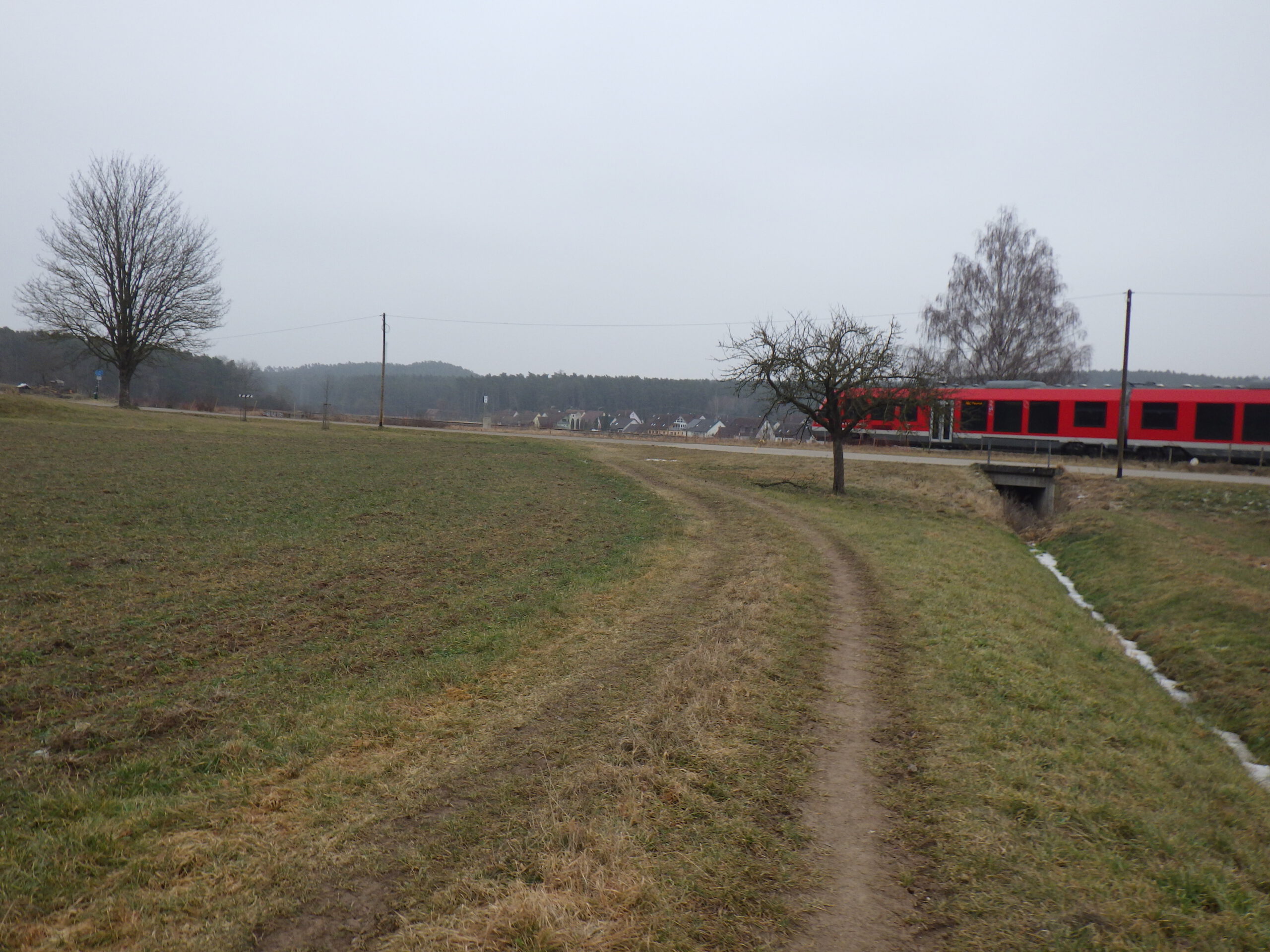 Dann führte der Weg zum Regelsberg und dem dortstehenden Gehöft, bevor der Weg nach rechts abbog und wieder hinunter zur Bahnlinie bei Veitserlbach führte. Dann ging es natürlich wieder bergauf, teils auf einem Single-Trail zum VP. Der Komoot-Track war ein Witz – es stimmte irgendwie so gut wie nichts. Am VP trank ich einen Becher kalte Cola und einen Becher heißen Tee. Und dann ging es auch gleich weiter.