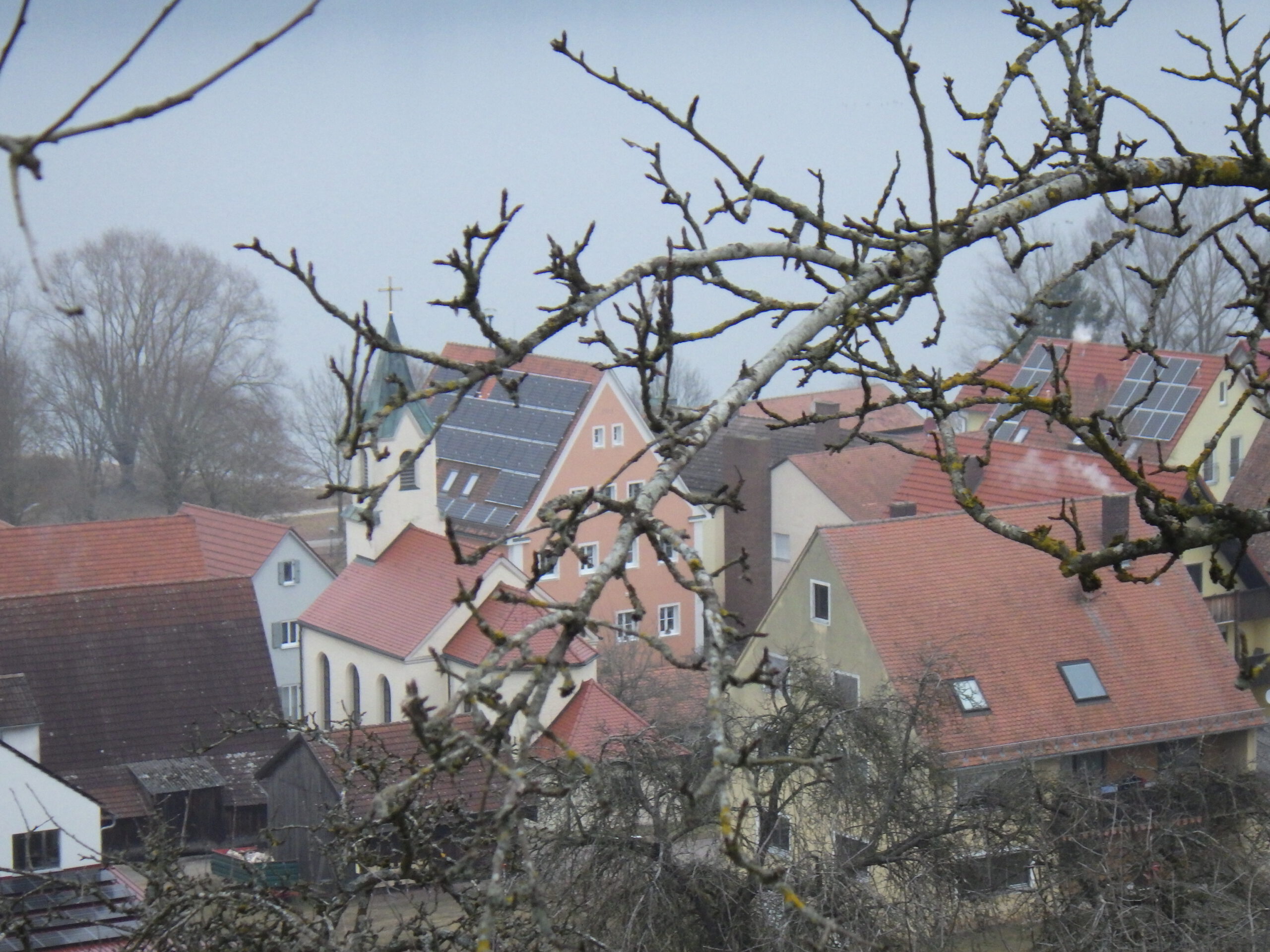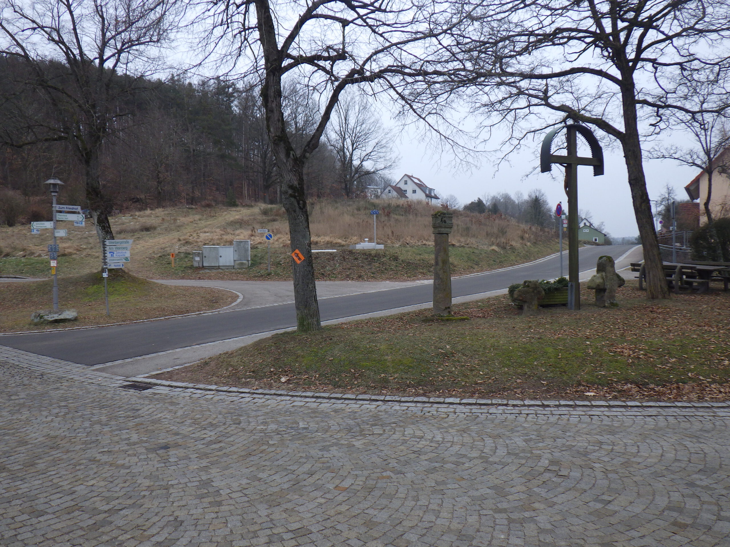 Einige hundert Meter ging es wieder abwärts. Dann folgte eine Straßenkreuzung in Ramsberg mit einem Steinkreuz, einem Holzkreuz, zwei Wegweisern und vier Trafokästen. Und zwei orangenen Schildern, die nach oben wiesen. Es ging nun den Weinberg hinauf. Oben wartete der Wasserhochbehälter. Sah eher aus wie ein Atombunker. Brutalistischer Sichtbeton. Daneben für die Himmelsbeobachtung die St. Jakobus Kapelle und die Sternwarte Ramsberg. Was für eine Aussicht…