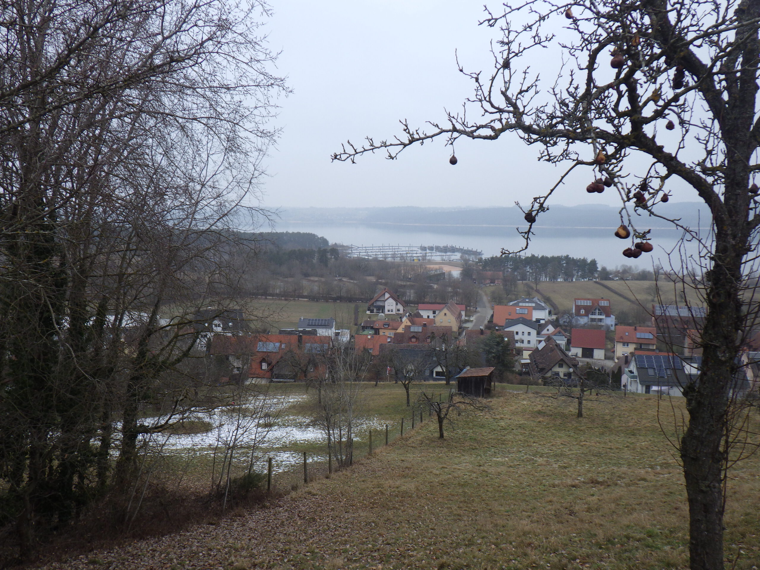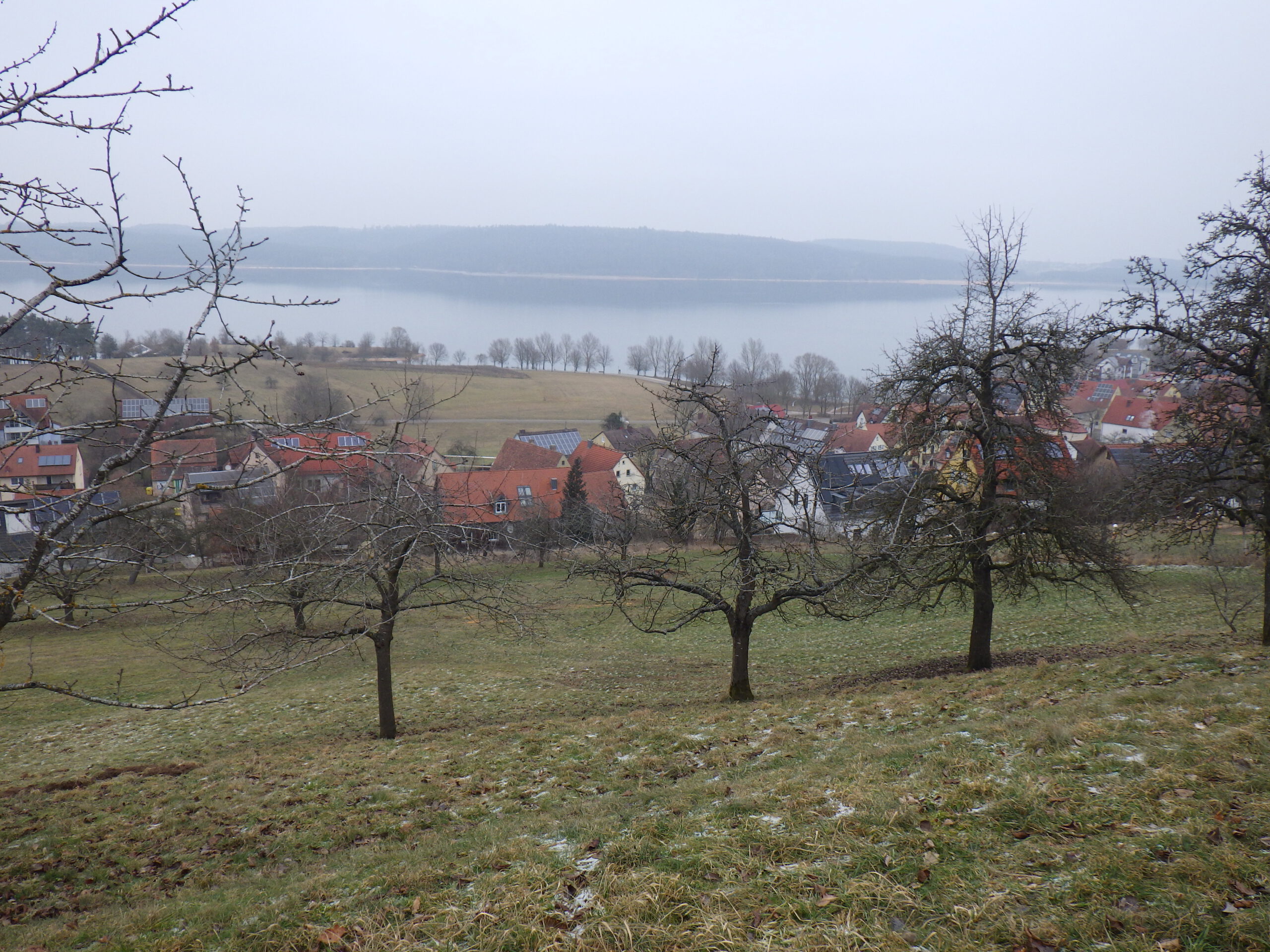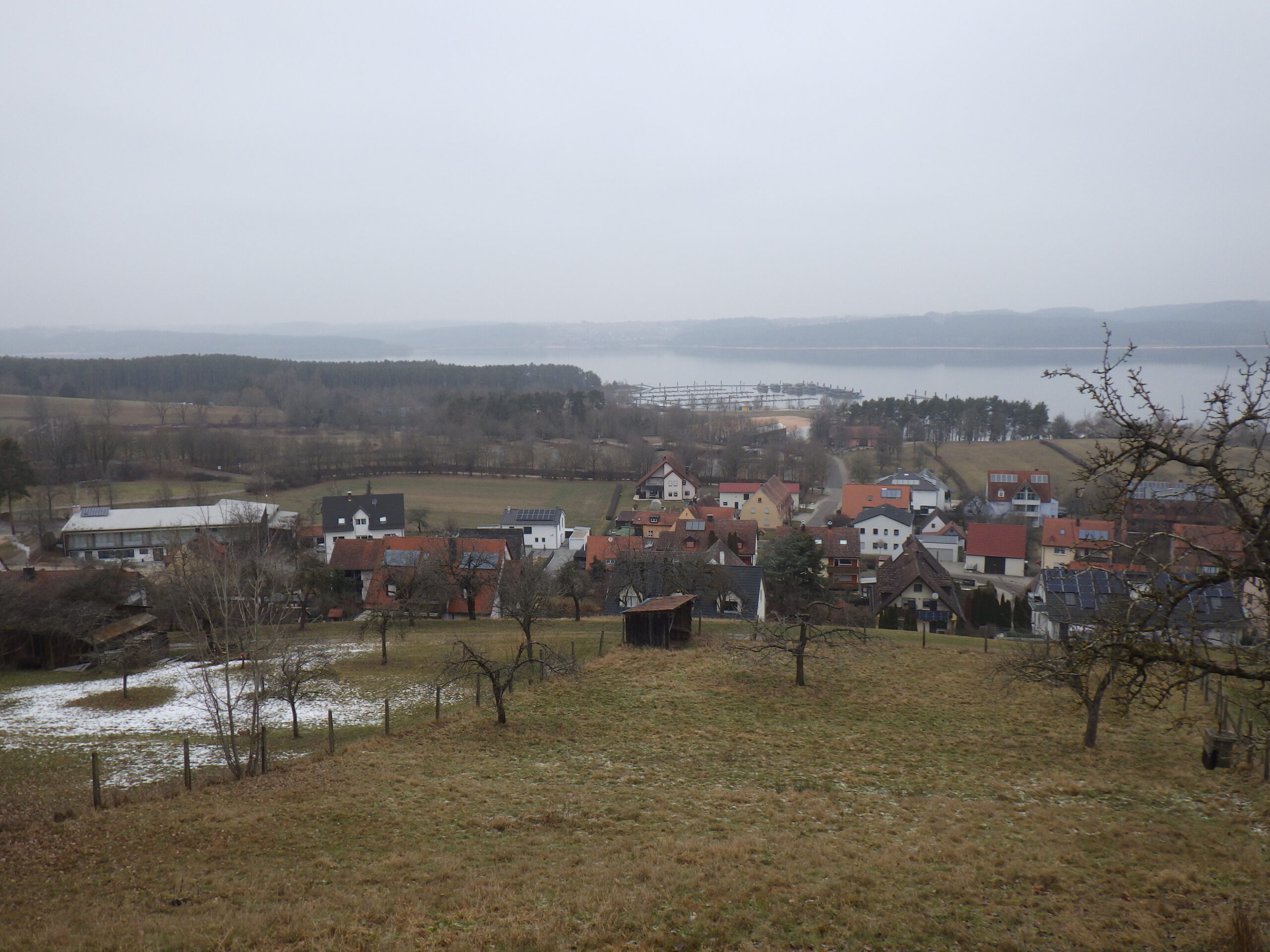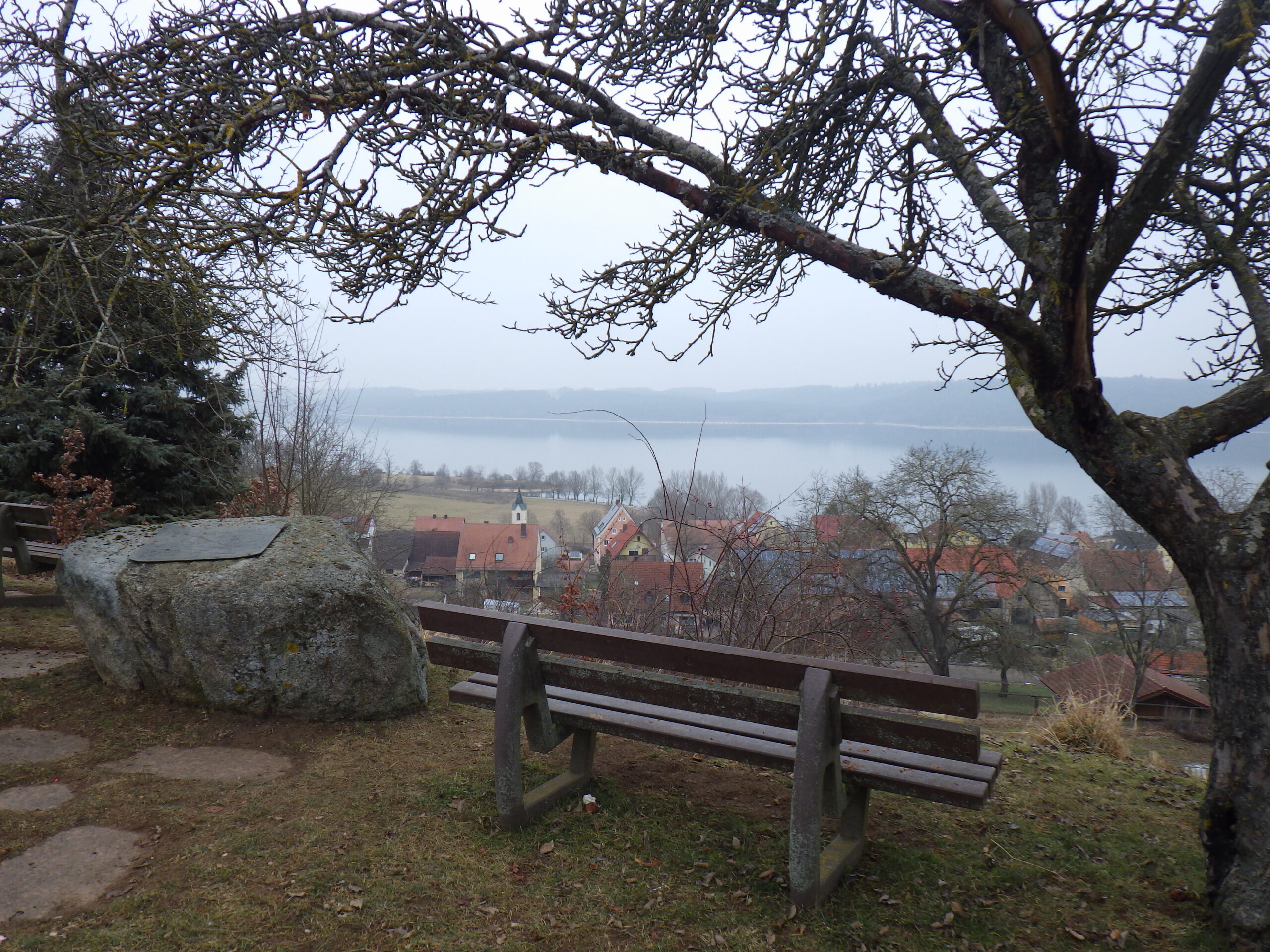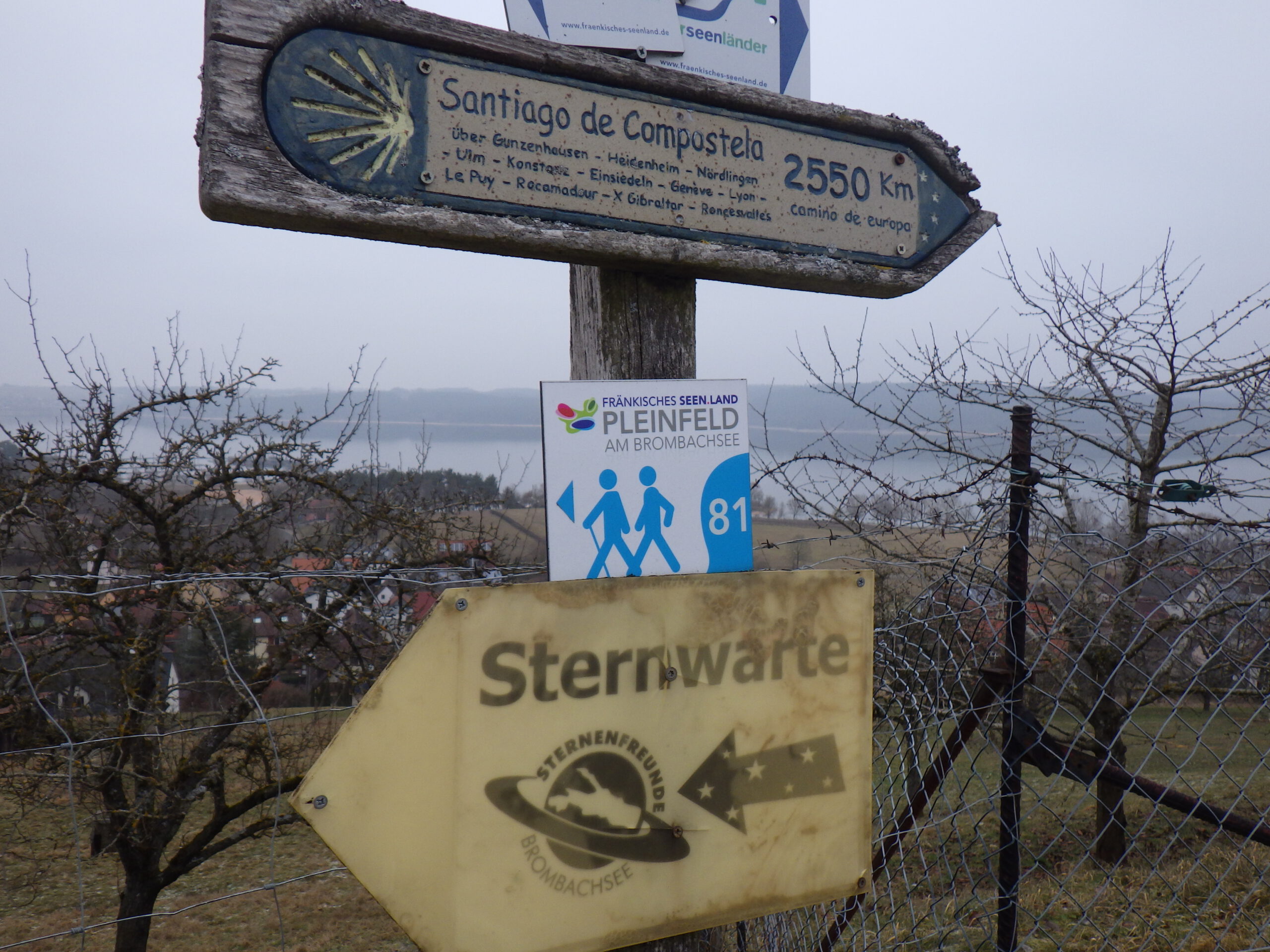 Für diese Aussicht hat sich der Aufstieg schon gelohnt. Ich machte ein paar Fotos. Sah schon sehr spektakulär aus, wie der Brombachsee im Nebel lag. Hier ist auch einer der vielen Jakobswege nach Santiago de Compostela. Die Sternwarte mit dem Schiebedach wurde durch viel ehrenamtliche Arbeit vor 20 Jahren errichtet und ermöglicht Himmelbeobachtungen in Süd-Richtung.