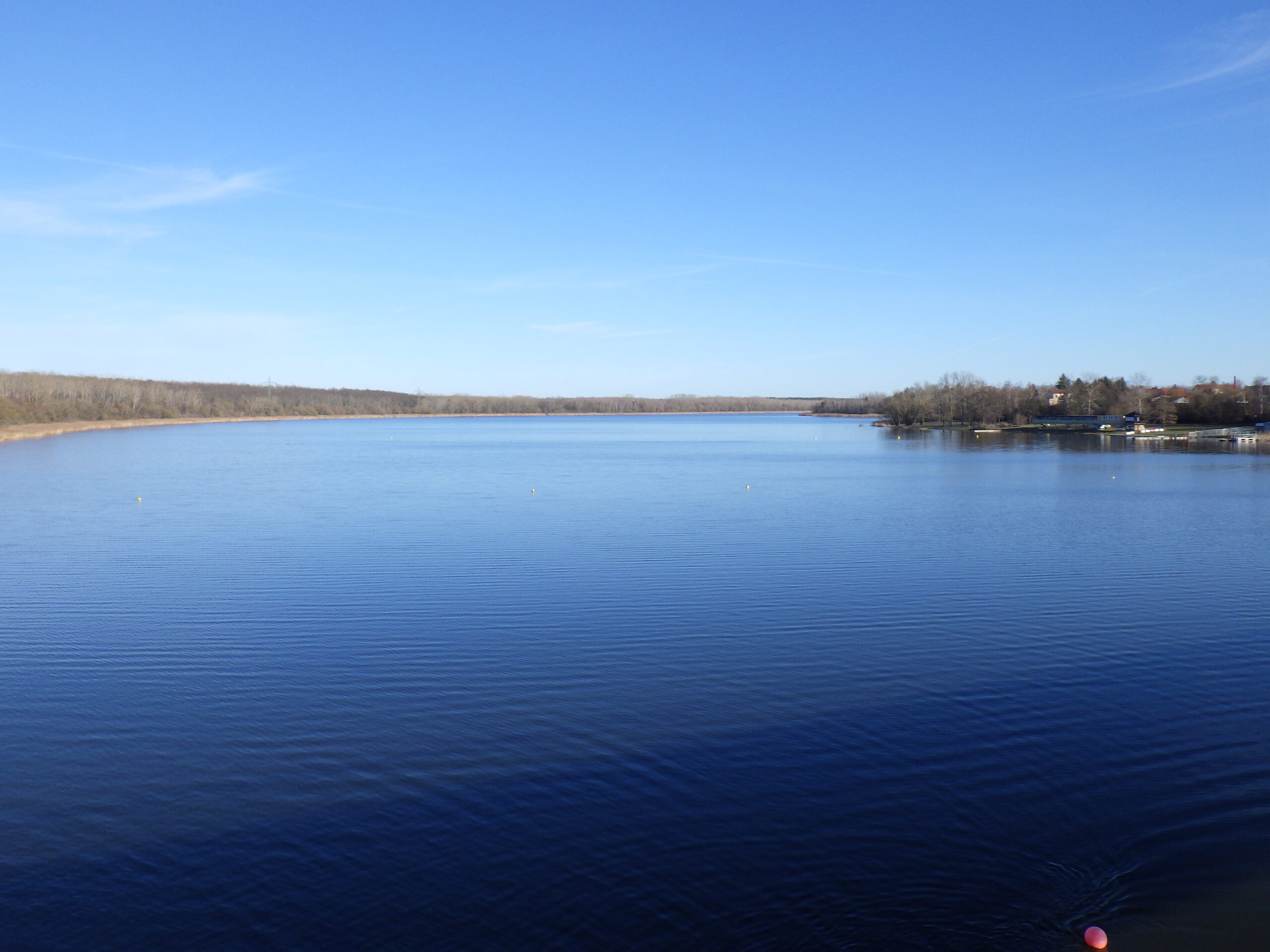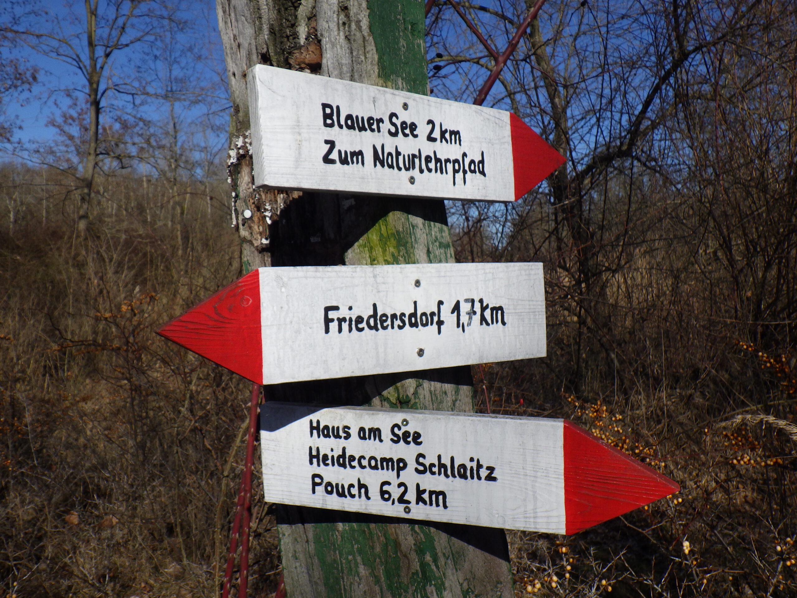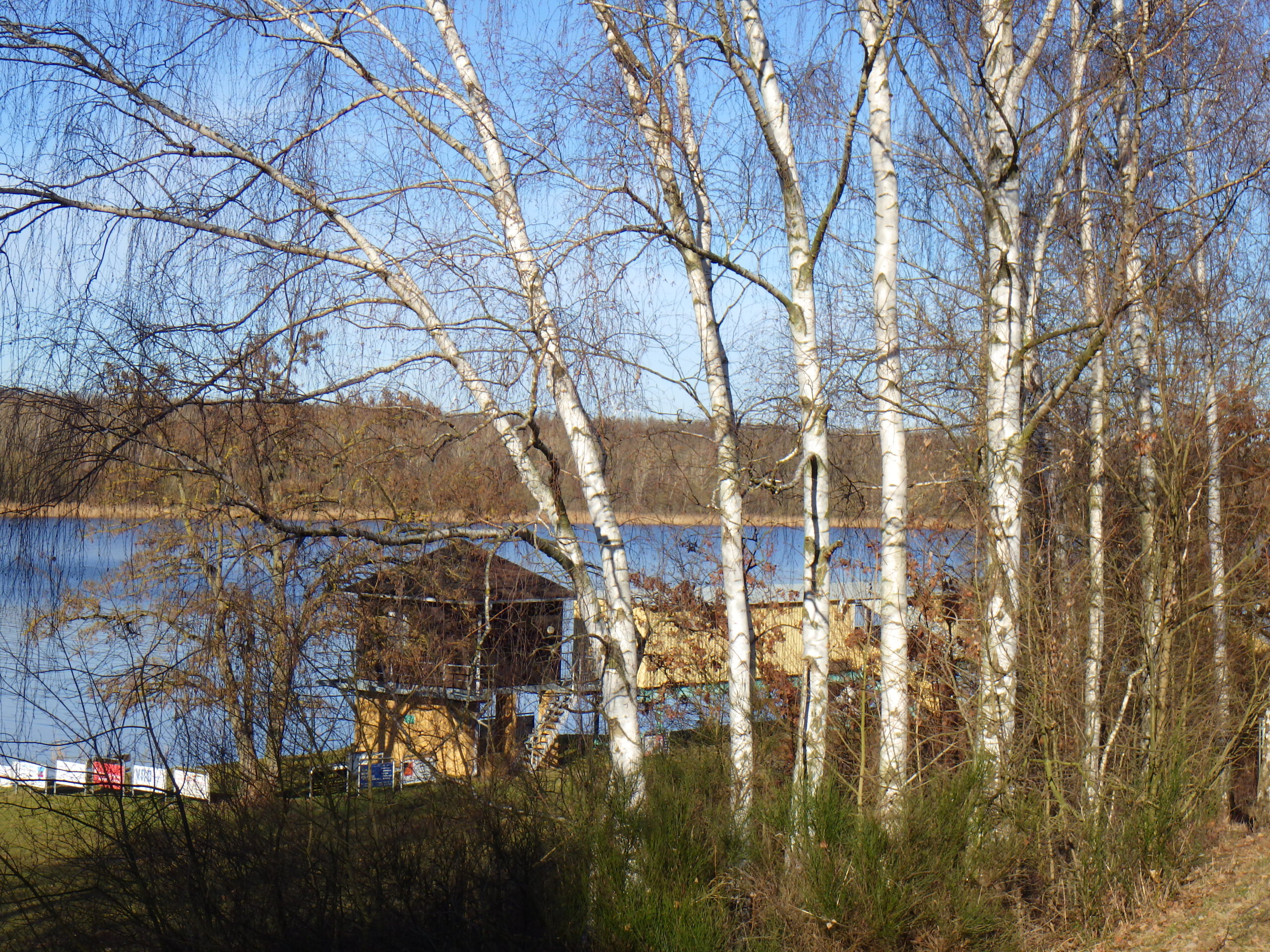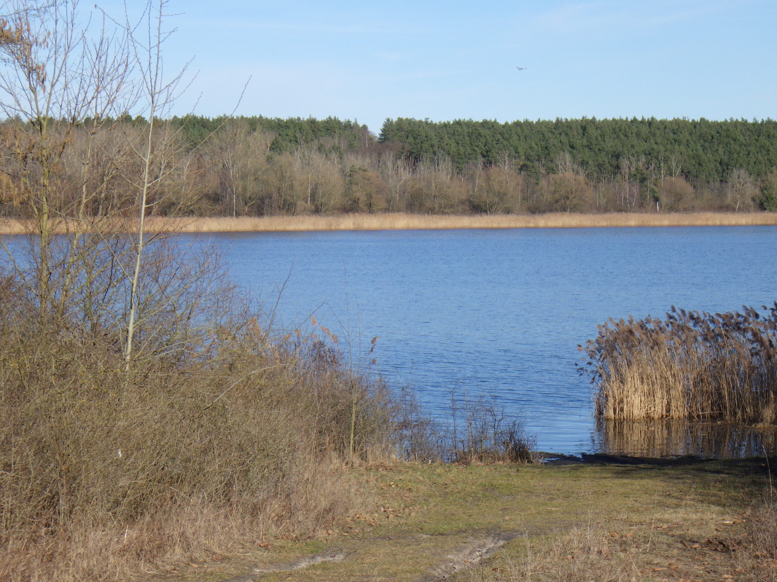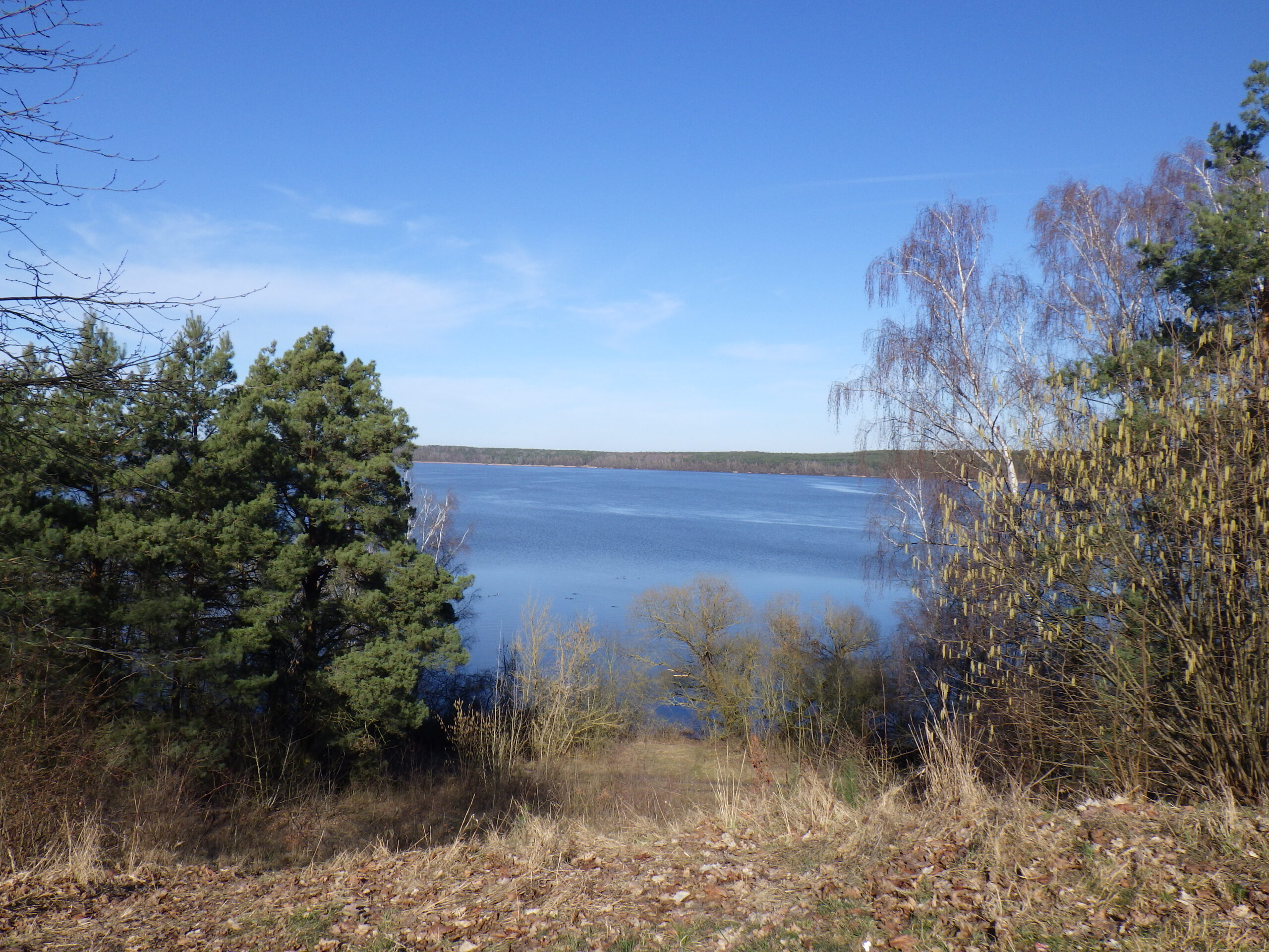 Ich stelle ja die Wandertracks nun immer bei Komoot ein. Daher mal ein Hinweis zum Weg: Diese Passage (von Kilometer 12 bis 15,5) sollte man nur zwischen September bis März laufen, da man sonst die brütenden Wasservogel stört. Einige der posierlichen Tierchen waren schon beim Nestbau. Eine Ausweichstrecke geht von Pouch über Mühlbeck nach Friedersdorf. Ich bin aber dreieinhalb Kilometer durchs Gestrüp. Zwischendurch schöne Aussichten auf den See (die Sonne stand nun besser).