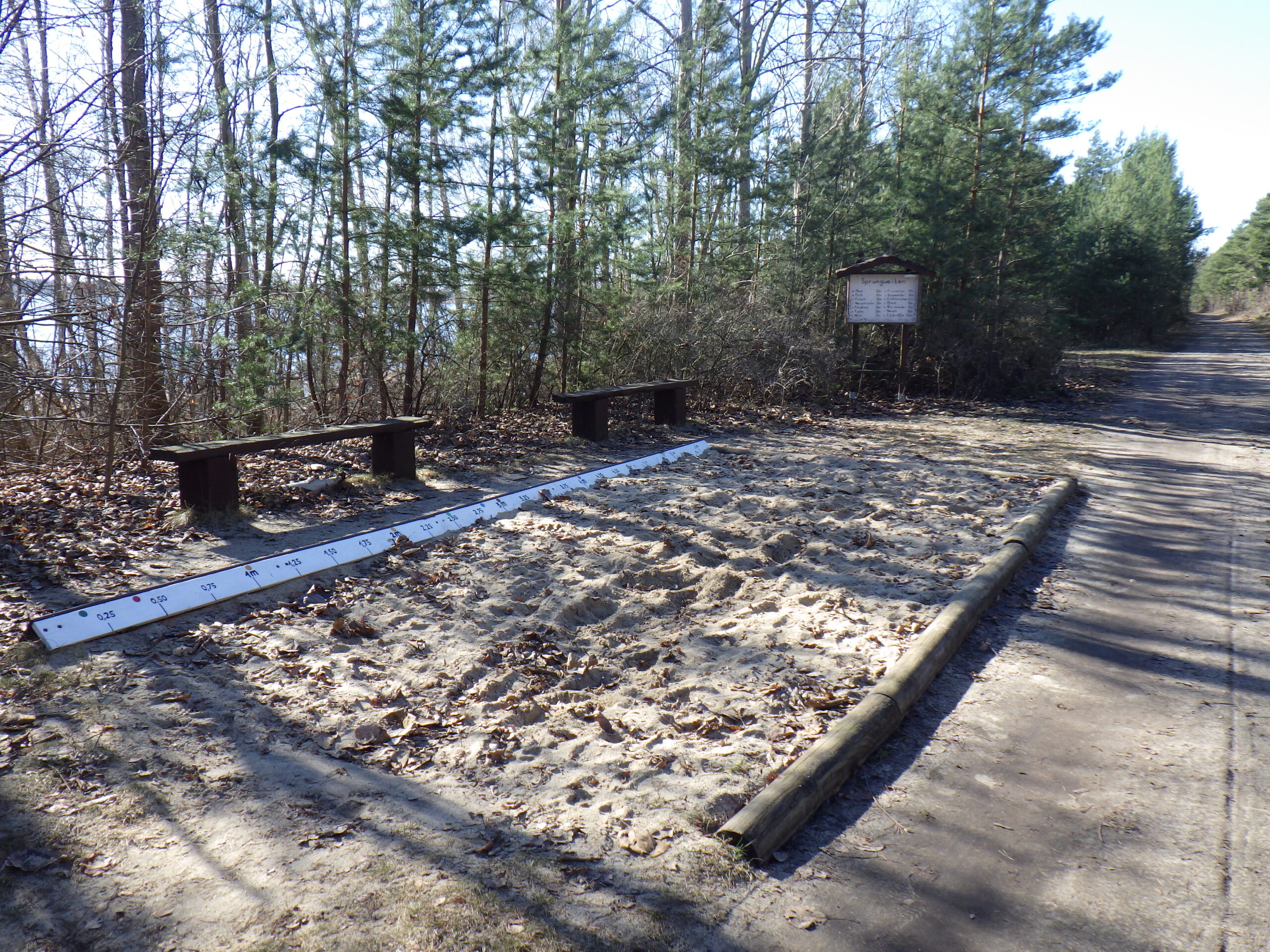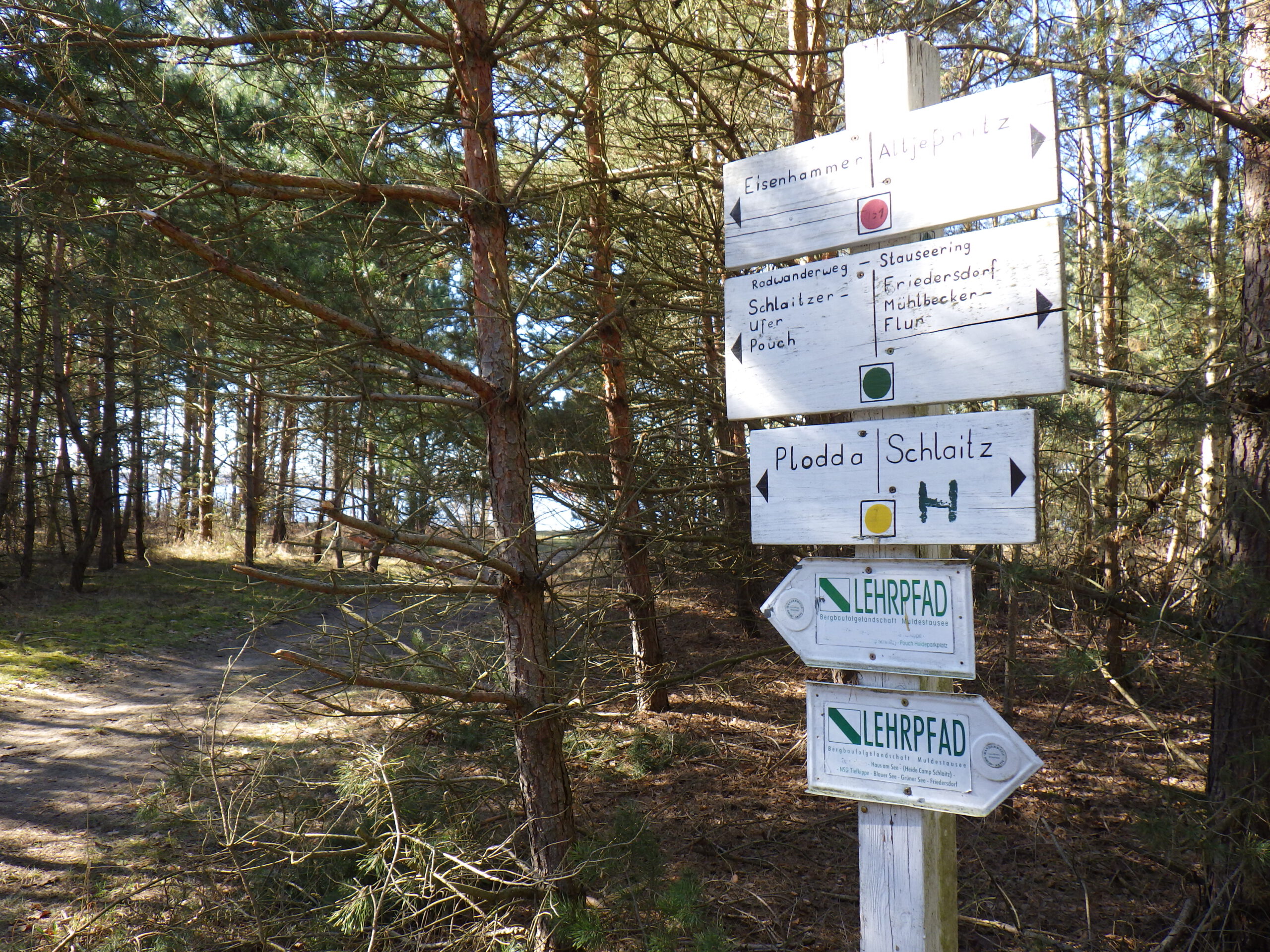 Auch an diesem See wollte man etwas für den Tourismus tun und hat an der Nordseite eine Art Lehrpfad angelegt. Leider war nicht herauszubekommen, welches Tier da Durchfall auf dem Weg hatte, aber es hat Körner gefressen. Naja, dafür gab es Fährtenkunde und eine Weitsprunganlage mit einer Tafel der Sprungweite von Tieren. Jedenfalls wurde kein Waldelephant gefunden. Am Anfang des Weges gab es Pionierbäume, später dann Kiefern und noch später Segler.