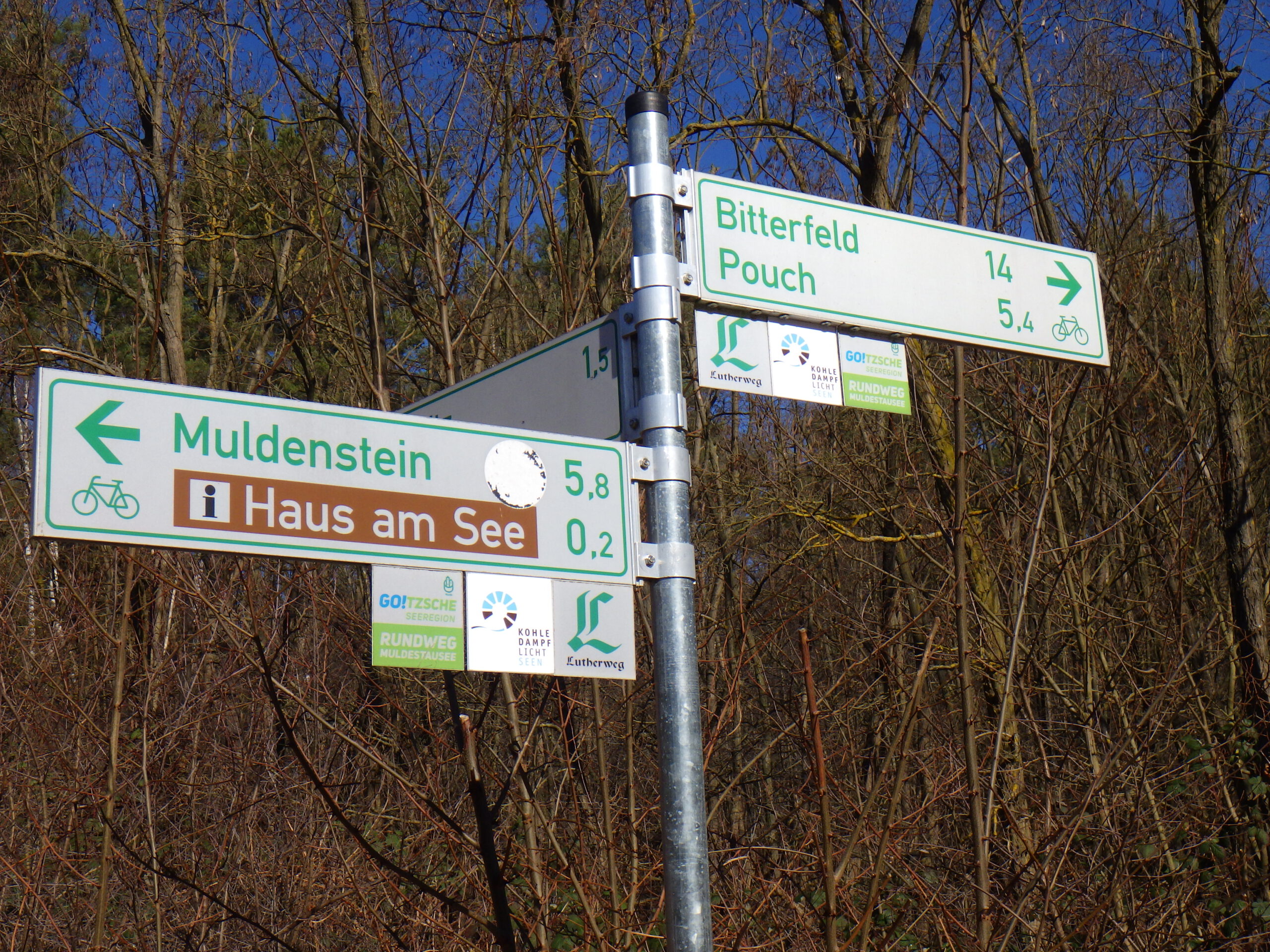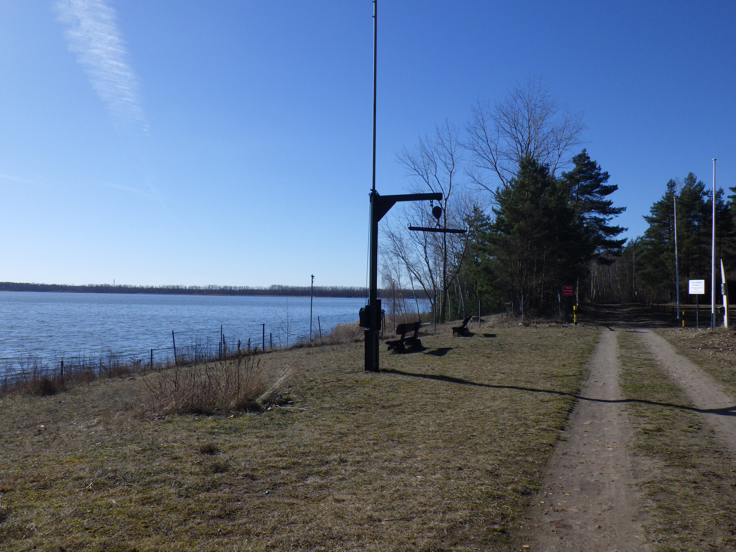 Der Muldesegler e.V. widmet sich dem Segeln, Surfen und Paddeln auf dem Muldestausee. Sie haben sich da sehr liebevoll eingerichtet, es gibt sogar einen kleinen Leuchtturm. An dieser Stelle hab ich mal die Jacke ausgezogen und bin im T-Shirt weitergelaufen. Schönes Sonnewetter bei 14°C. Die Wanderung war als kleiner Probelauf für den Mammutmarsch am Sonnabend geplant. Es ging aber eher gemütlich ans Wandern.
