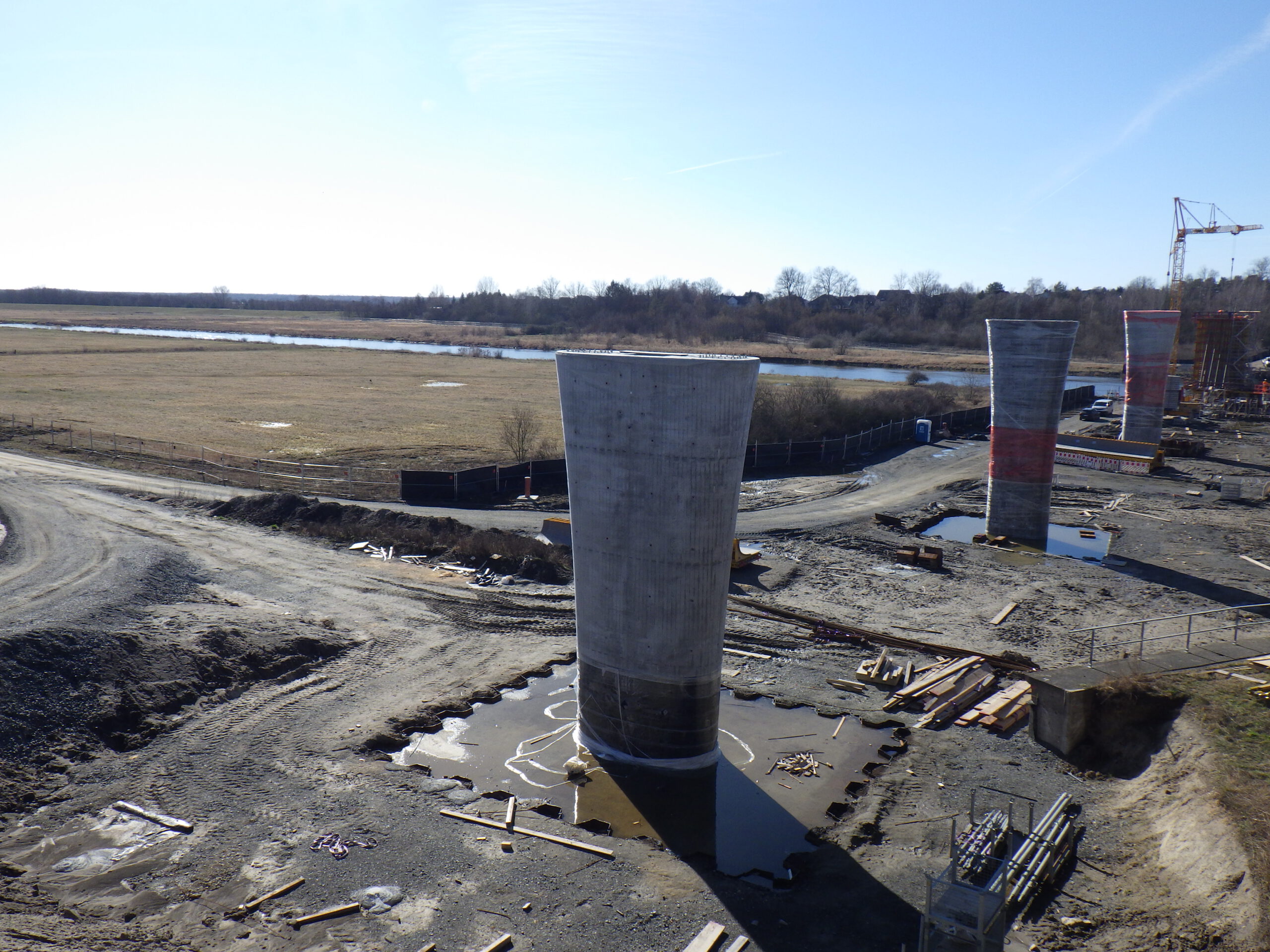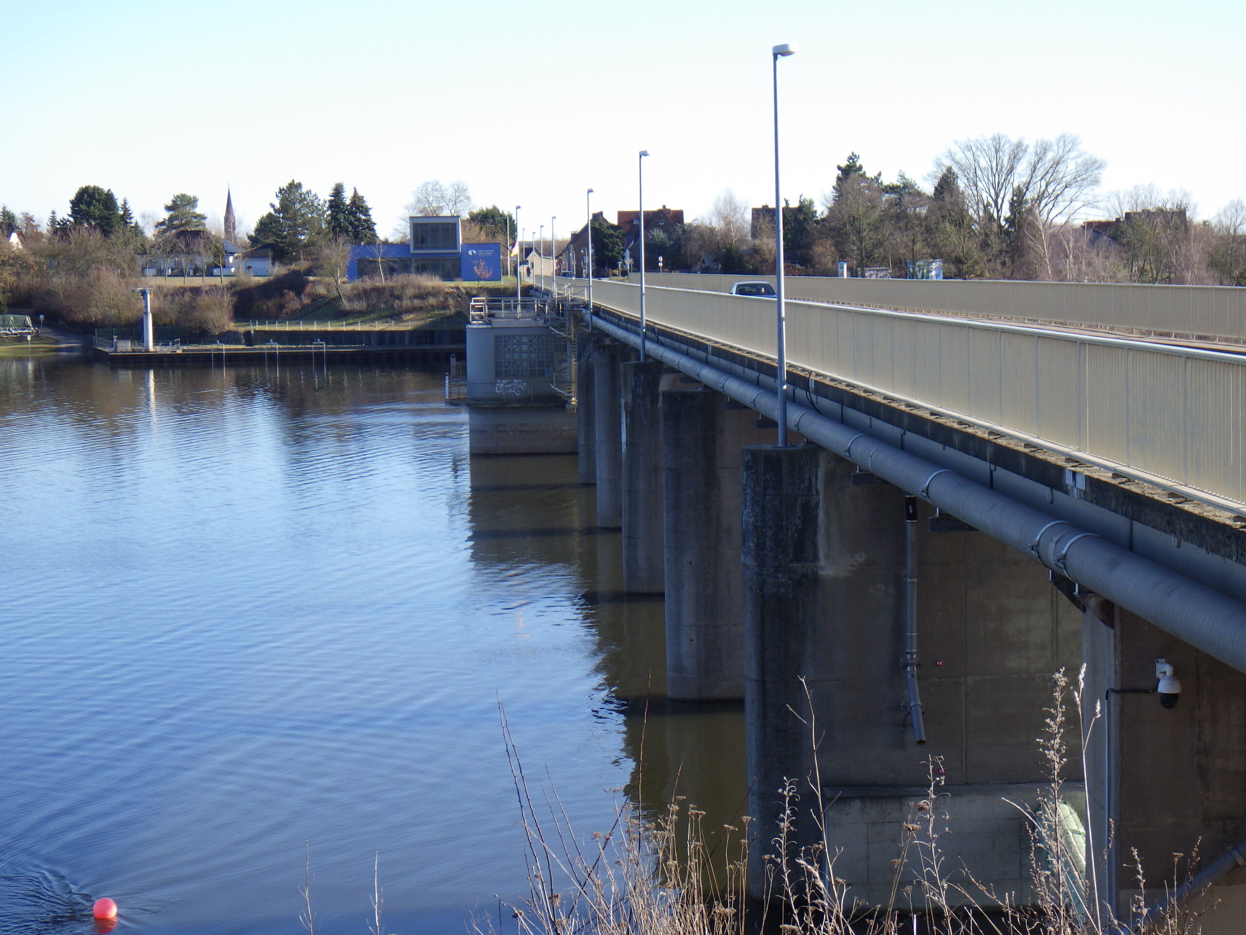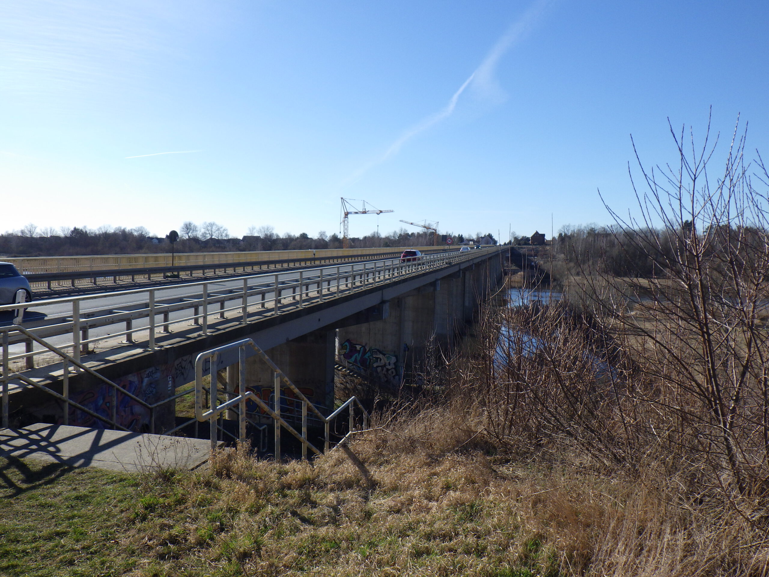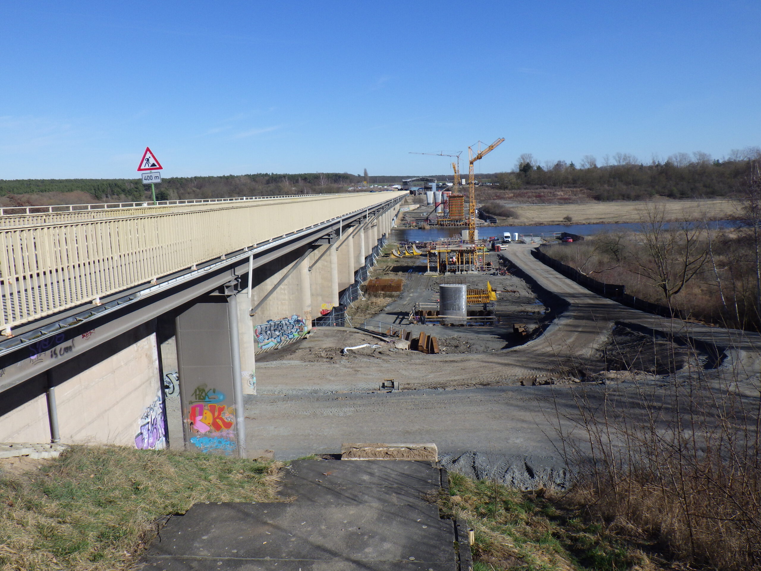 Nach ziemlich genau 10 Kilometern erreichte ich das Einlassbauwerk des Stausees. Dort ist die Bundesstraße 100, die in einer Brücke hinüber führt. Darüber bin ich früher mit dem Fahrrad nach Ferropolis gefahren. Die Brücke schafft den Verkehr nicht mehr und wird durch einen Neubau ersetzt. Es gibt eine große Halle für die Brückenelemente, die dann im Vorschub über die Pfeiler geschoben werden, von denen schon einige errichtet wurden.