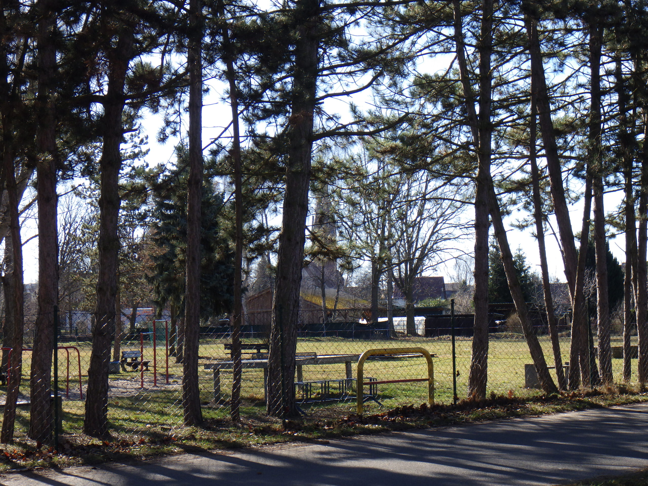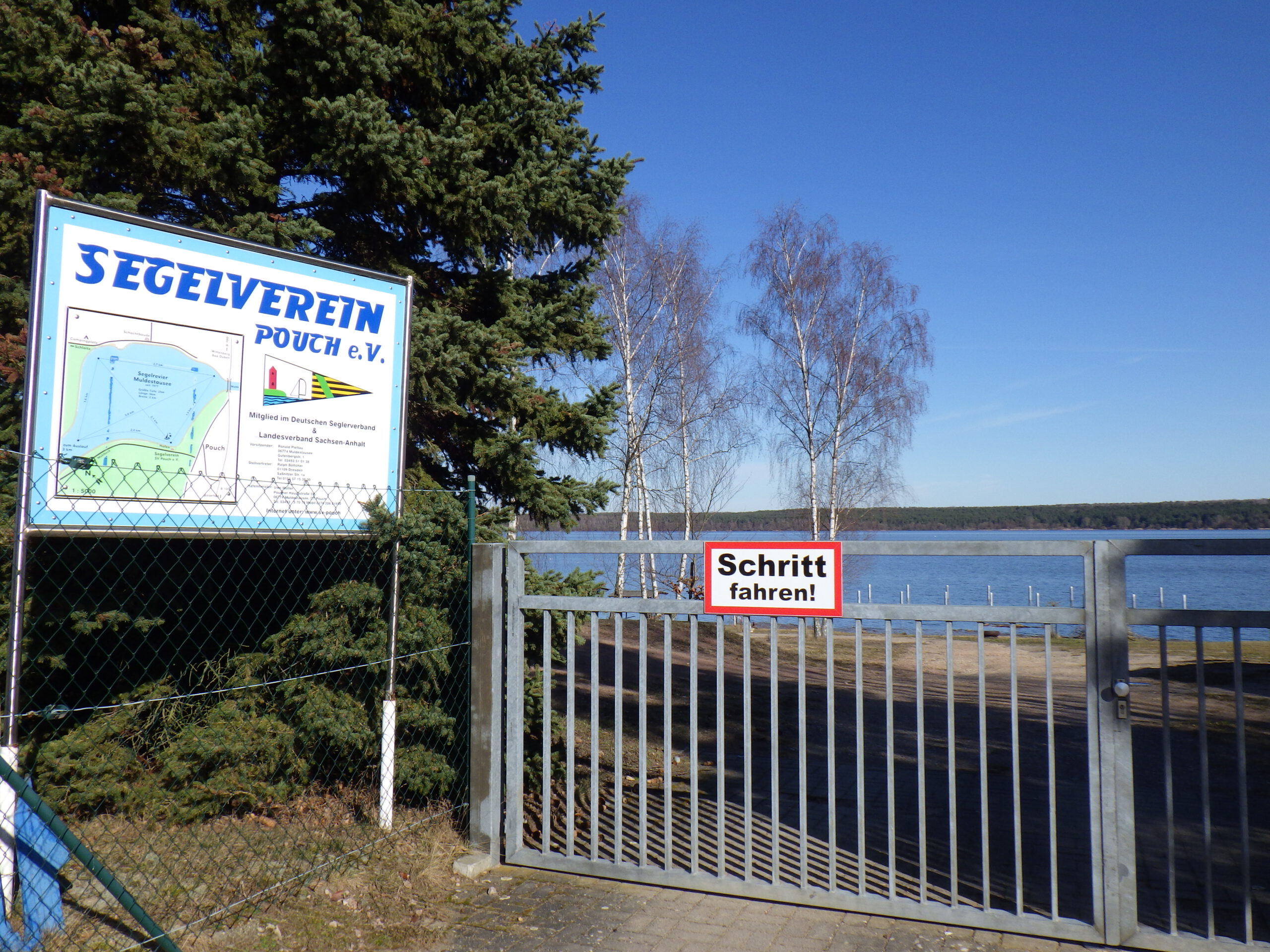 Leider konnte man am anderen Ende der Brücke nicht zum Uferweg hinunter, da die Treppen abwärts gesperrt waren. So bin ich dann oberhalb des Stausees durch Pouch gelaufen. Der Ort liegt auf einer Landzunge zwischen den ehemaligen Tagebauen Goitzsche und Muldenstein, also heute zwischen den beiden entstandenen Seen. Die Halbinsel Pouch (im Goitzschesee) habe ich vor etlichen Jahren zu Musikfestivals mit dem Fahrrad besucht. Damals fand dort das Splash und das Sputnik Spring Break statt.