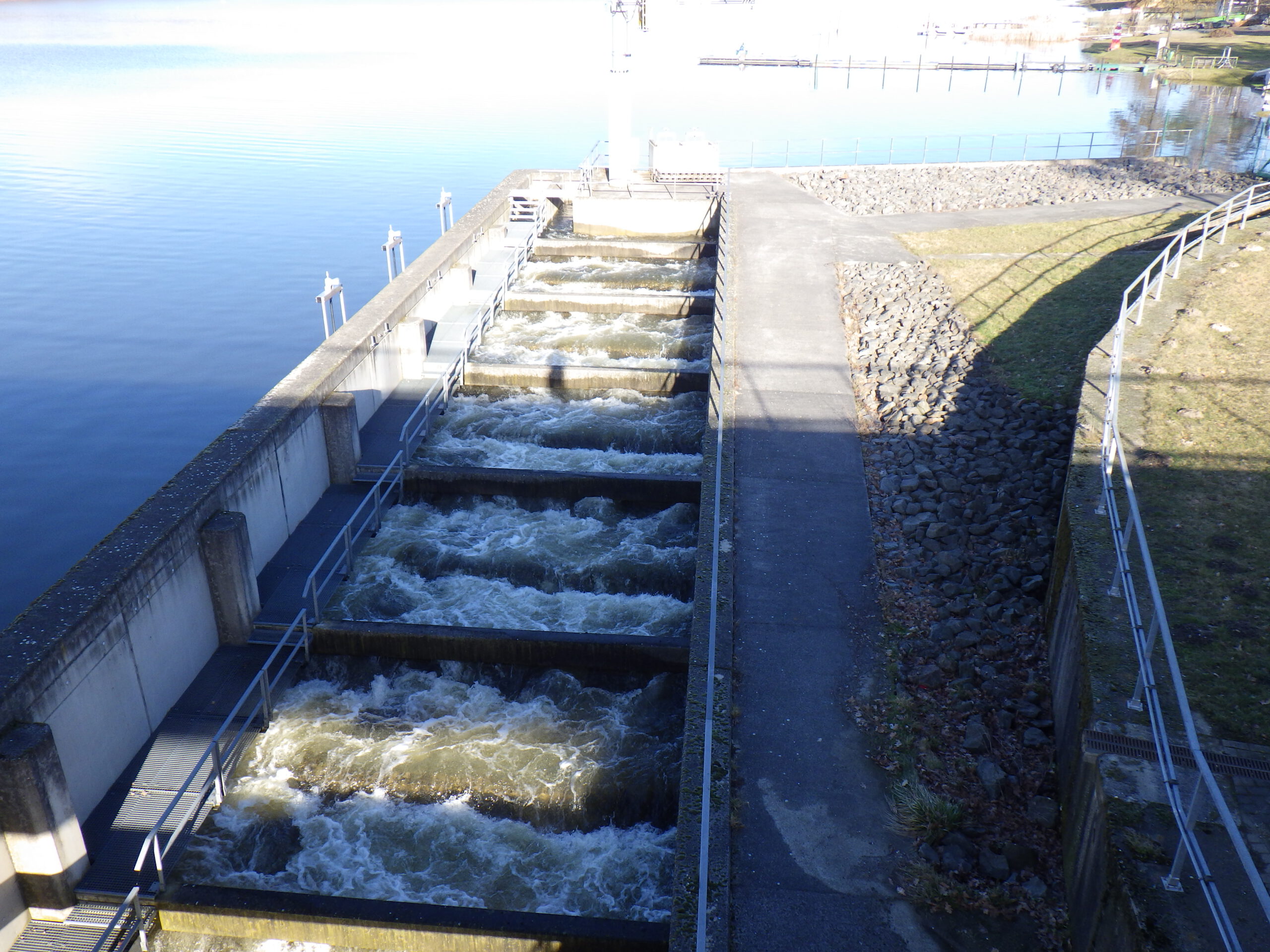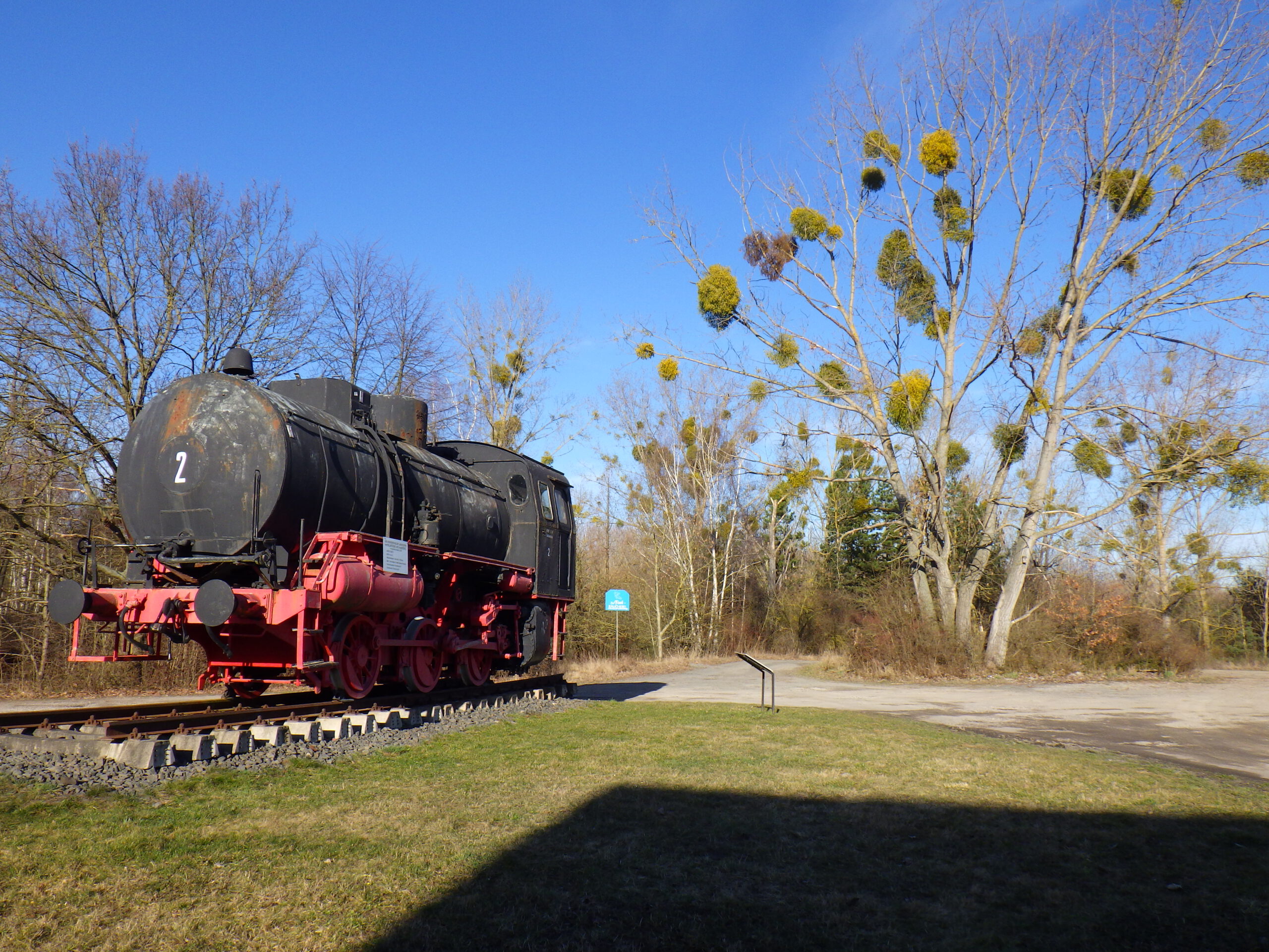 Auch über das Auslassbauwerk führt eine (viel befahrene) Straße. Es gab rechts eine Fischtreppe und links eine Anlage zur Stromerzeugung. Und auf der anderen Seite dann das Ziel, die schon bekannte feuerlose Lokomotive. Bis hierhin waren es dann 17,6 Kilometer und weiter bis zum Bahnhof dann 19 Kilometer. Dort erwischte ich die S-Bahn nach Leipzig zwei Minuten vor Abfahrt am trostlosen Bahnhof. Etwas langsam unterwegs, sonst eine schöne Wanderung.