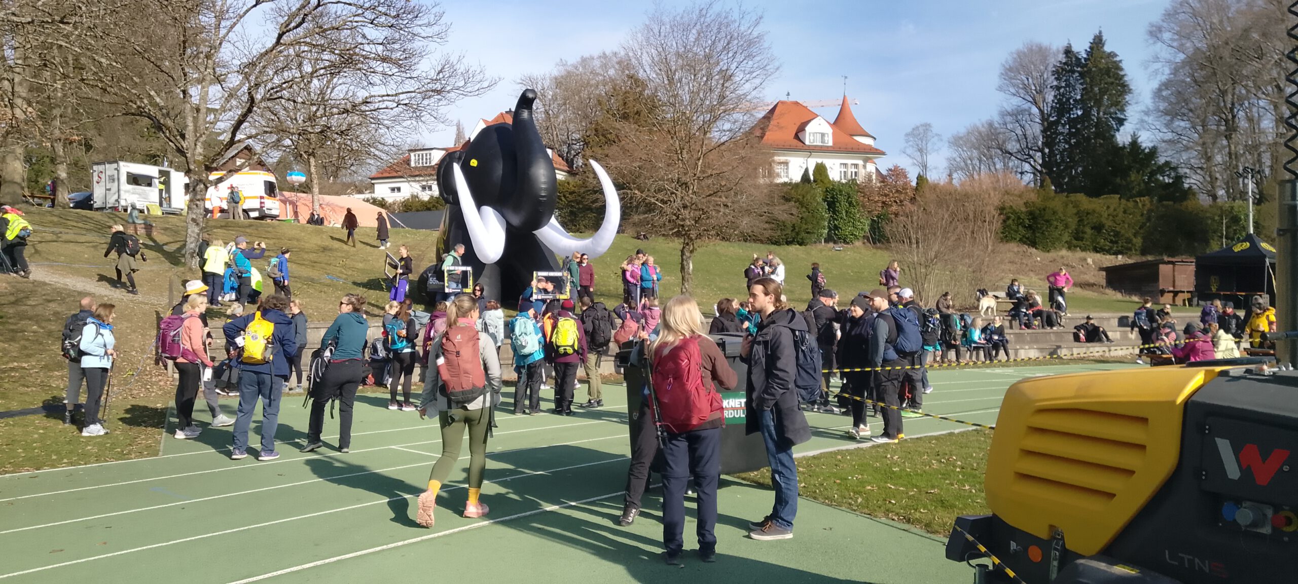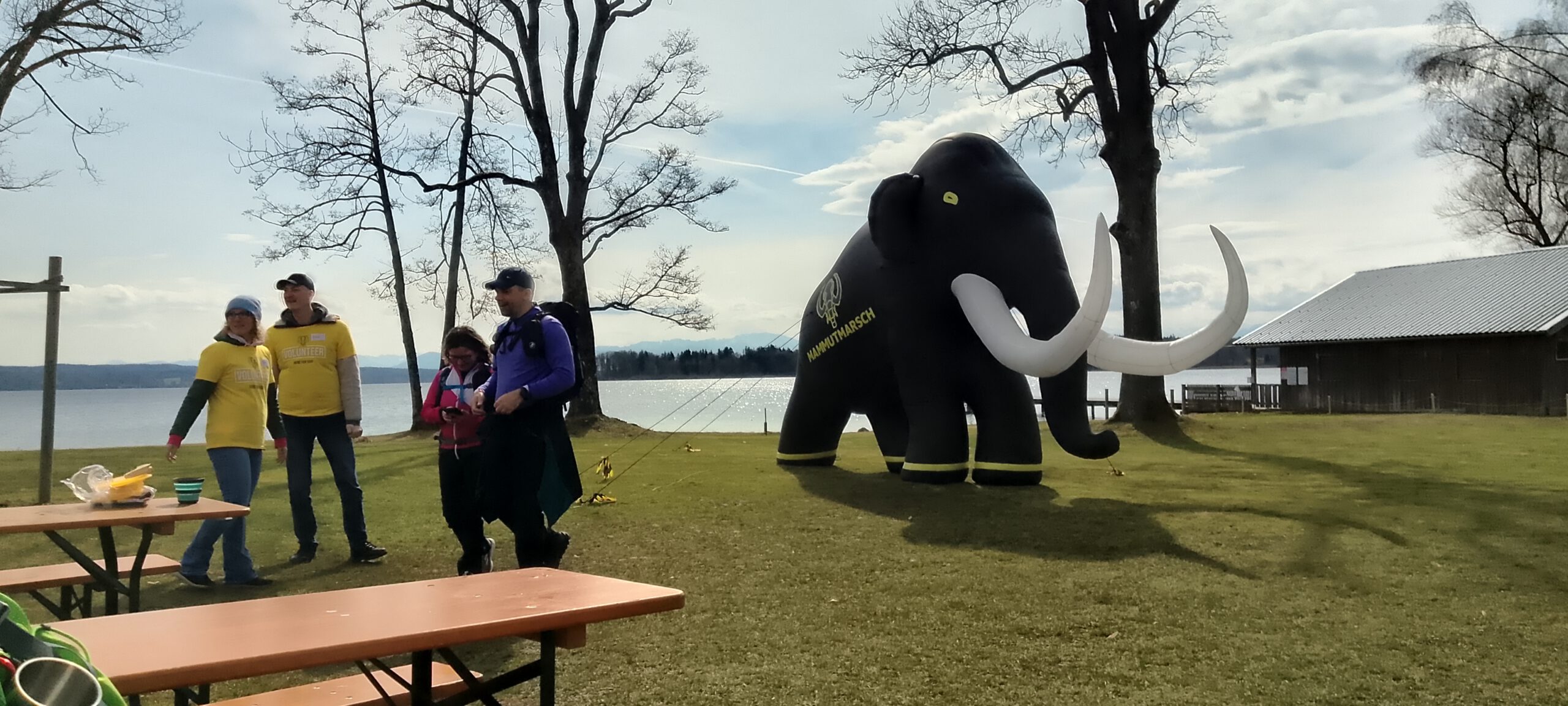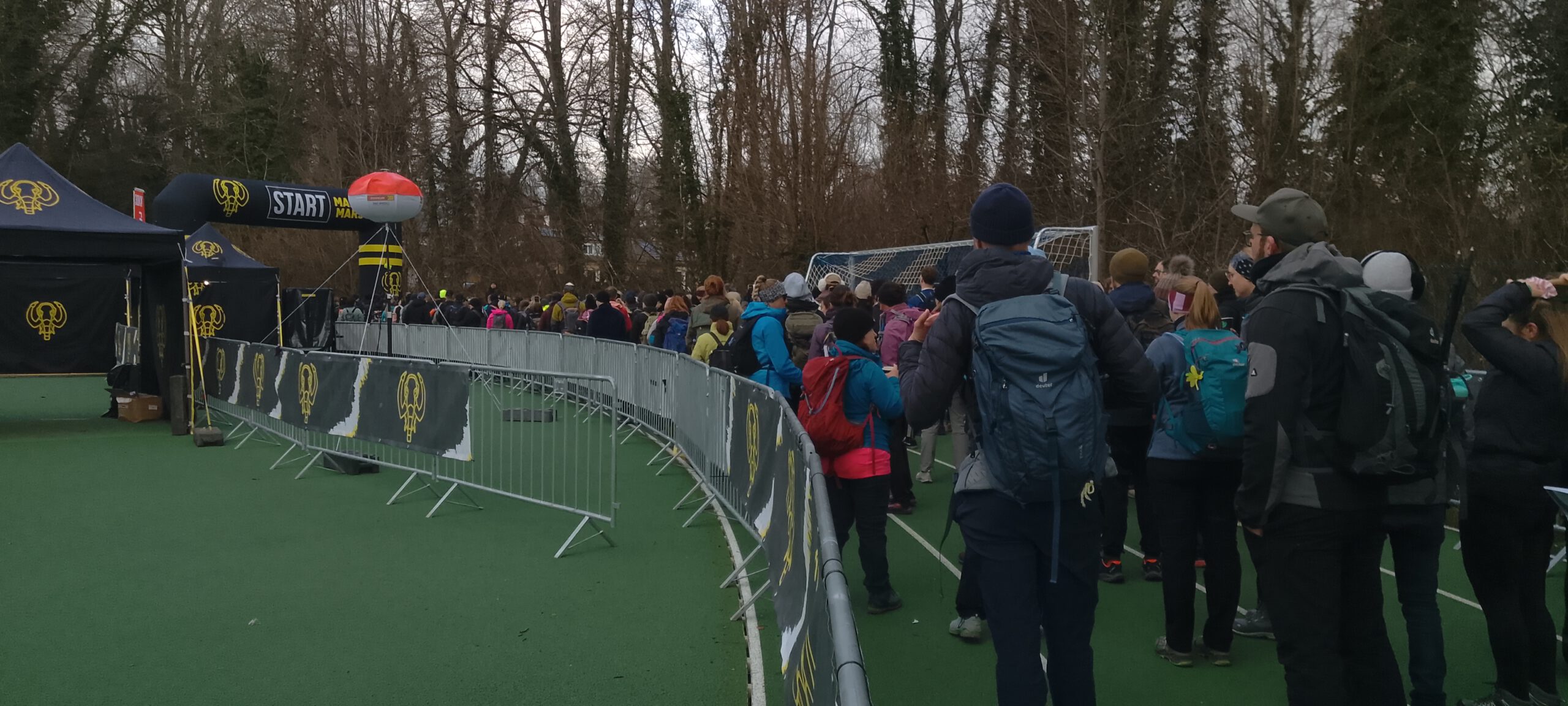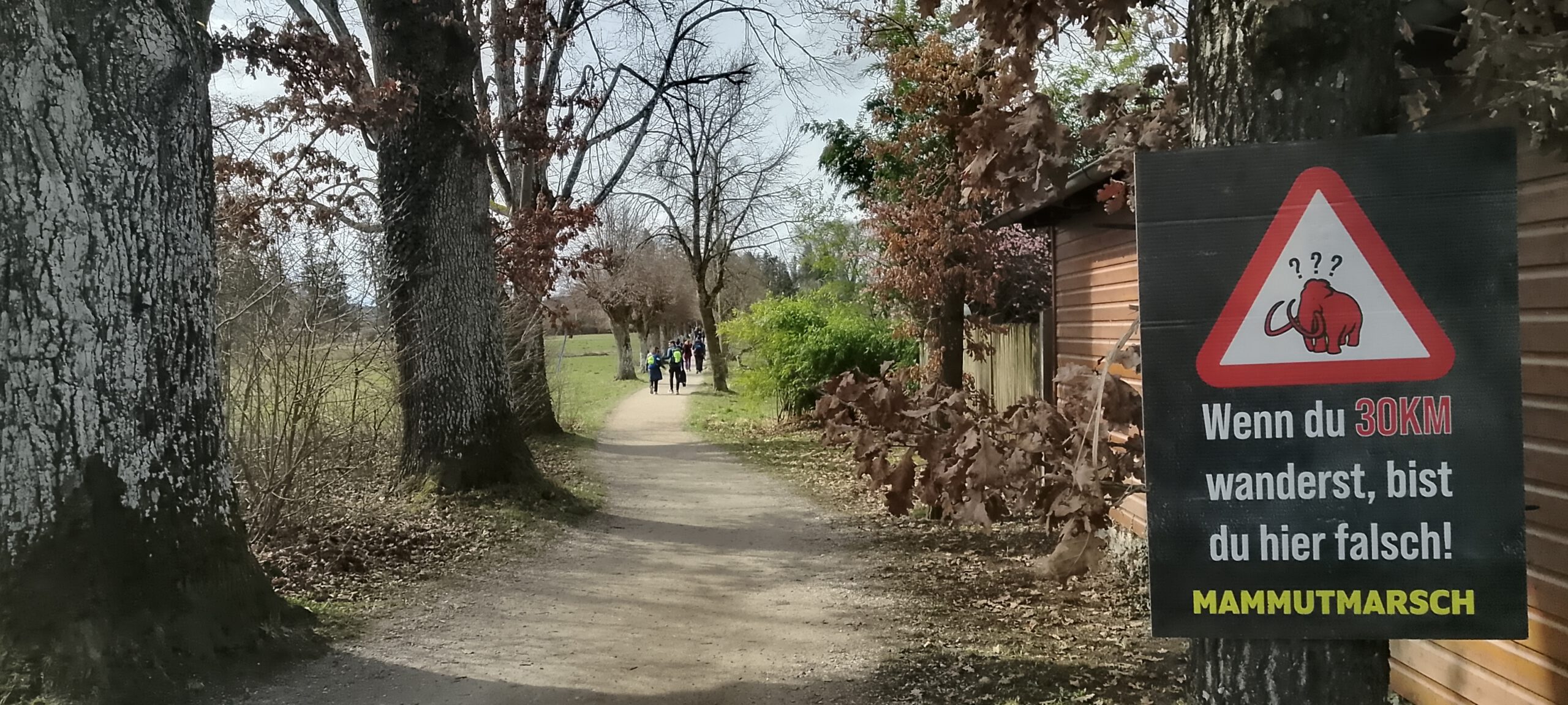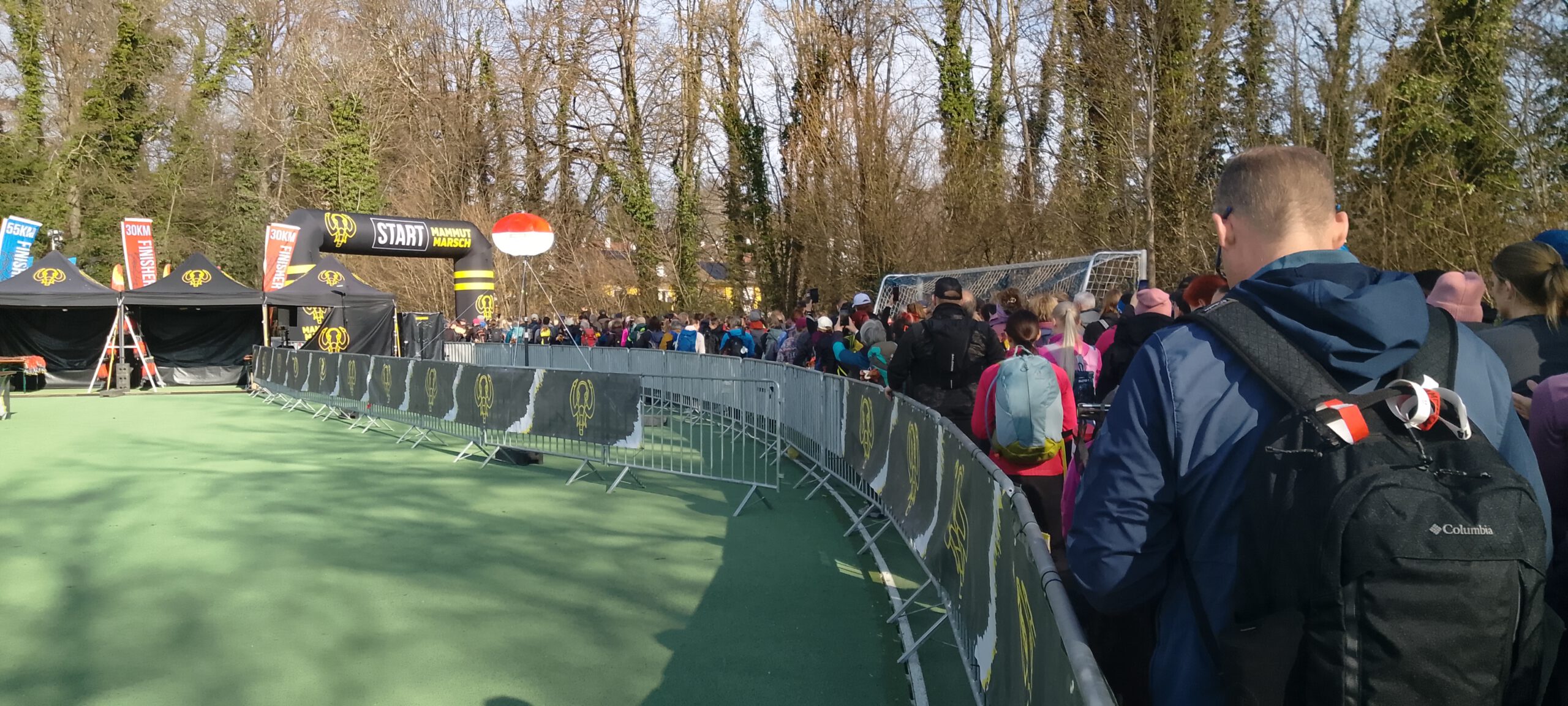 Das war aber kein Problem, ich hab einfach die nächste Startgruppe um 09:30 Uhr genommen. Nur ein paar Minuten im Startkanal, dann ging es auch schon los. Außer mir waren da aber nur noch Wanderer der 30-Kilometer-Strecke, den ich hatte eh schon die letzte Startgruppe der 55er gebucht. Der Start war übrigens im Buchheim-Stadion, benannt nach einem ehemaligen Bürgermeister, in Feldafing. München wurde nicht tangiert, daher hätte es eigentlich Mamutmarsch Feldafing heißen müssen.