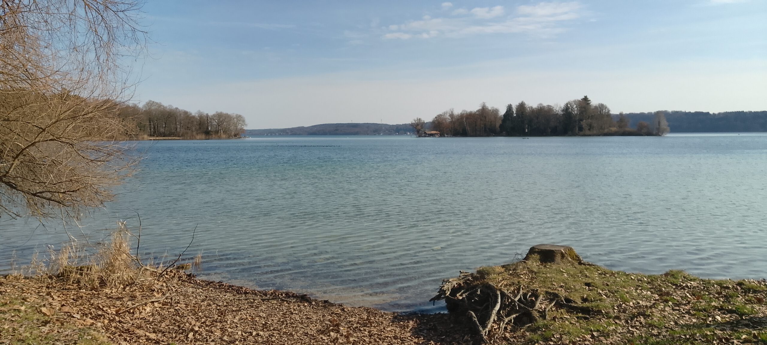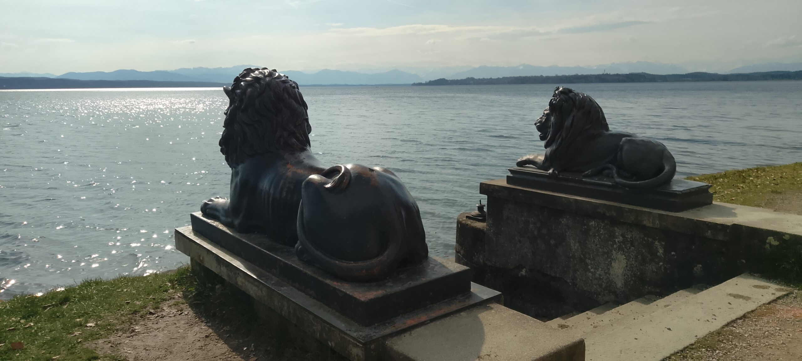 Vom Start ging es direkt zum Starnberger See und dann am See entlang nach Süden. Es war schönes Wetter, am Horizont im Nebel irgendwelche Berge. Der Starnberger See, der bis 1962 Würmsee hieß, wird durch zahlreiche Bäche und Quellen gespeist. Der Abfluss ganz im Norden ist die Würm, die dann in die Amper fliesst. Die einzige Insel im See ist die Roseninsel. Die Parkanlage wurde von Lenné gestaltet, die Villa Casino von Kreuter und eine Glassäule mit Mädchen nach Berges.