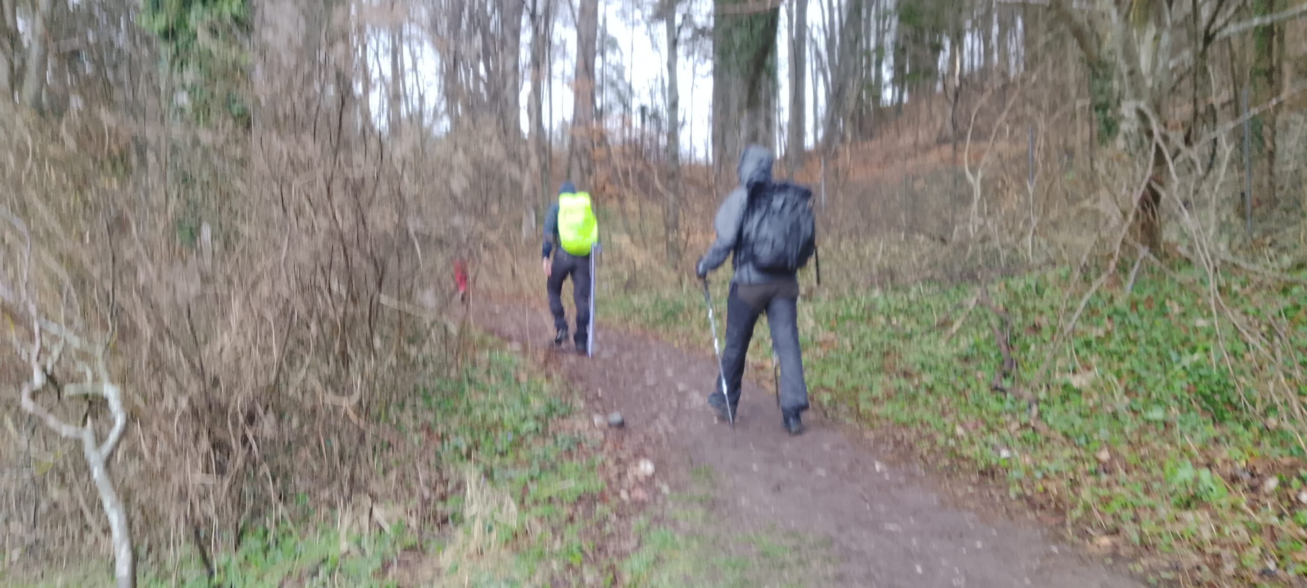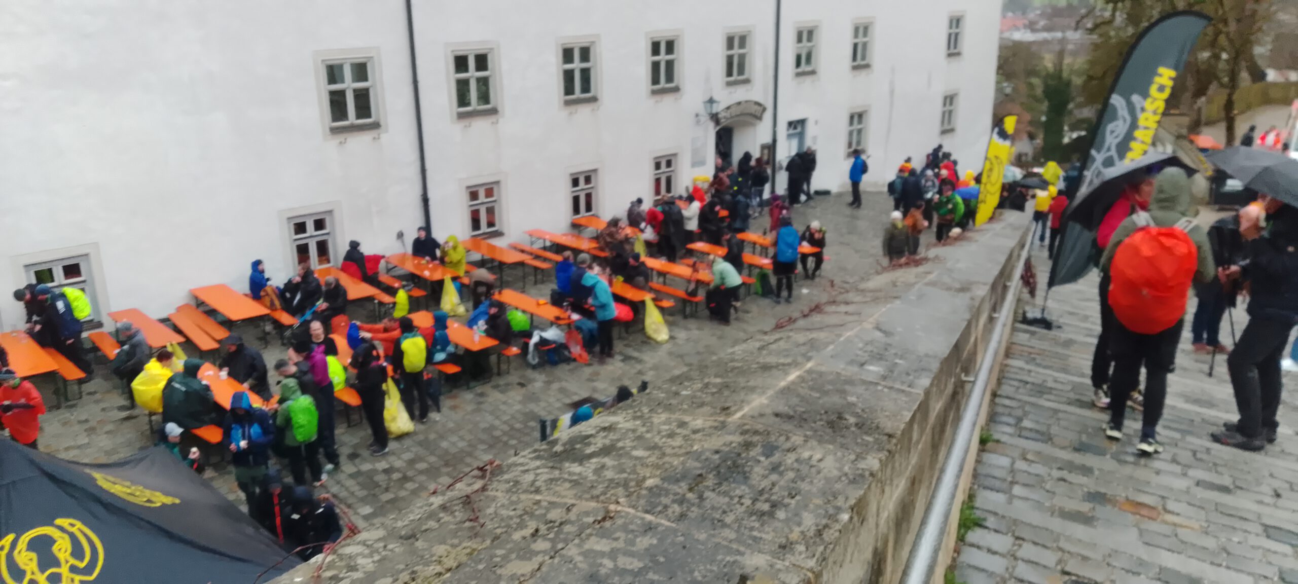 Also die Regenjacke angezogen. Dann ging es mit Starkregen von links vorn weiter und der Regenschirm wurde auch noch aufgespannt. Ich freute mich richtig, auf den zweiten VP, der bei Kilometer 21 kommen sollte und träumte von Kaffee. Leider kam da kein VP, sondern nur ein paar Toilettenhäuschen. Irgendwo unter einer Eisenbahnbrücke, bei Kilometer 24, machte ich eine kleine Mini-Pause und fragte eine Mitwanderin.