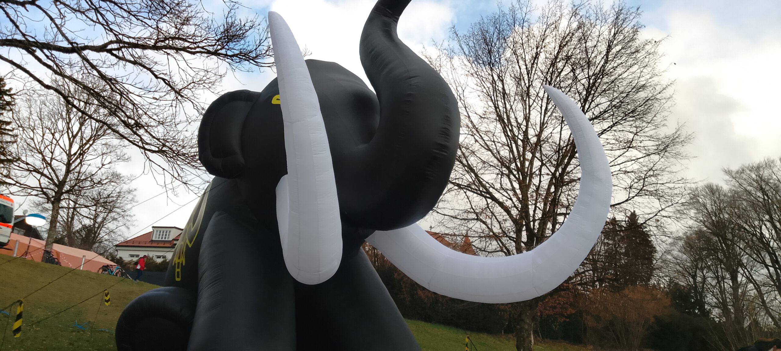 Nach VP 4 auch eine völlig unterkühlte Wanderin in der Rettungsdecke im Krankenwagen. Mir war an den Händen kalt und ich habe ab und zu die Jackenärmel über die Hände gezogen. Wenn man in Bewegung bleibt, heizt der Körper aber auch genug. Die letzten Meter ging es vom Starnberger See zurück zum Buchheim-Stadion: bergauf mit zwei Treppen. Inwischen gab es Eisregen. Die mit Schlamm bespritzten Hosen wurden aber nicht mehr sauber.